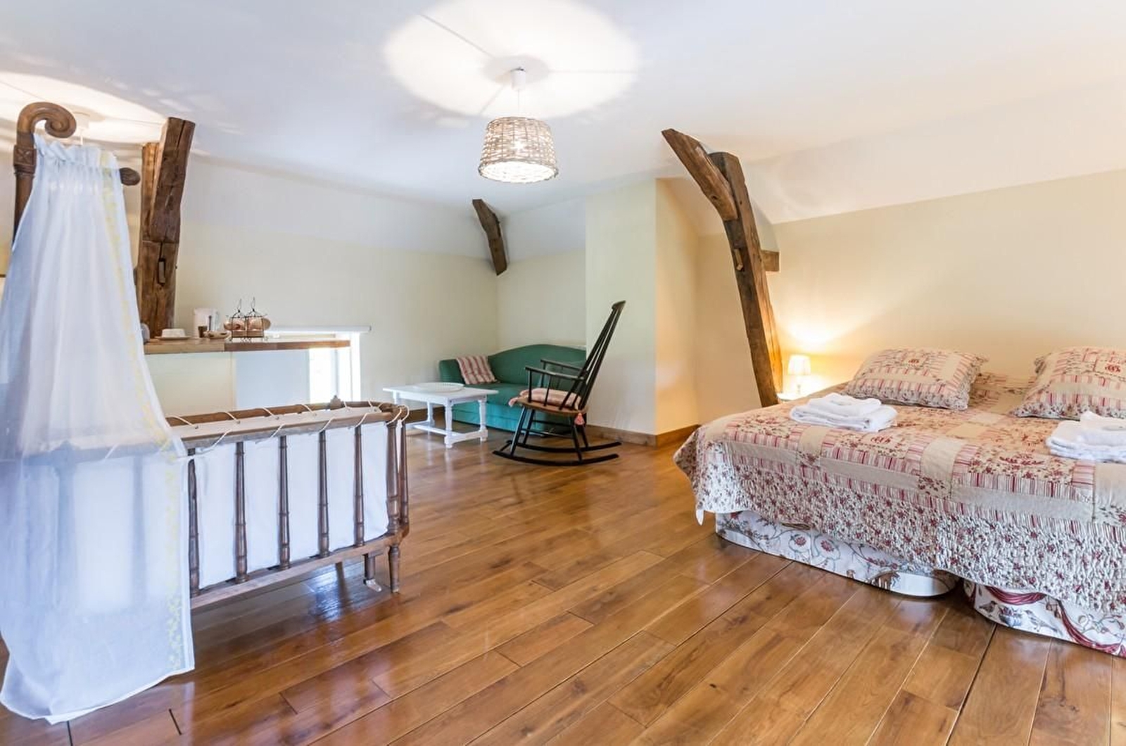 La Soue est une dépendance aménagée à l'entrée de la cour. Elle se compose d'une chambre (lit 140x200), une salle d'eau avec WC, un espace salon avec kitchenette et canapé convertible pour 2 personnes.