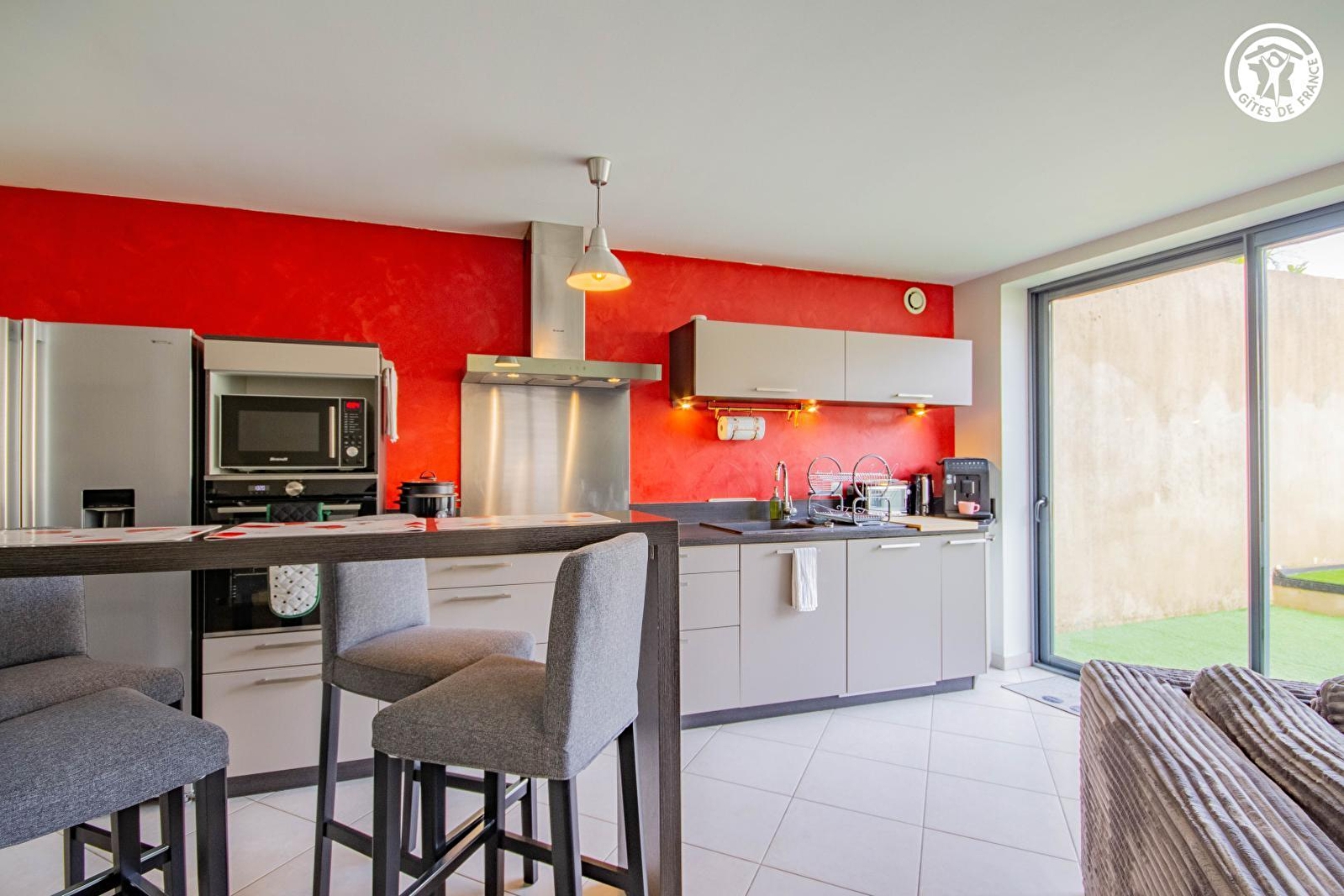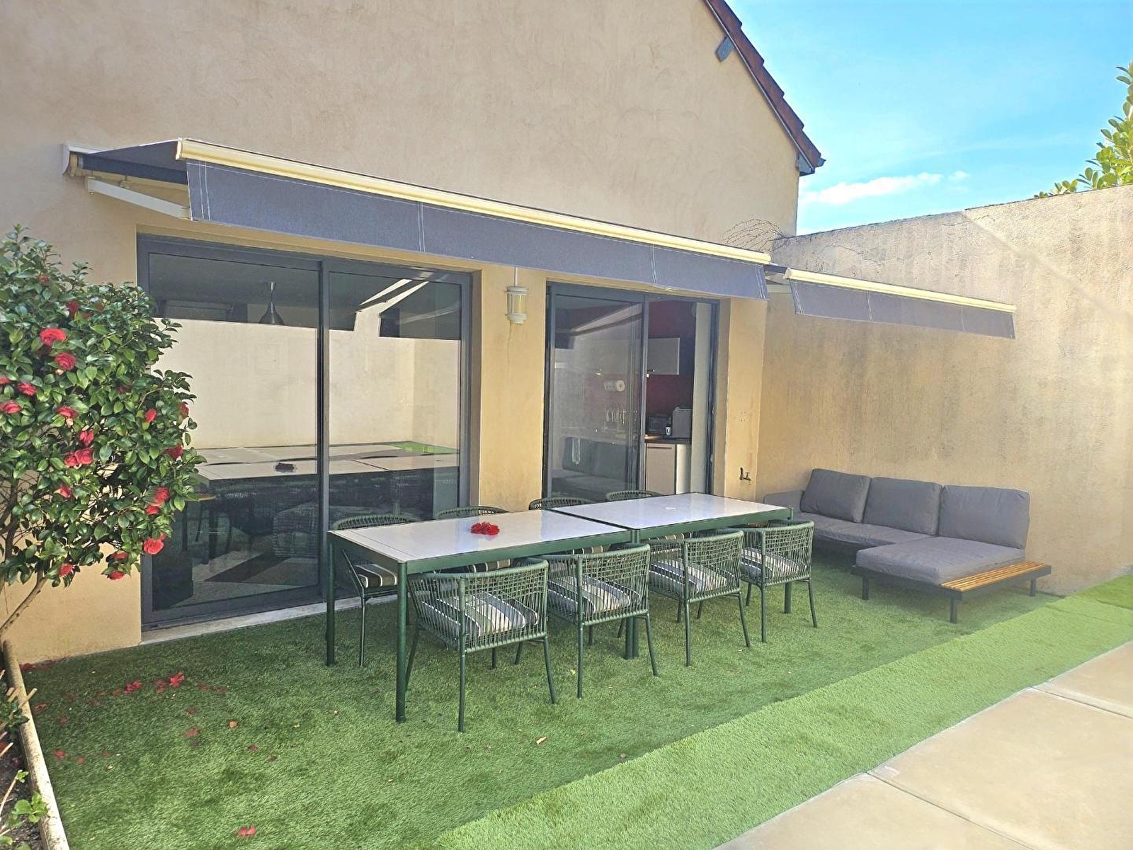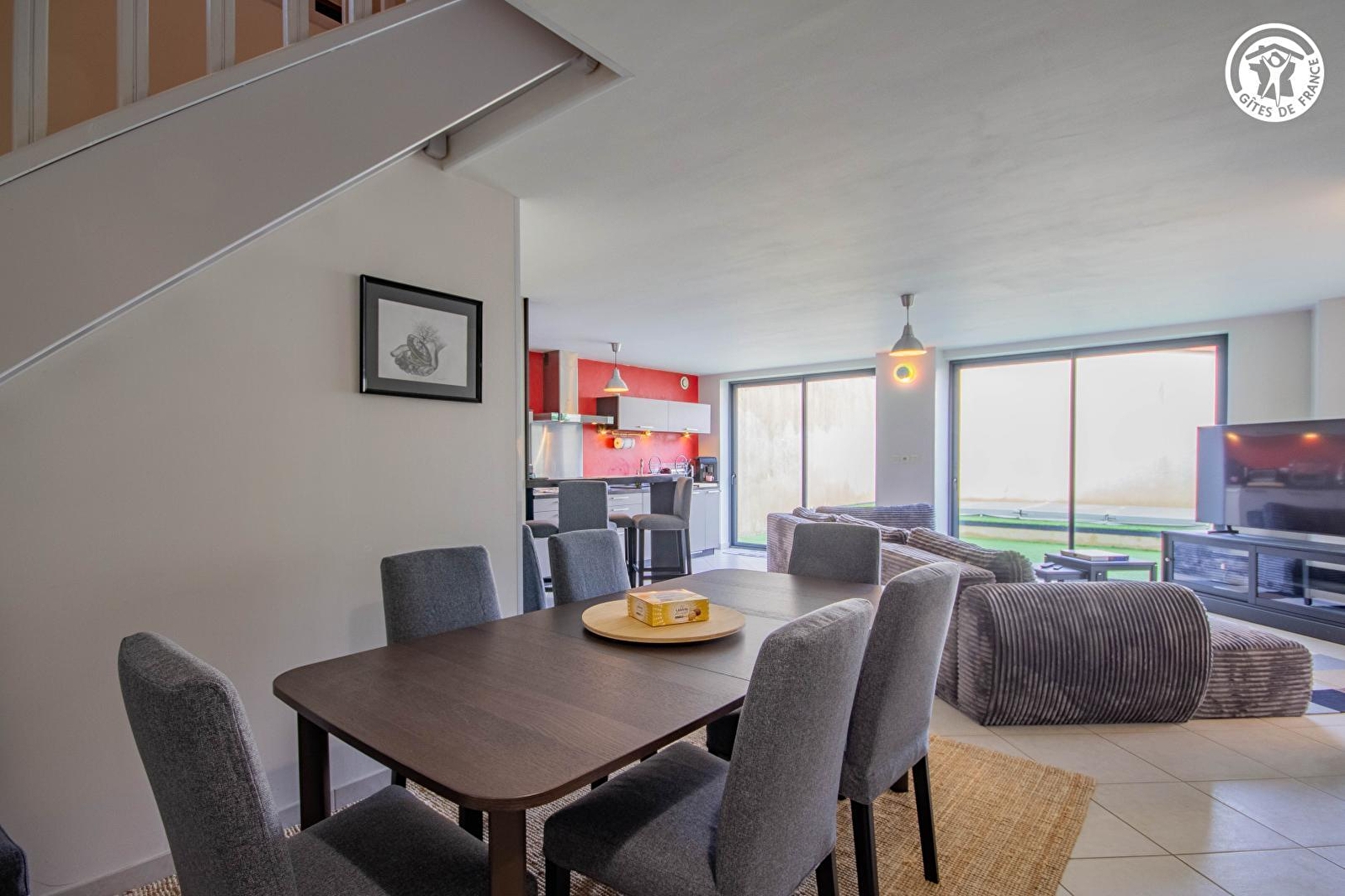 Composition : Maison mitoyenne. Wifi (fibre). Chauffage central gaz. Rdc : séjour-cuisine-salon (TV Canal+/Netflix/Prime), 1 chambre (lit 2 p. 160x200cm) avec salle d'eau privée (douche), Wc indépendant, buanderie. 1er étage : 3 chambres (chacune avec 1 lit 2 p. 160x200cm), salon TV bis sur mezzanine palière, salle d'eau (douche), Wc indépendant, bureau (écran + clavier + souris). Cour-terrasse close (50m²) + garage (1 place / local vélos) + parking privatifs. Mini supermarché à 300m. Toutes commodités sur place.