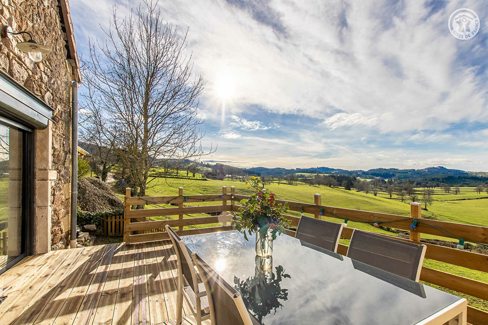 Jean-Paul & Patricia vous accueillent au sein d’une ravissante authentique dépendance de caractère du XIXe soigneusement restaurée avec goût, sise sur un ancien domaine agricole composé de divers bâtiments tous parfaitement réhabilités, aux confins d’un mini hameau rural. Cadre & site littéralement enchanteurs, blotti à flanc de coteau sud-ouest exposé, dominant en "balcon" un sublime plateau de bocage, avec en guise de proches voisines privilégiées les célèbres paisibles vaches charolaises. Somptueux panorama & paysages. Calme & tranquillité totale, lové en lisière immédiate de prairies & forêts, au creux d’un magnifique cirque champêtre vallonné, niché sous les crêtes boisées des collines alentour, magnifique écrin préservé de verdure & nature adossé sur les flancs du mont Saint-Cyr, point culminant de Bourgogne du sud (belvédère unique offrant une exceptionnelle vue panoramique jusqu’au Mont-Blanc par temps clair !). Gîte de très bon confort d’architecture "compacte" moderne. Chaleureux cachet contemporain mixant influences nordiques & industrielles allié à une restauration soignée (poutres & murs en pierre d’origine), sublimée par la conservation d’un ancien four à pain traditionnel (visible en "vitrine" dans le gîte). Ambiance cocooning & cosy. Beaucoup de charme. Agréable large terrasse panoramique en balcon. Bonus magique, vous disposez d’un spa extérieur abrité ouvert sur un paysage de carte postale !