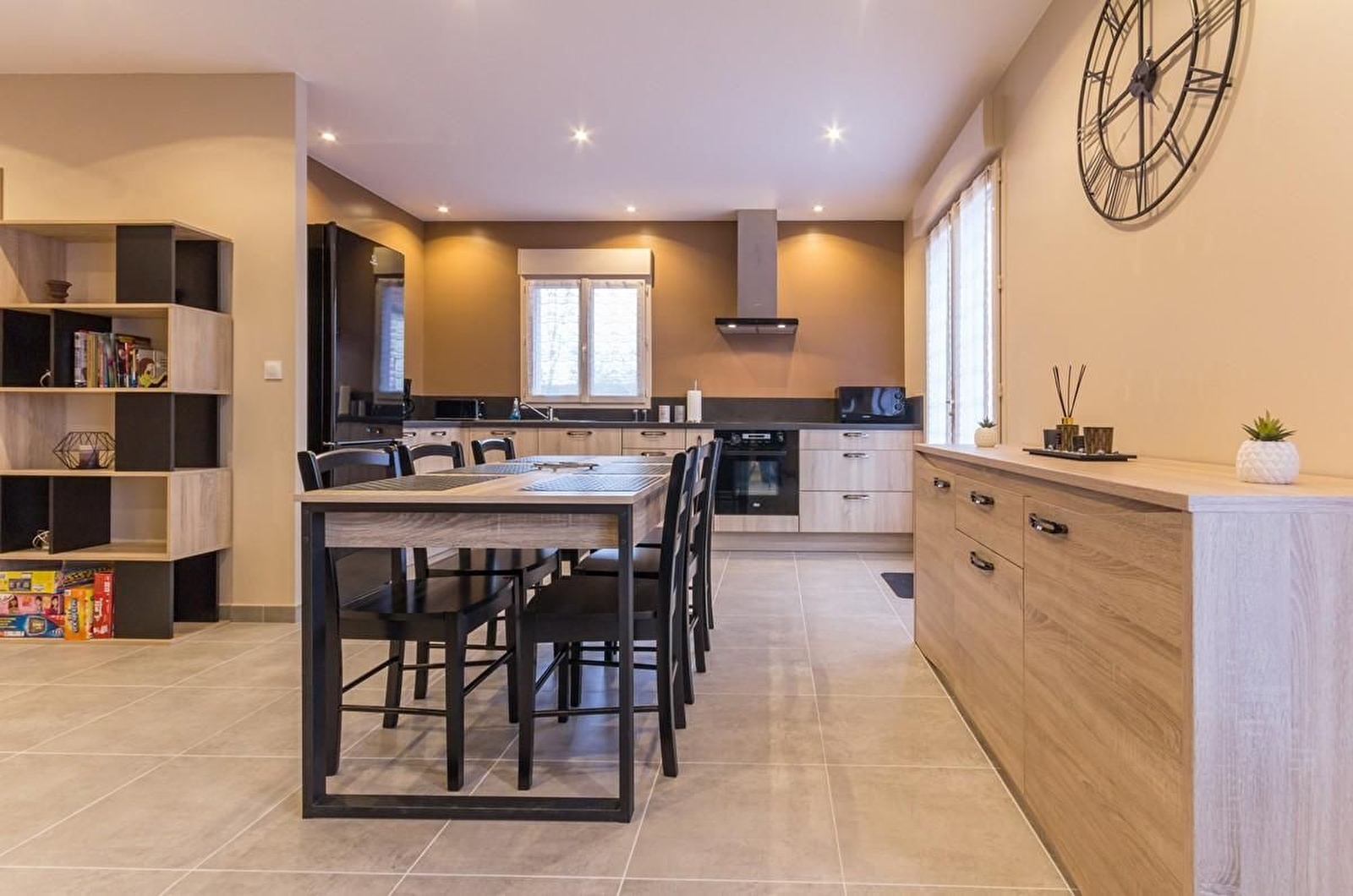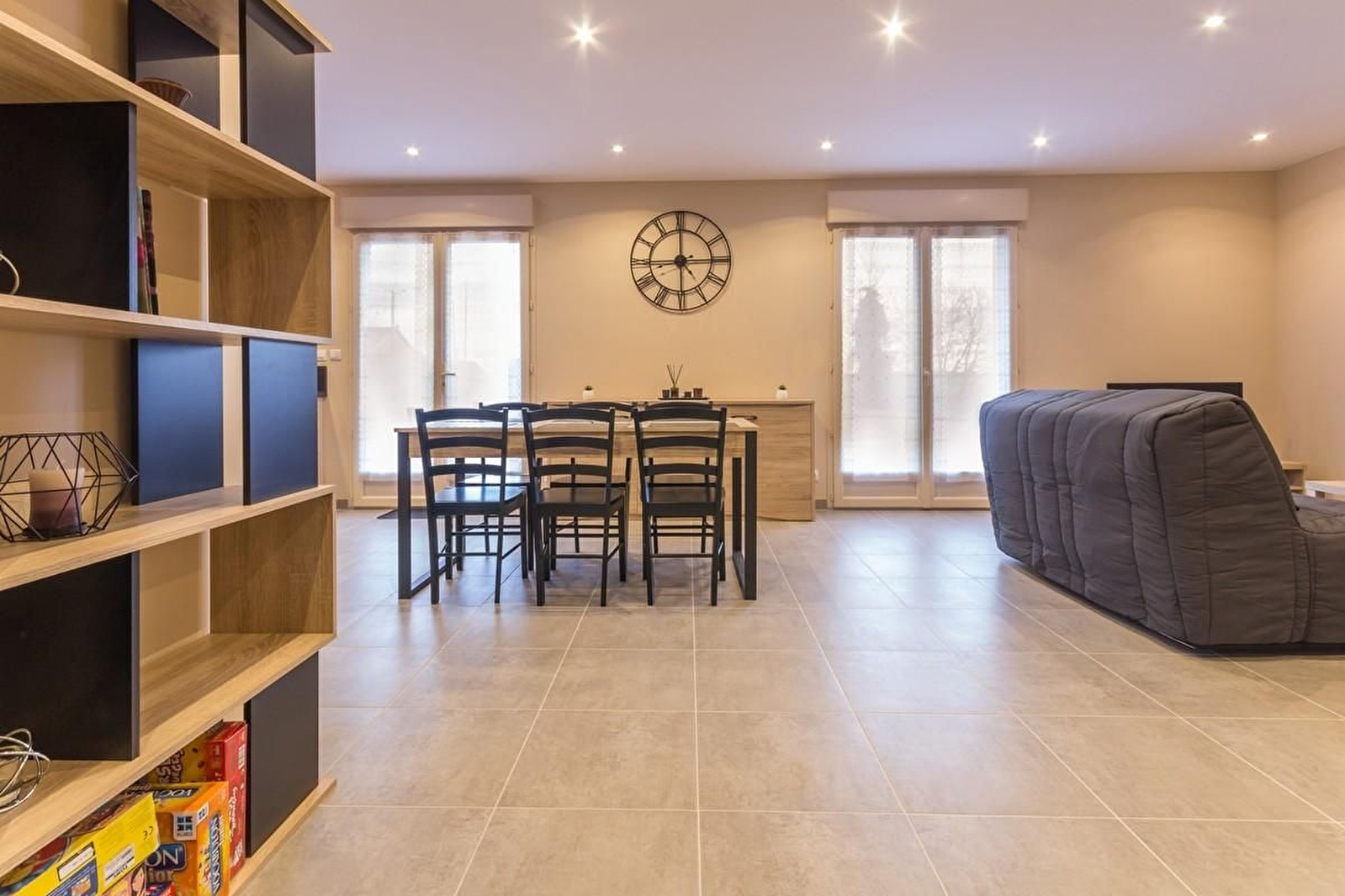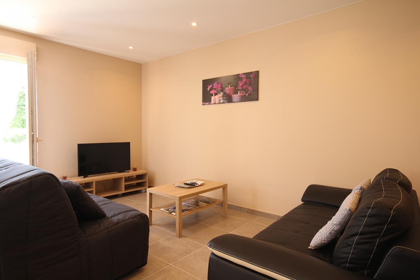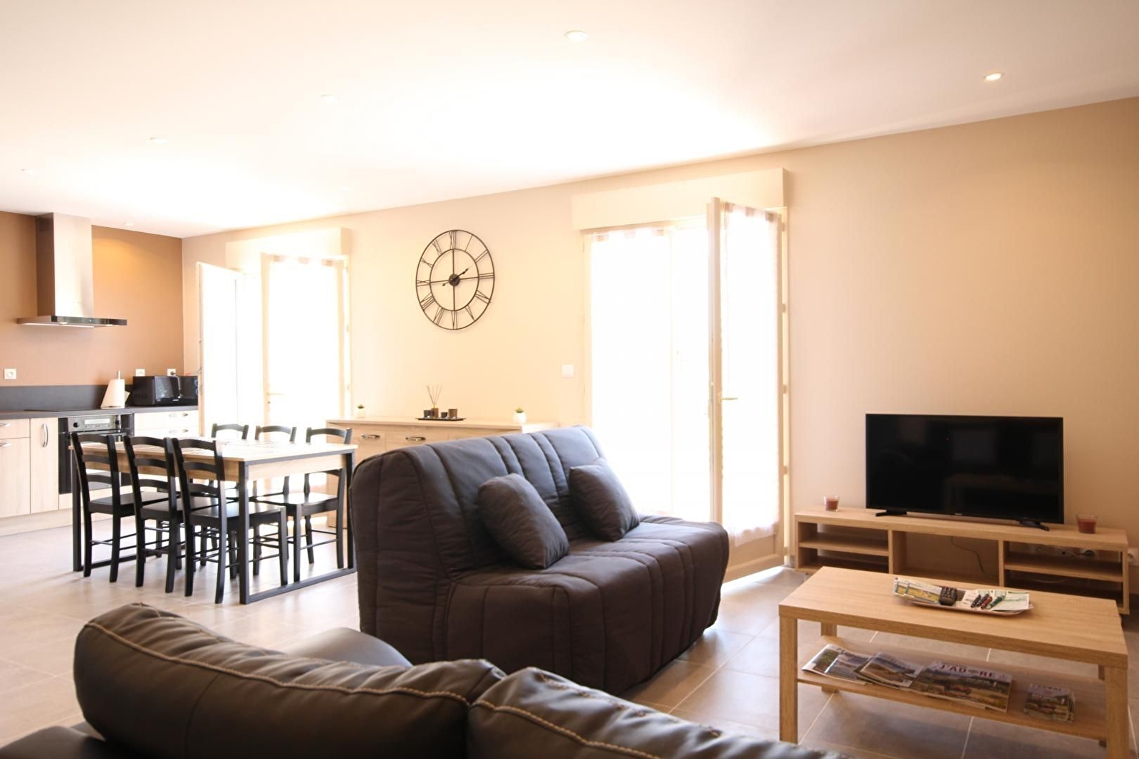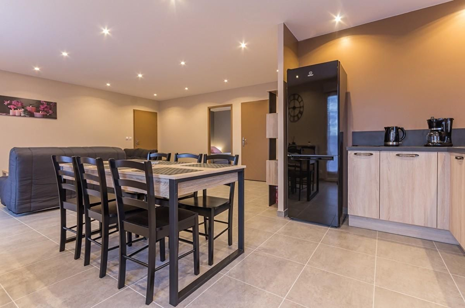 Grand séjour lumineux avec cuisine intégrée ouverte, salle à manger et salon avec TV écran plat, WIFI et canapé convertible (2 couchages d'appoint possibles en supplément).