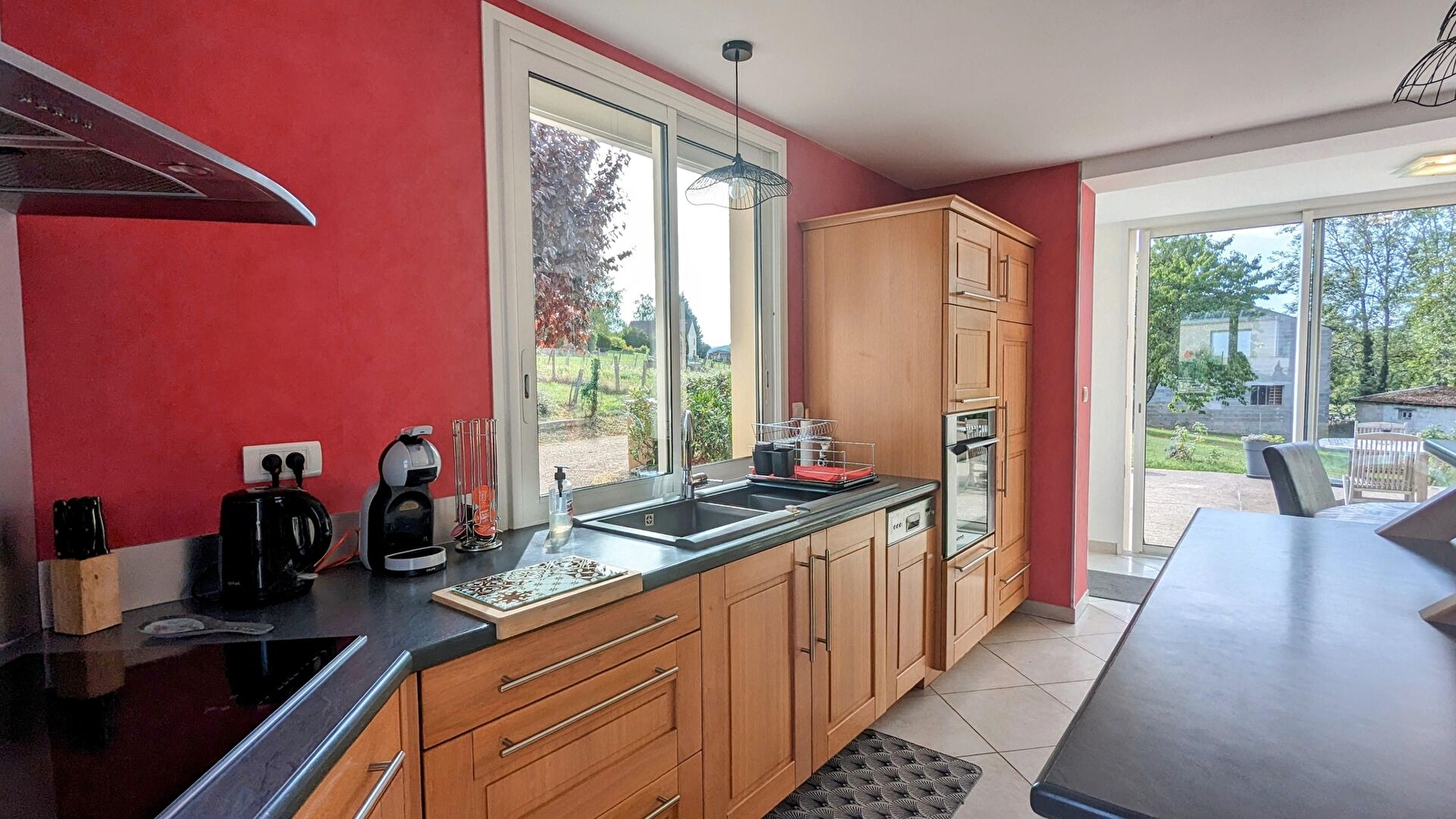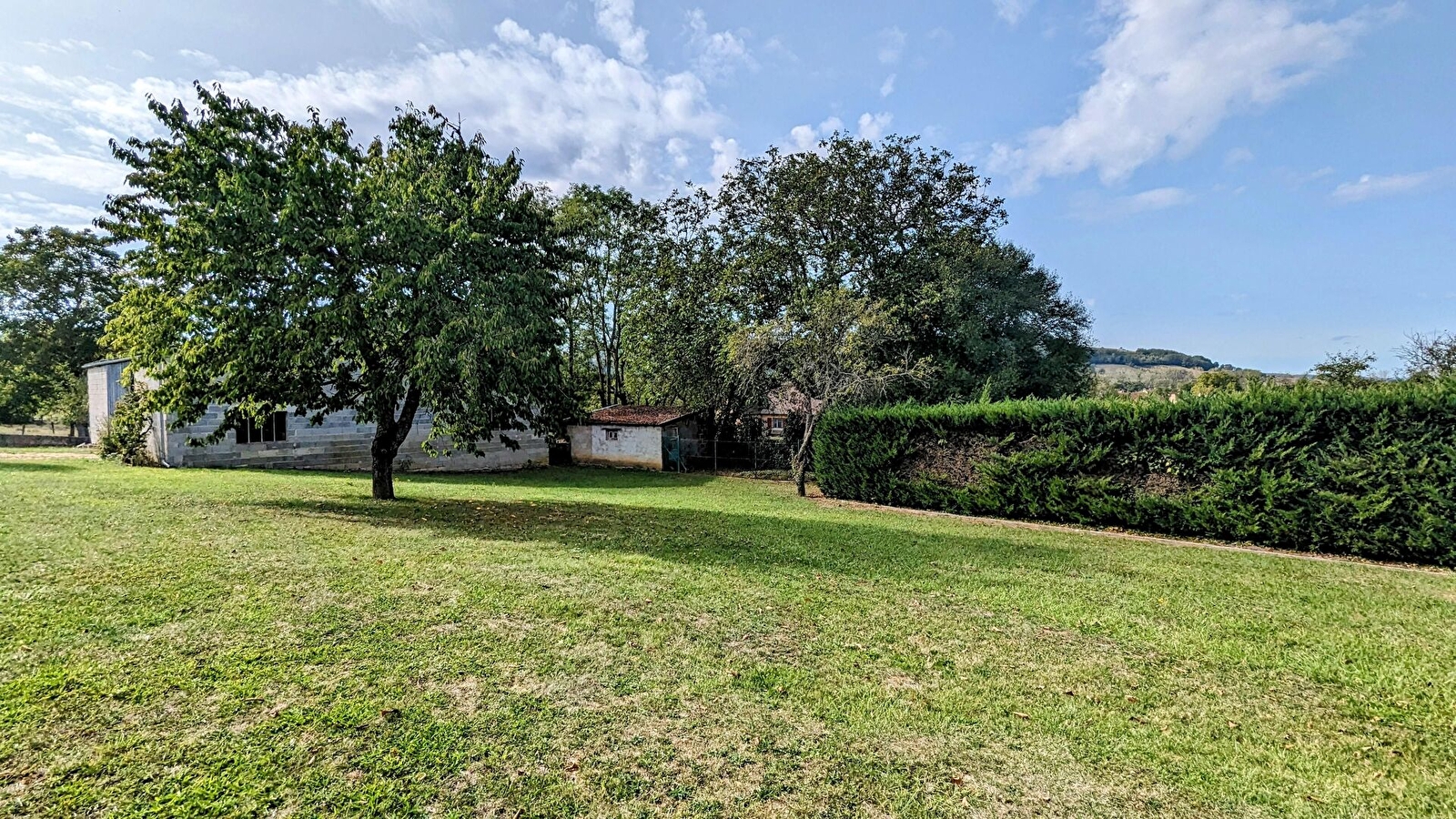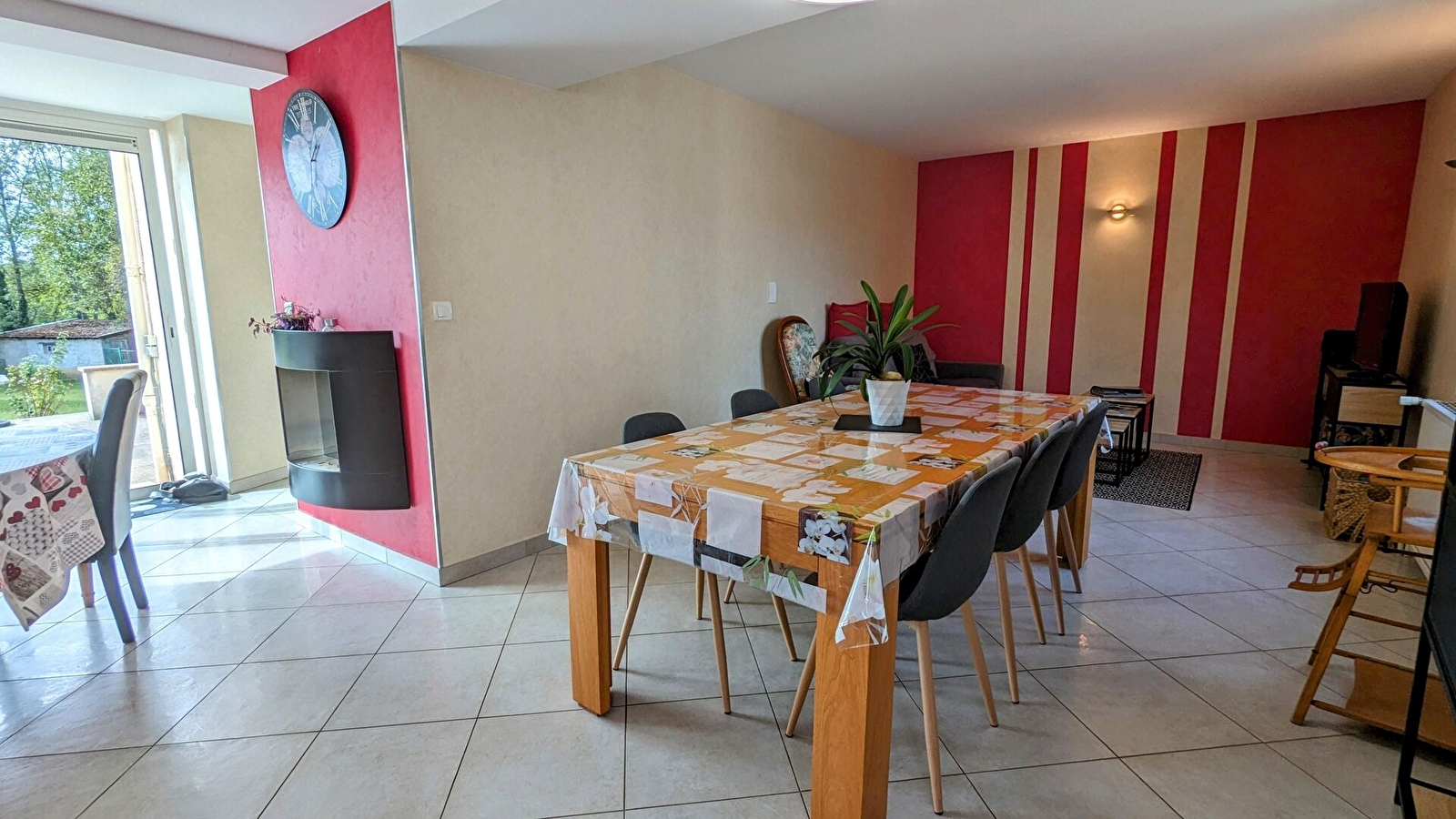 Grand jardin clos de 1000 m² environ, avec terrasse, salon de jardin, barbecue, balançoire.