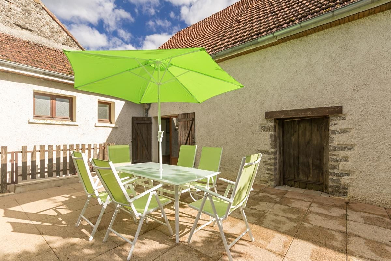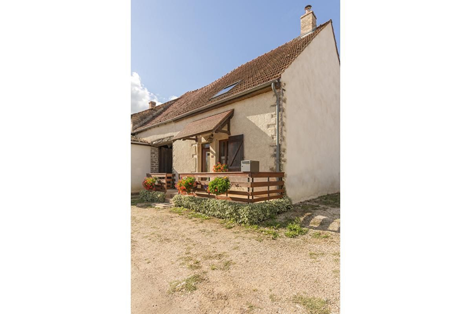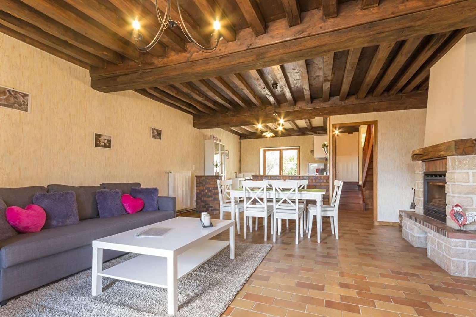 A proximité de la ferme des propriétaires, maison indépendante et mitoyenne avec grand jardin. Rez-de-chaussée surélevé : séjour avec salle à manger, salon et cuisine (plafonds à la française et cheminée insert). Salle de bains. WC séparé. A l'étage, 2 belles chambres avec parquet : une avec un lit 160 et l'autre avec 2 lits 90 jumelables et 2 lits 80 gigognes. Lit bébé et chaise-haute. Parking devant la maison et vaste jardin bien clos arboré derrière de 800 m². Chauffage au gaz. 2 animaux admis maximum.