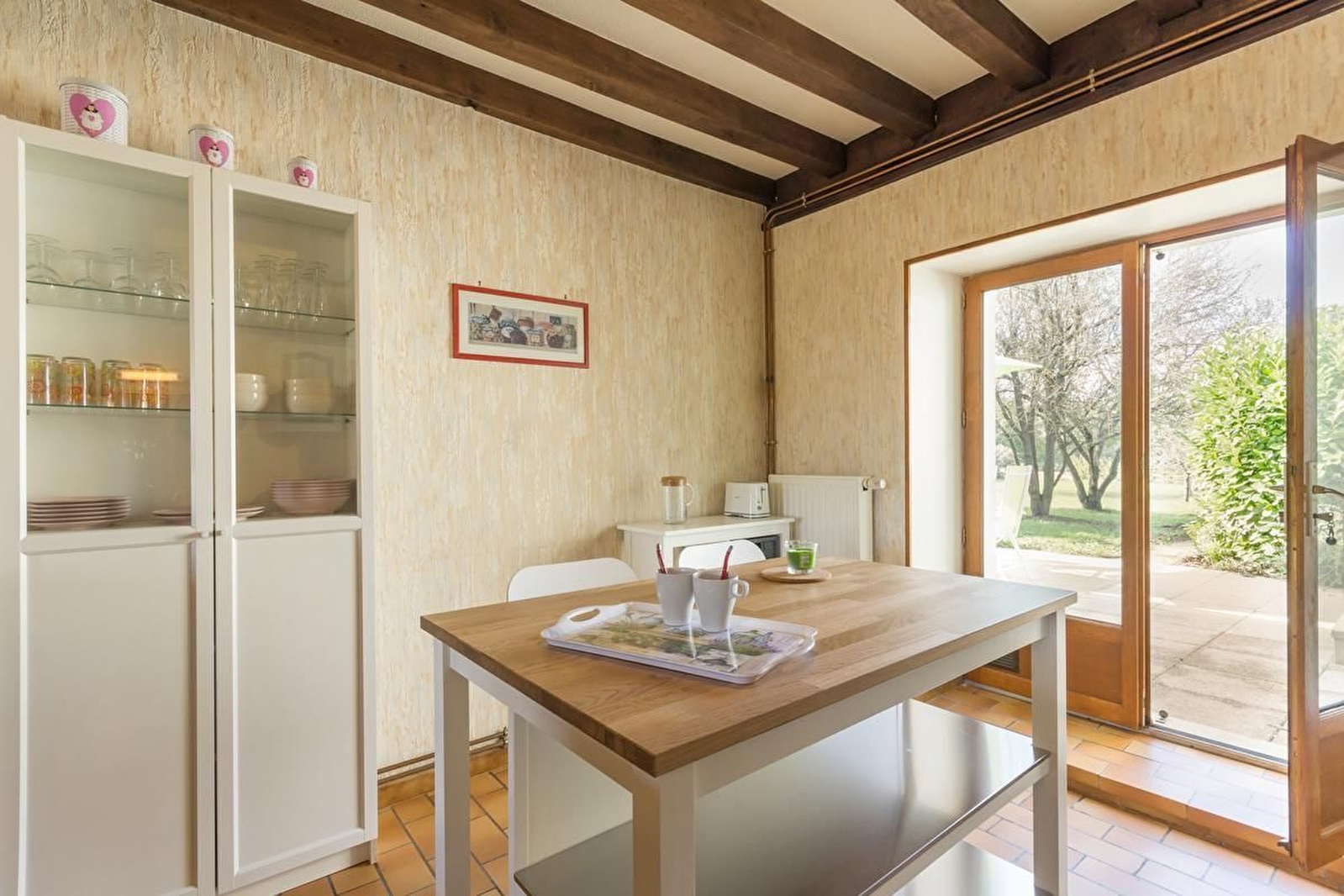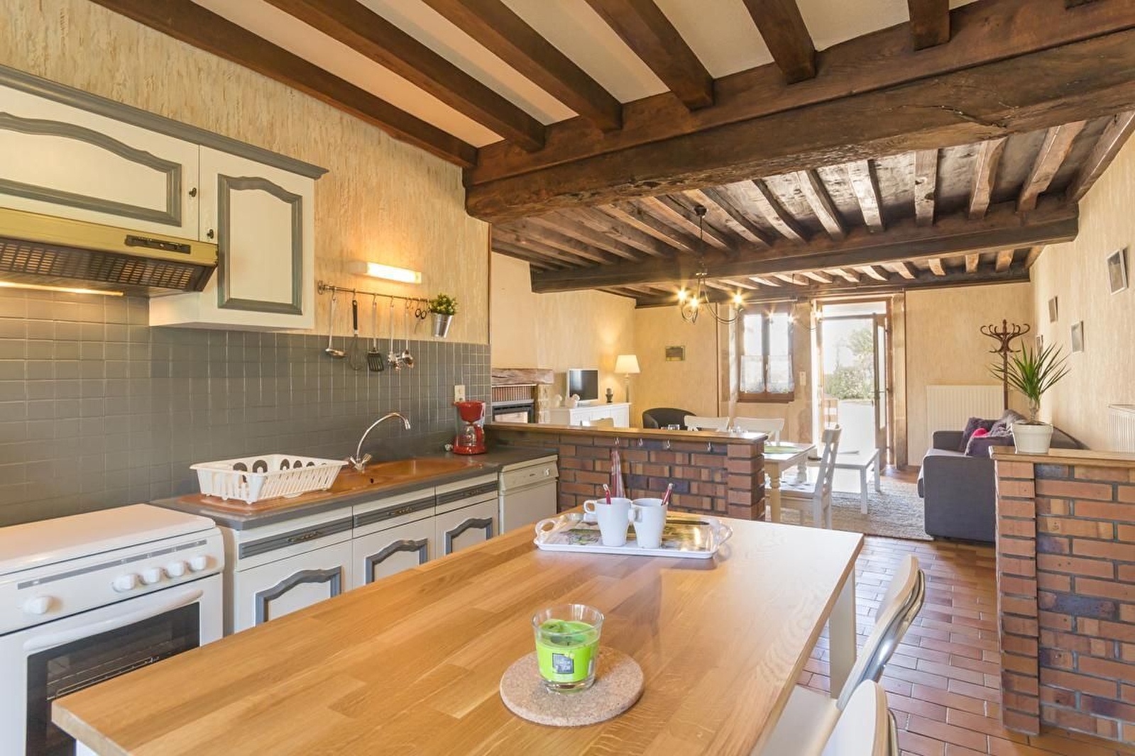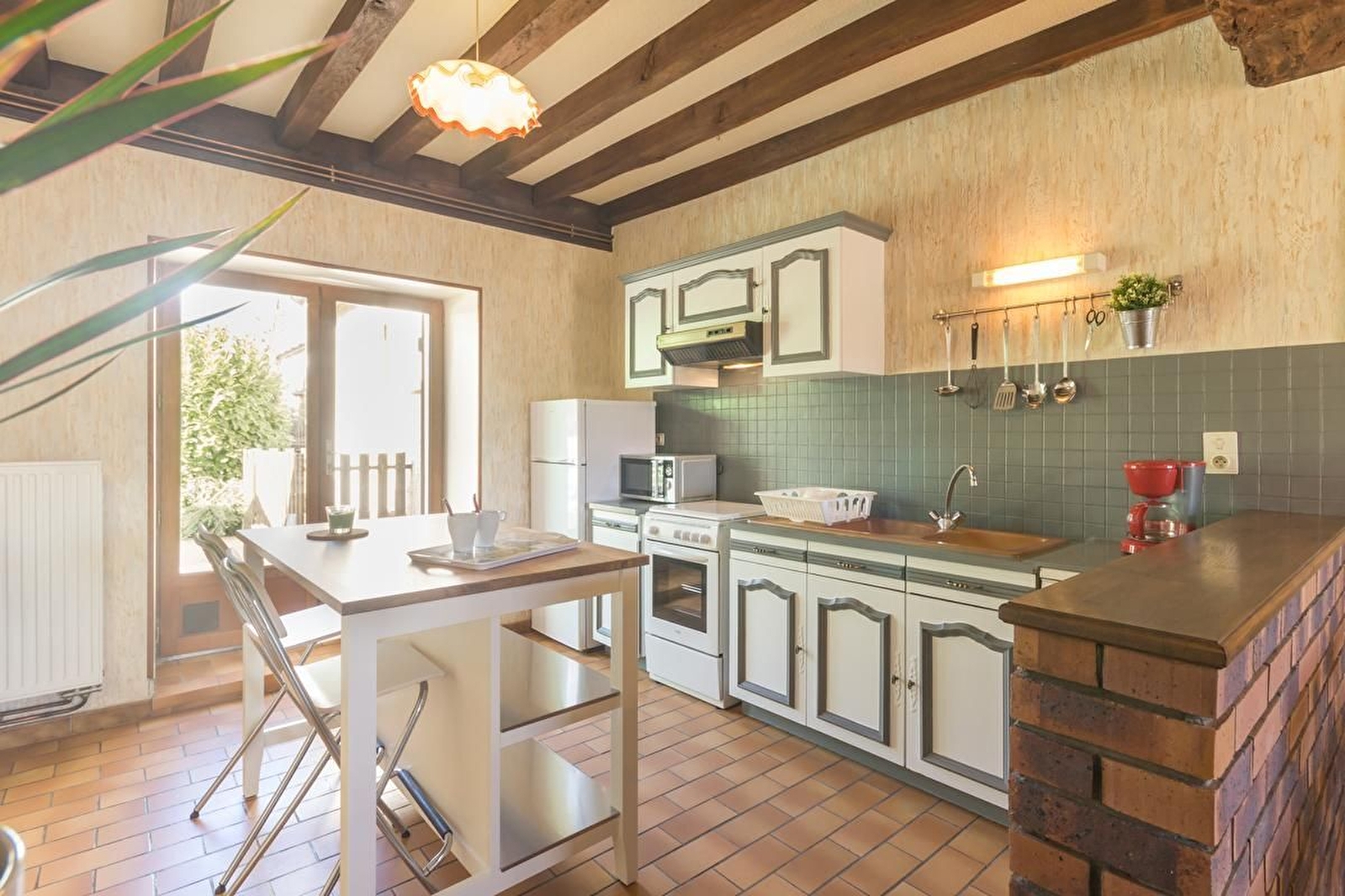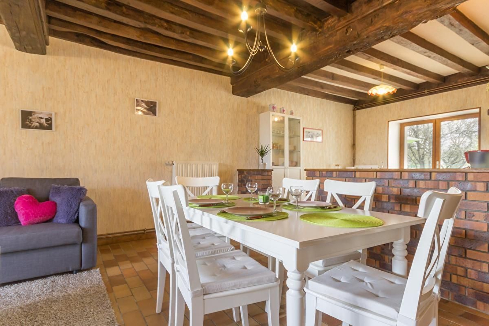 A proximité de la ferme des propriétaires, maison indépendante et mitoyenne avec grand jardin. Rez-de-chaussée surélevé : séjour avec salle à manger, salon et cuisine (plafonds à la française et cheminée insert). Salle de bains. WC séparé. A l'étage, 2 belles chambres avec parquet : une avec un lit 160 et l'autre avec 2 lits 90 jumelables et 2 lits 80 gigognes. Lit bébé et chaise haute. Parking devant la maison et vaste jardin bien clos arboré derrière de 800 m². Chauffage au gaz. 2 animaux admis maximum.