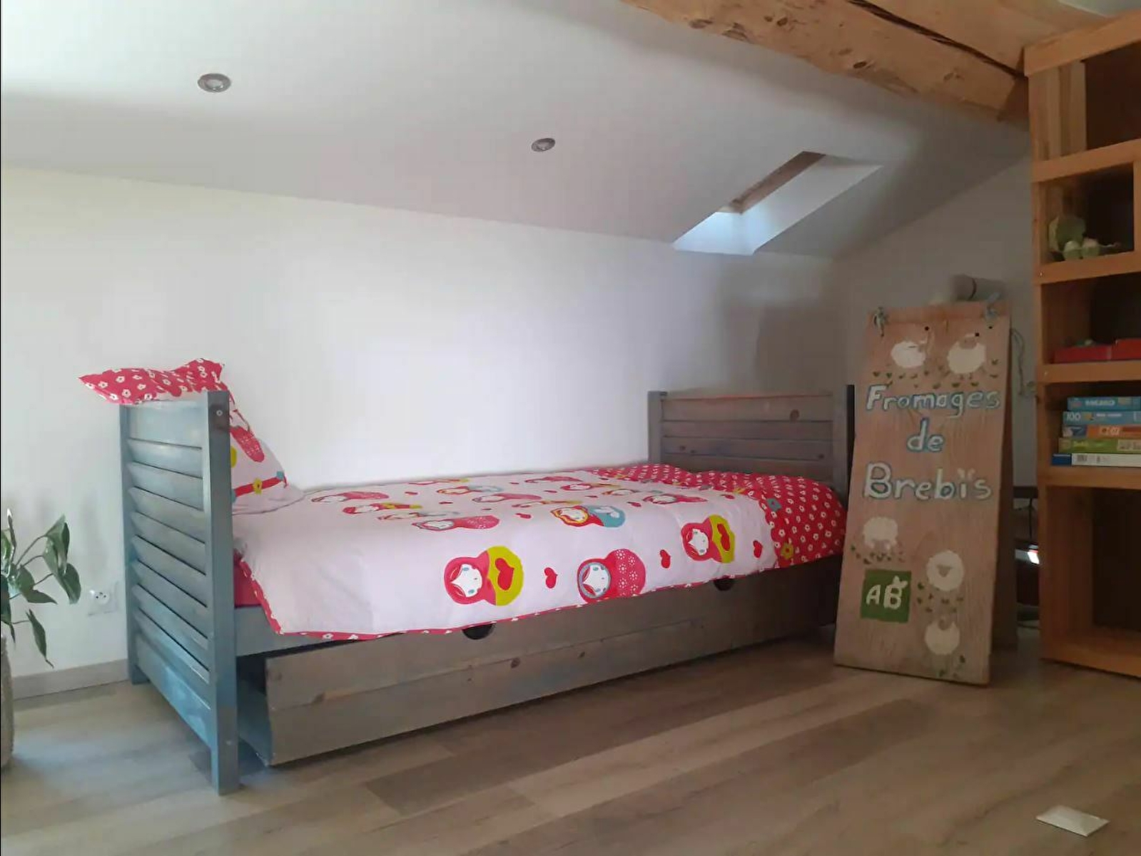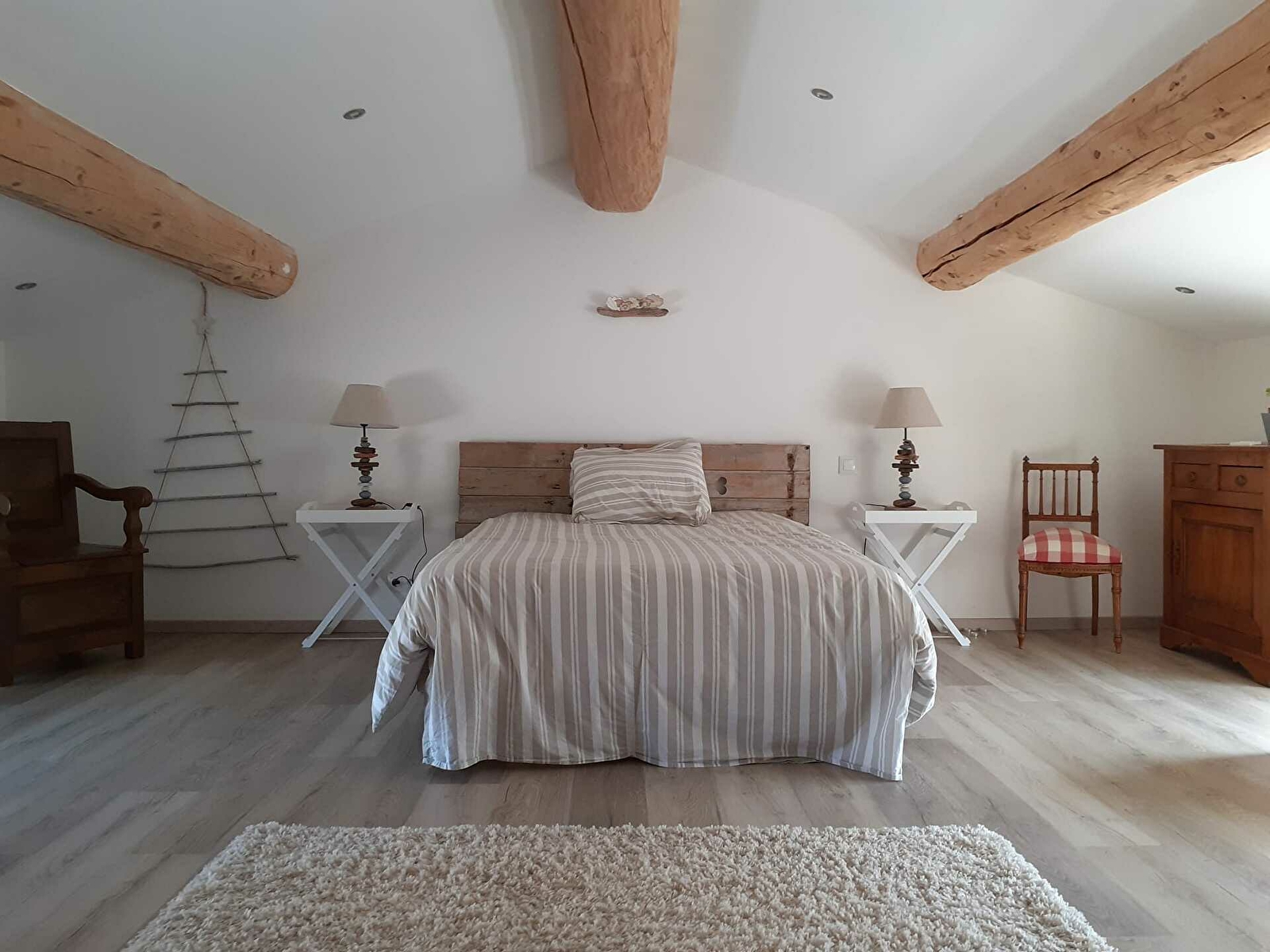A l'étage, une belle chambre, lumineuse avec de belles poutres apparentes vous offre un cocon douillet ! La chambre comprend un lit double et deux lits simples.