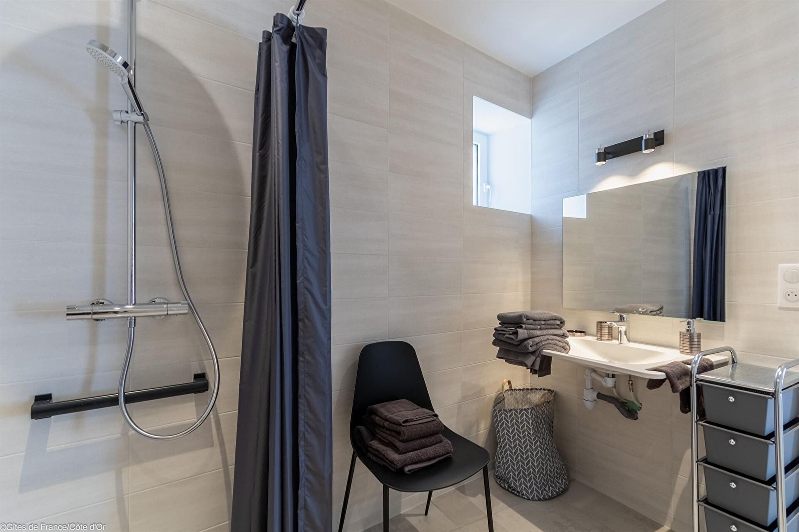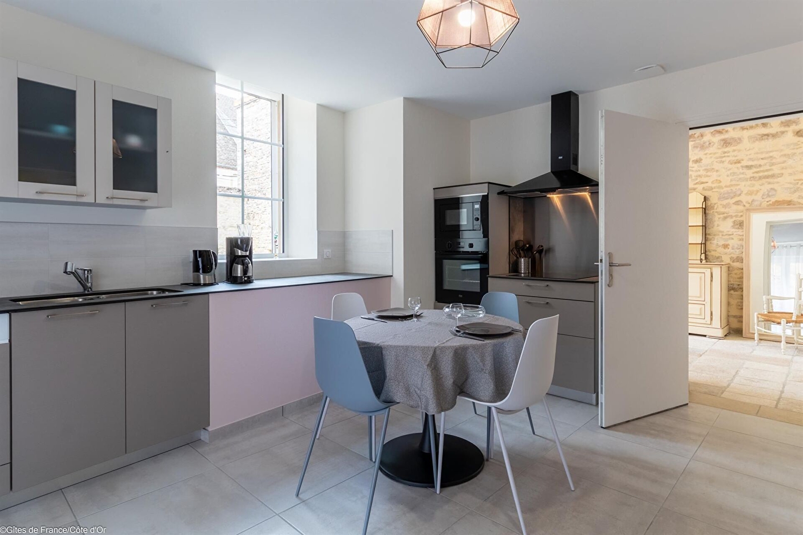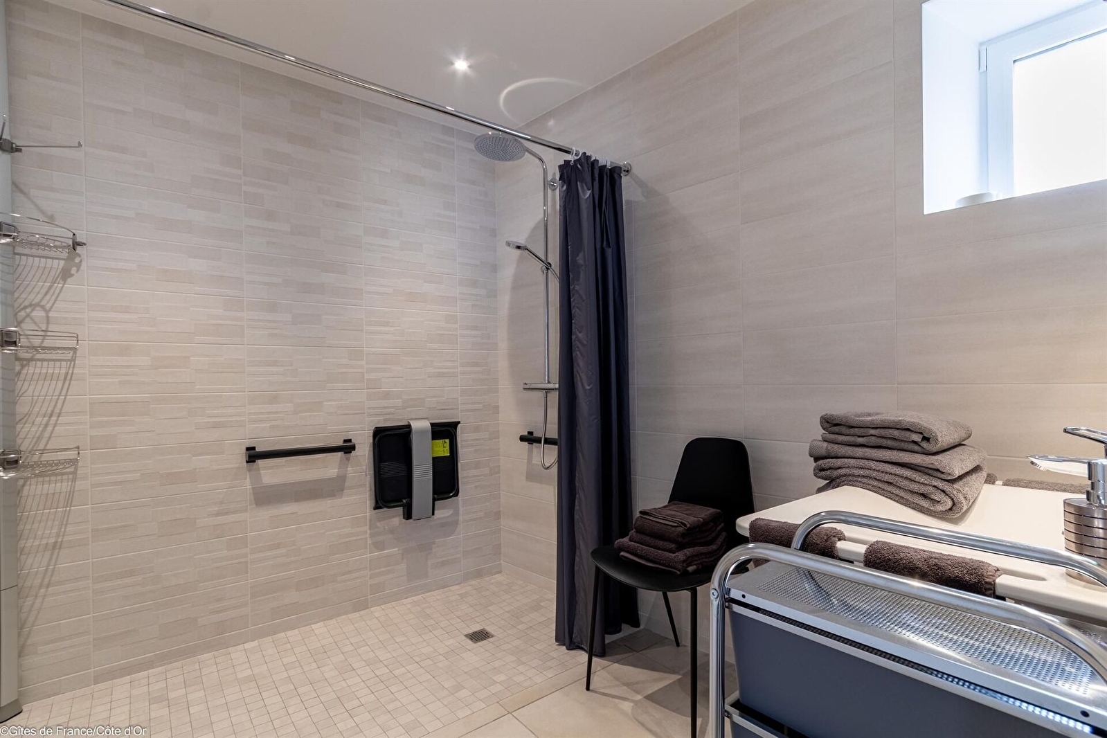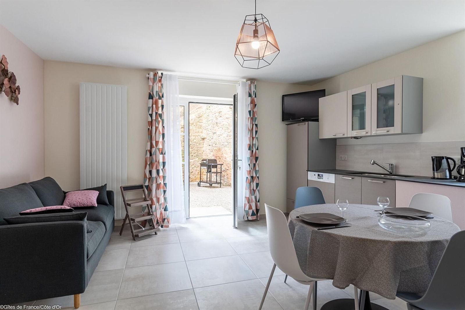 Entrée avec dalles de Bourgogne, séjour avec cuisine équipée et canapé convertible (lit 140), une chambre avec un lit 160, salle d'eau avec grande douche à l'italienne et WC indépendant. L'ensemble de l'hébergement est accessible aux personnes à mobilité réduite accompagnées.