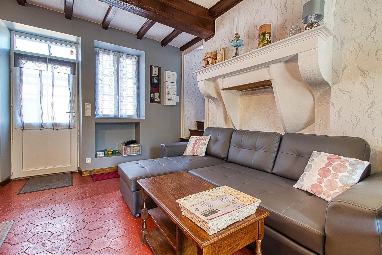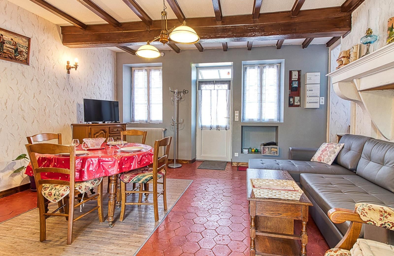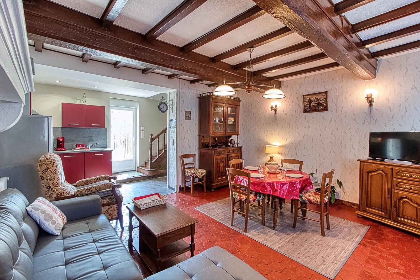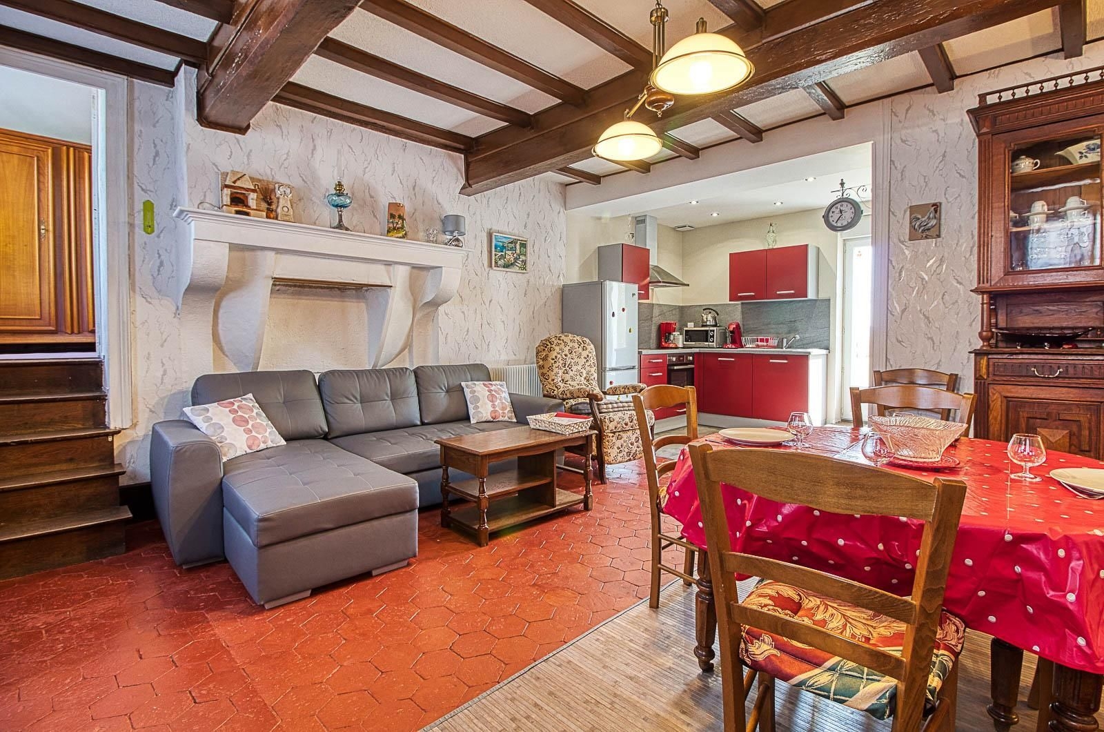 Au rez-de-chaussée, le séjour avec tommettes et poutres dispose d'une cuisine équipée, d'un salon avec canapé convertible (supplément de 17€ par jour et par personne) et d'un espace repas. Quelques marches pour accéder à une salle de bains avec WC. Pas de wifi.