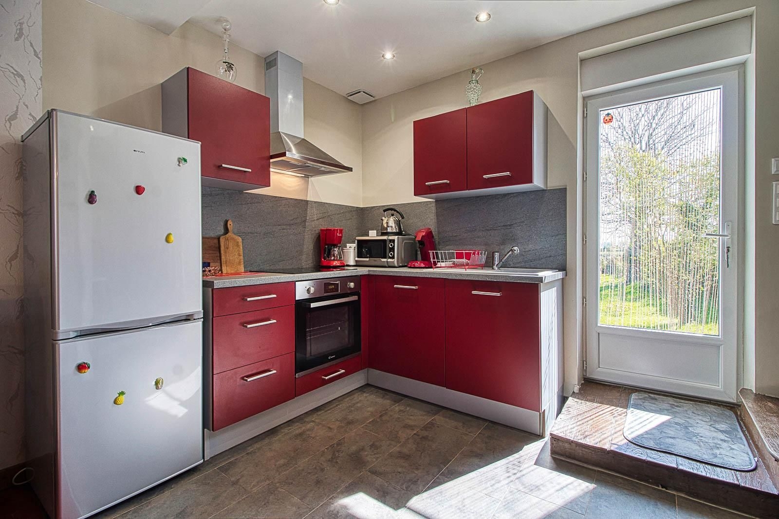 Grande cour fermée devant la maison, avec parking et garage. Terrasse à l'arrière avec jardin clos et grand pré à disposition de 1100 m². Équipement bébé : lit parapluie et chaise haute.