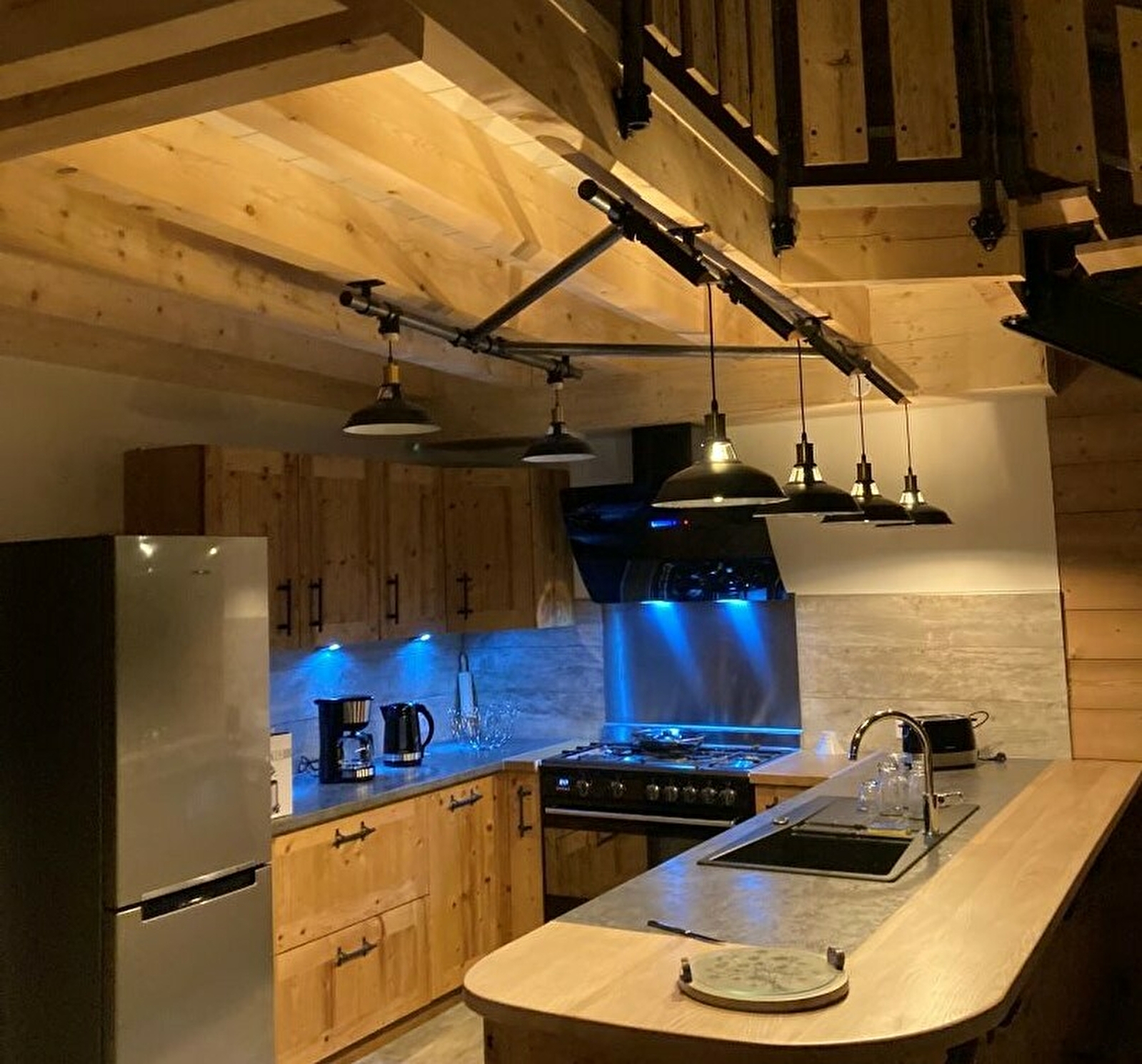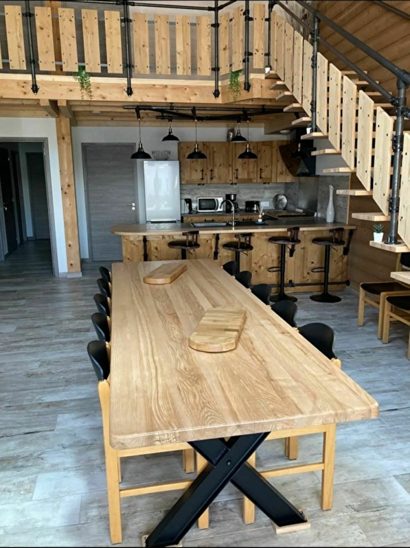 Cuisine toute équipée en bois , ouverte sur une grande salle de séjour avec grande table. Salon avec canapés, TV,