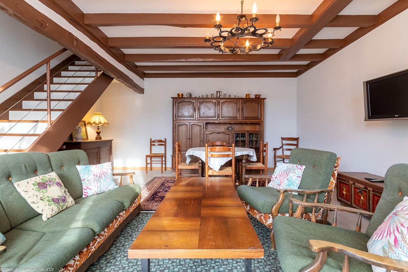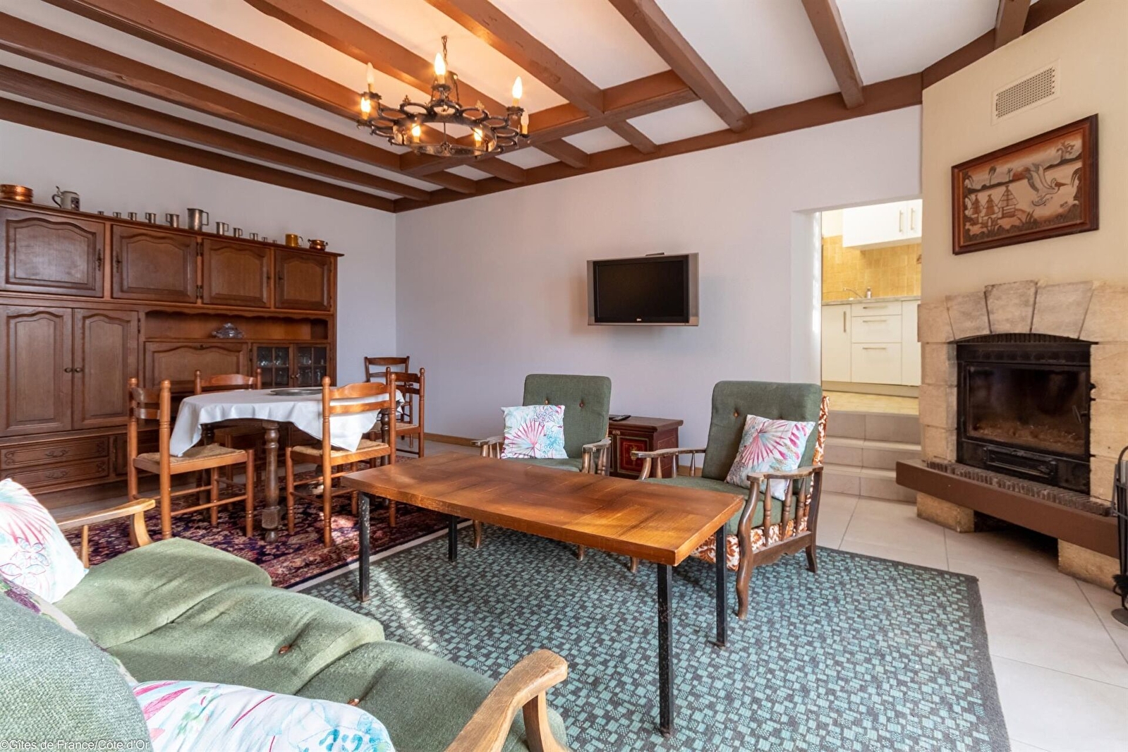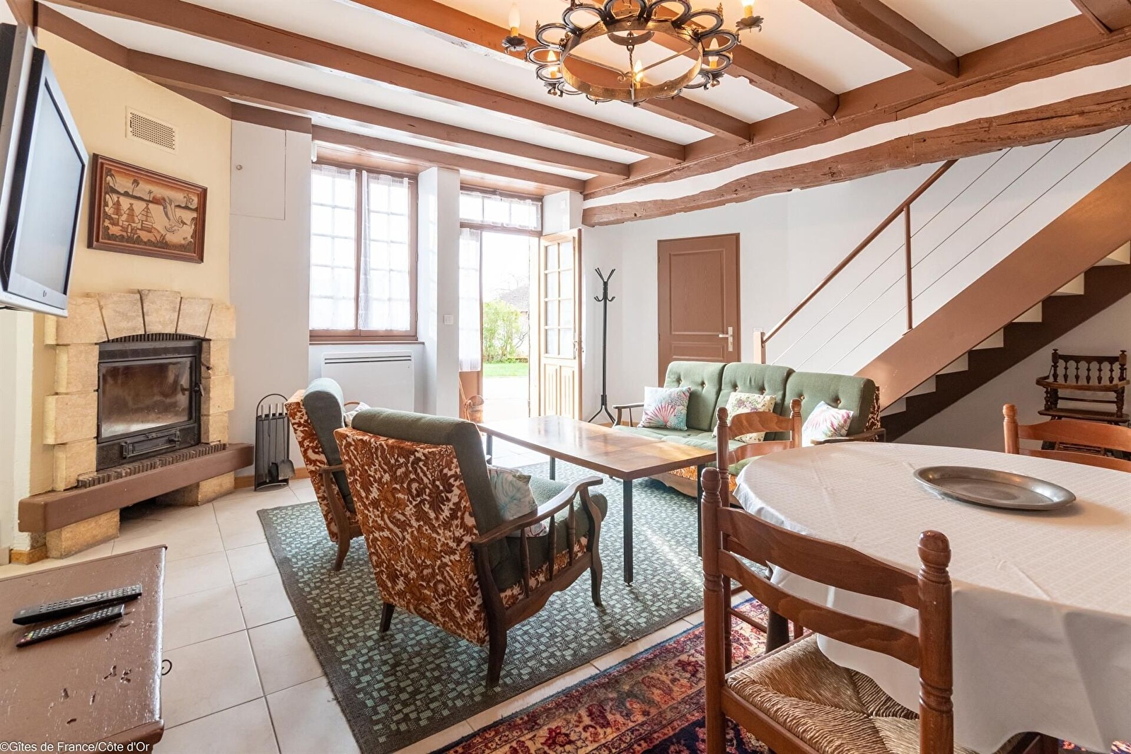 Rez-de-chaussée : salle à manger-salon avec TV et cheminée à foyer fermé. Cuisine intégrée. Salle d'eau avec WC séparé.