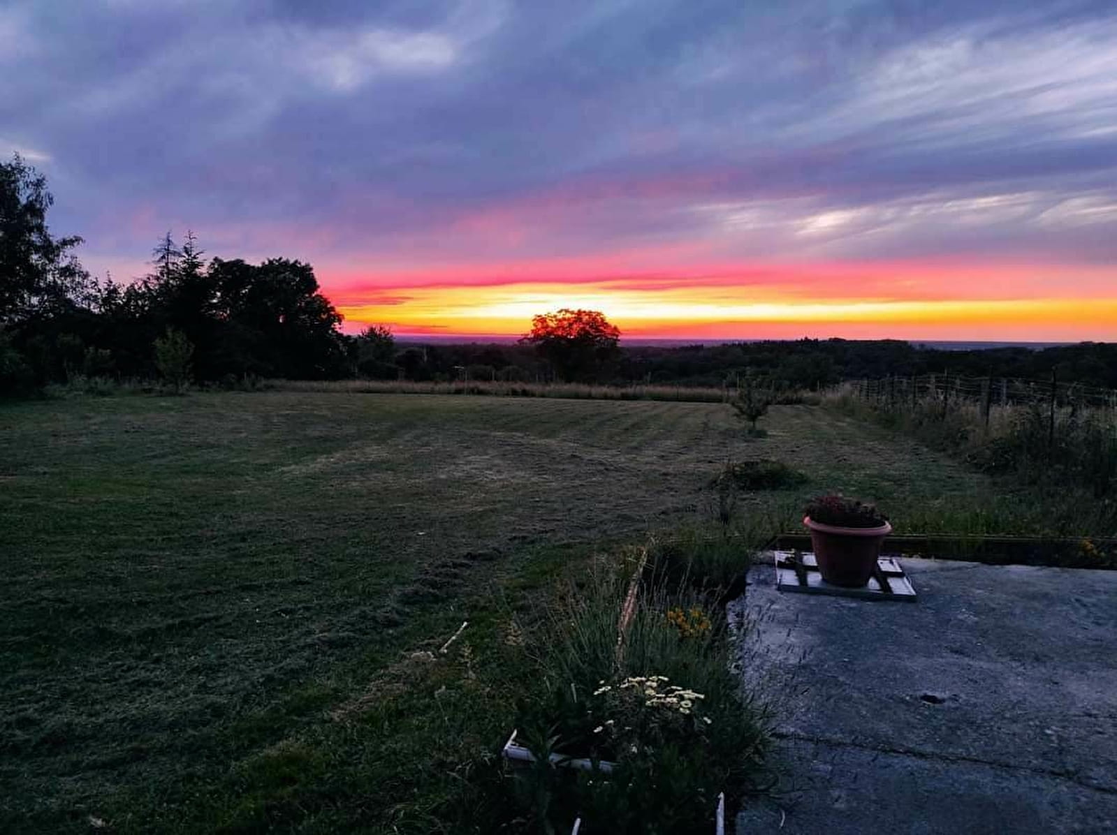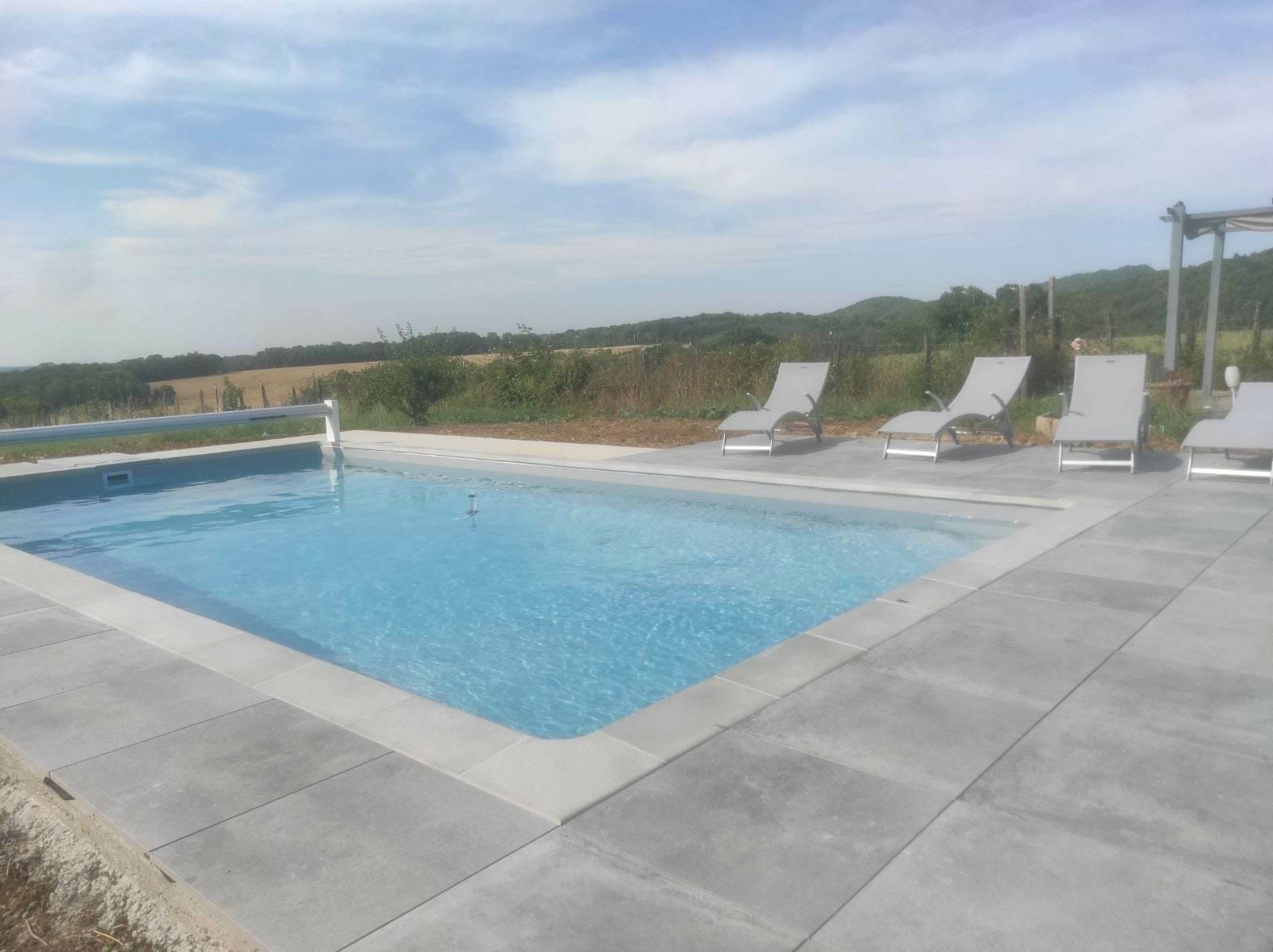 La grande terrasse vous offre une magnifique vue sur la Bresse jurassienne et aussi la possibilité de vous baigner dans une vraie piscine creusée ! Avec les transats, pour lire, bronzer, discuter...