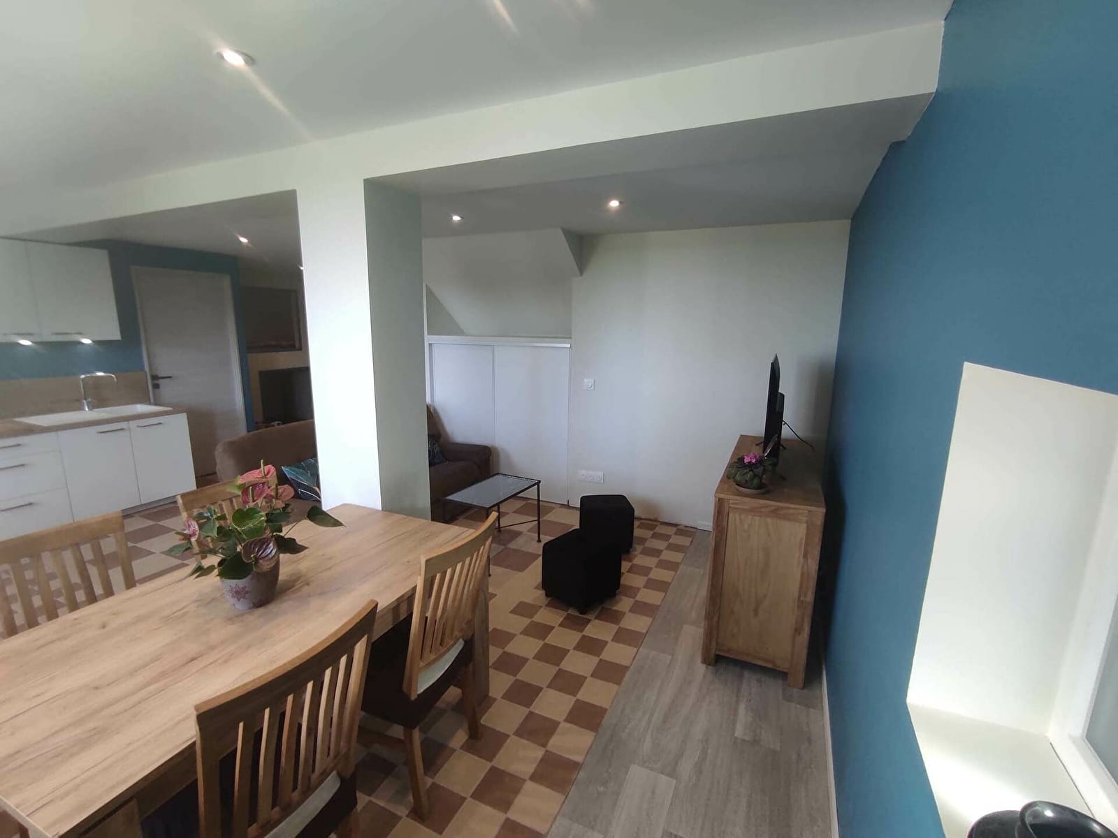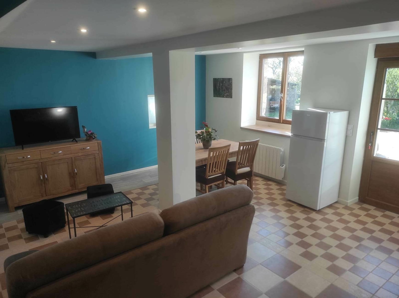 - Séjour : espace détente avec canapé de qualité, poufs pour les enfants ou les grands enfants, TV écran plat 101 cm