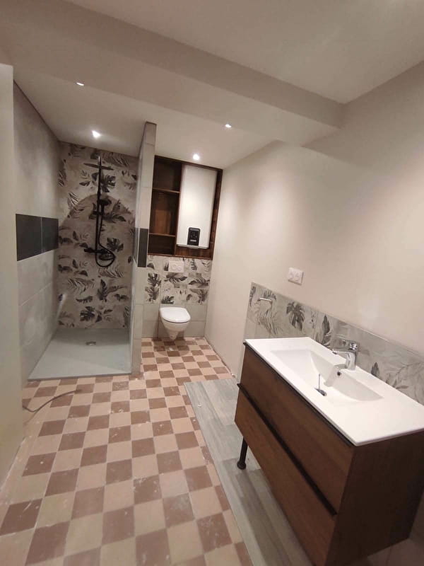 - Salle-de-bain : Lavabo, douche à l’italienne spacieuse, sèche-serviette, lave linge