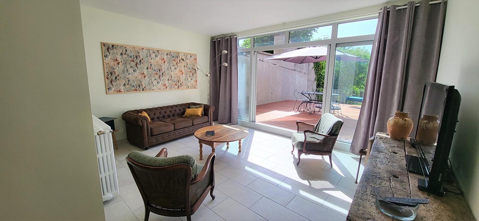 Au fond du jardin coule le Nohain, une grande terrasse vous permet de profiter pleinement de l’extérieur.