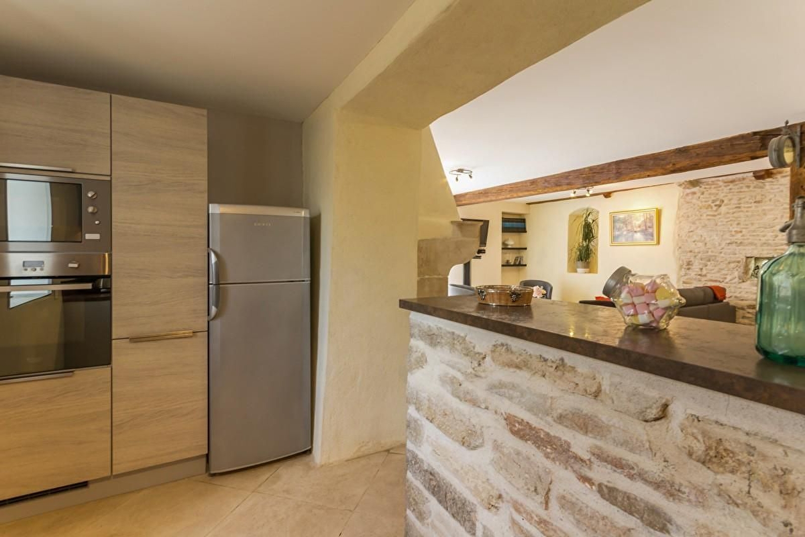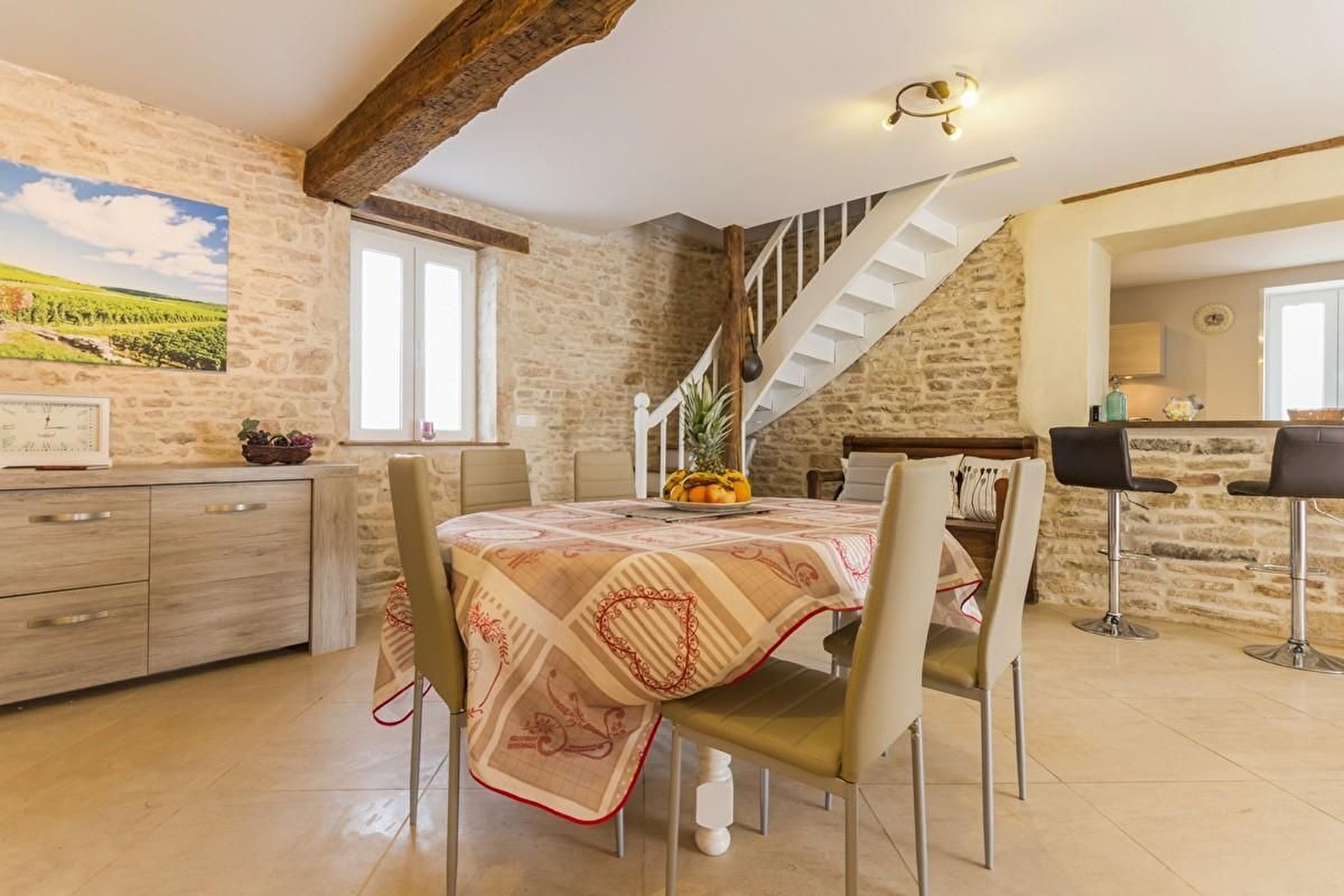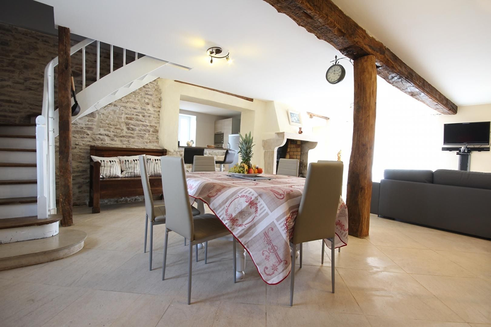 Au rez-de-chaussée, grande pièce à vivre offrant salle à manger et salon de caractère avec pierres apparentes, pierre de Bourgogne au sol, cheminée et cuisine intégrée. Séjour. WC séparé. Lit bébé + chaise haute + rehausseur + baignoire bébé à disposition.