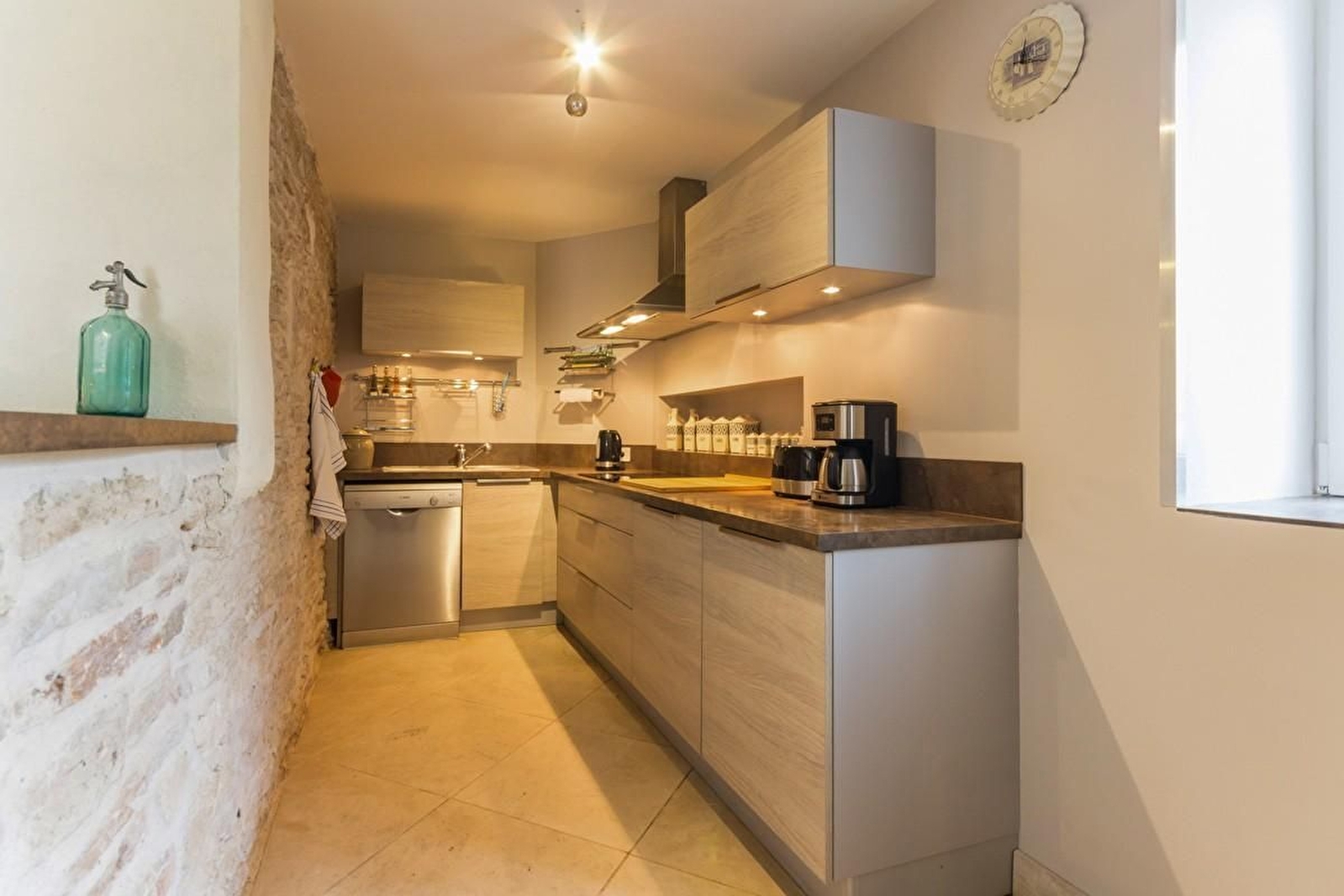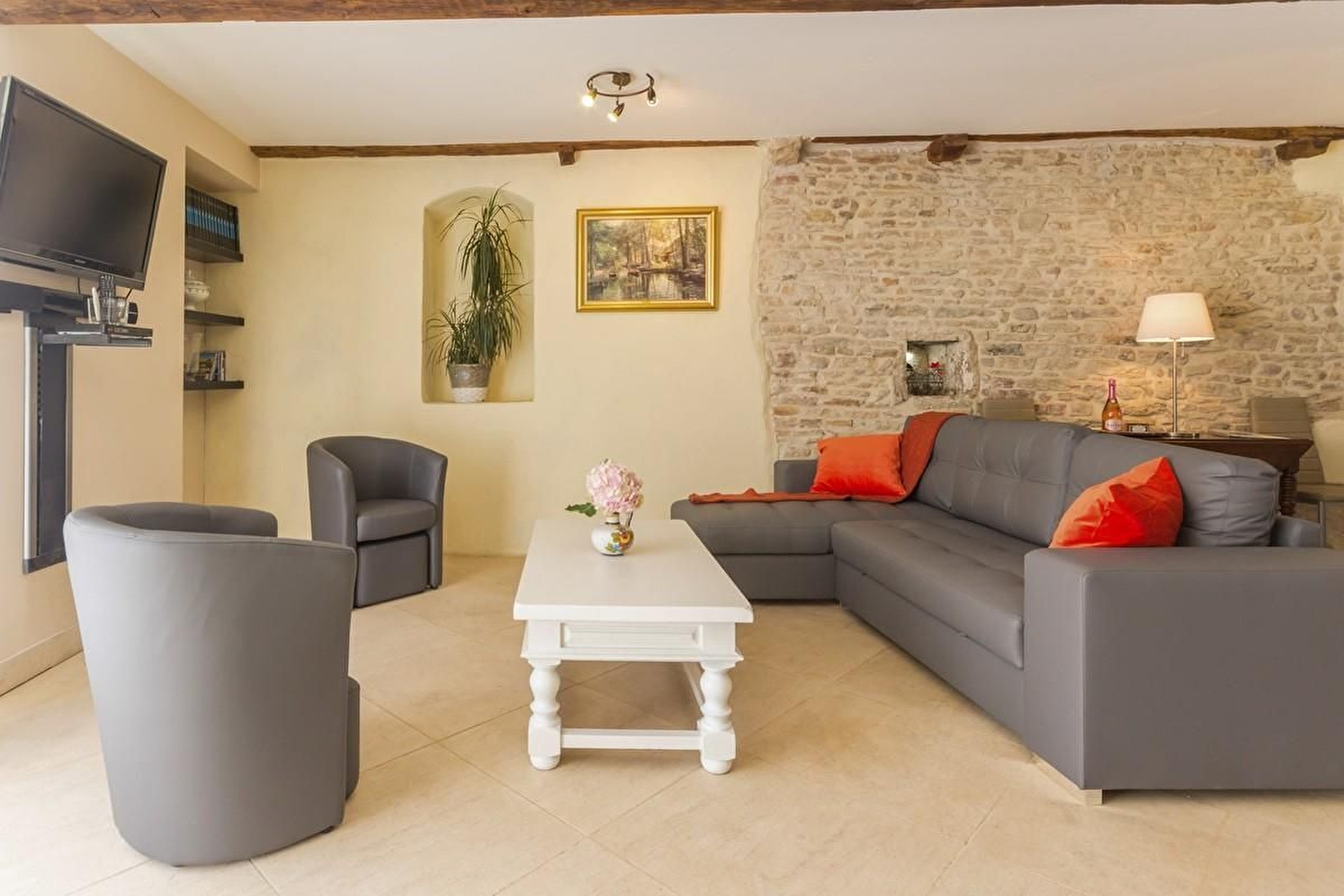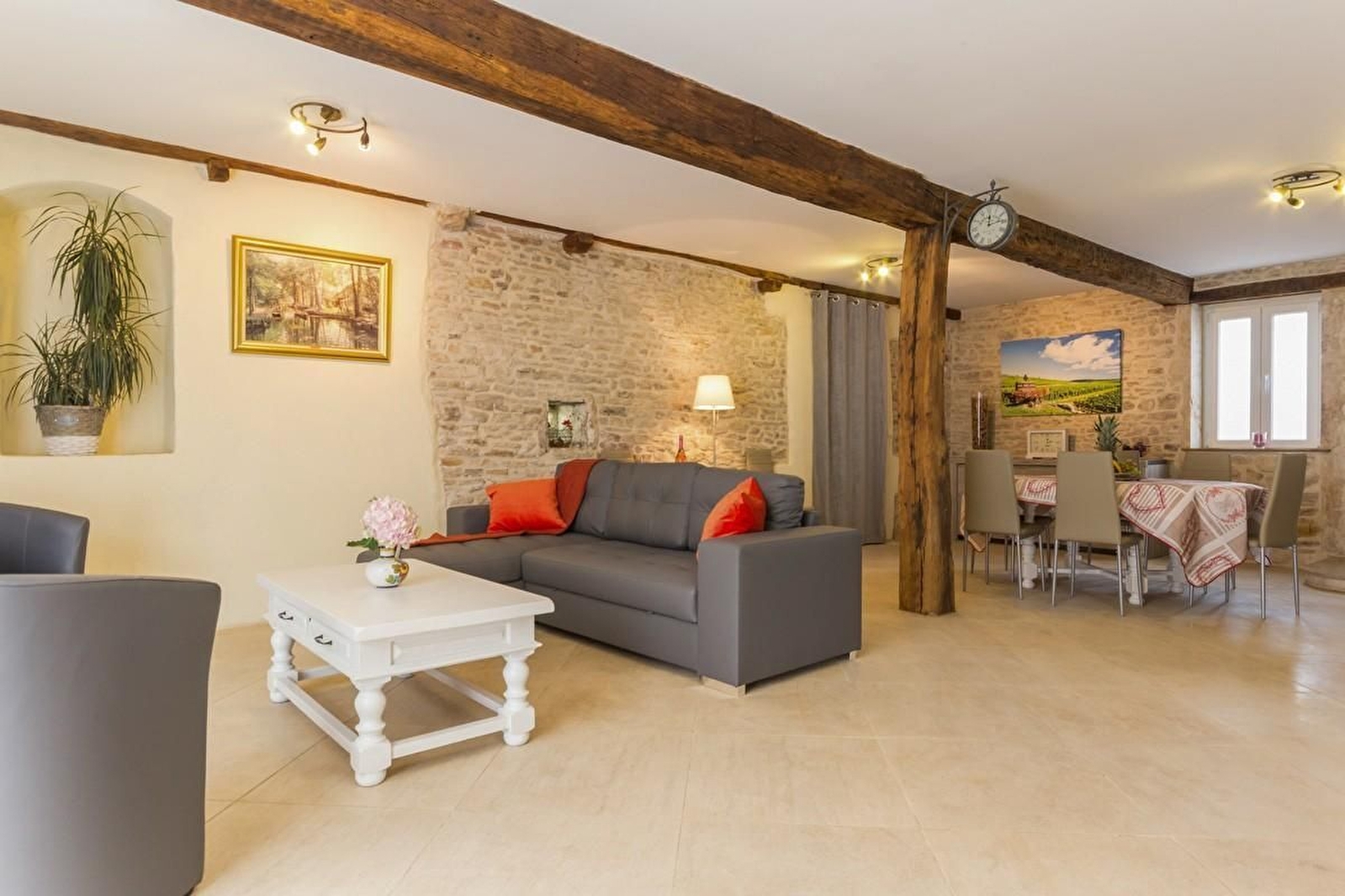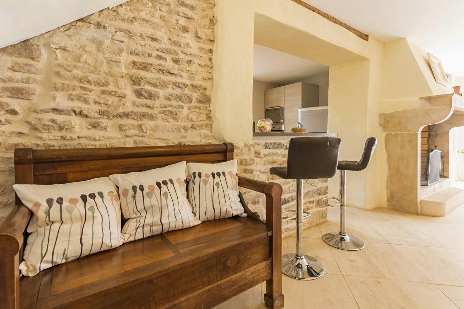 Au rez-de-chaussée, grande pièce à vivre offrant salle à manger et salon de caractère avec pierres apparentes, pierre de Bourgogne au sol, cheminée et cuisine intégrée. Séjour. WC séparé. Lit bébé + chaise haute + rehausseur + baignoire bébé à disposition.