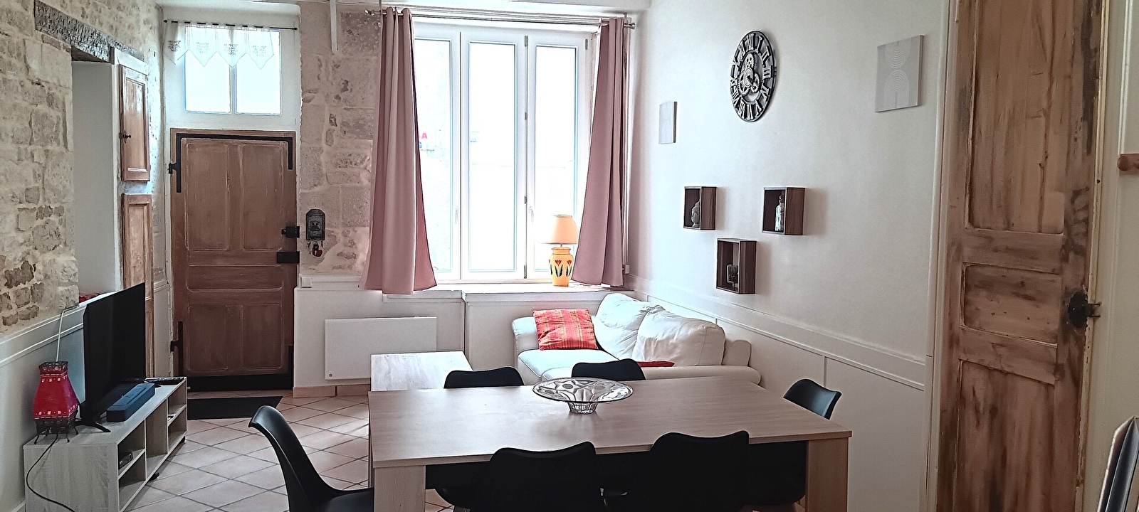 Salon :Canapé convertible, TV écran plat, table à manger 6 personnes, table basse.