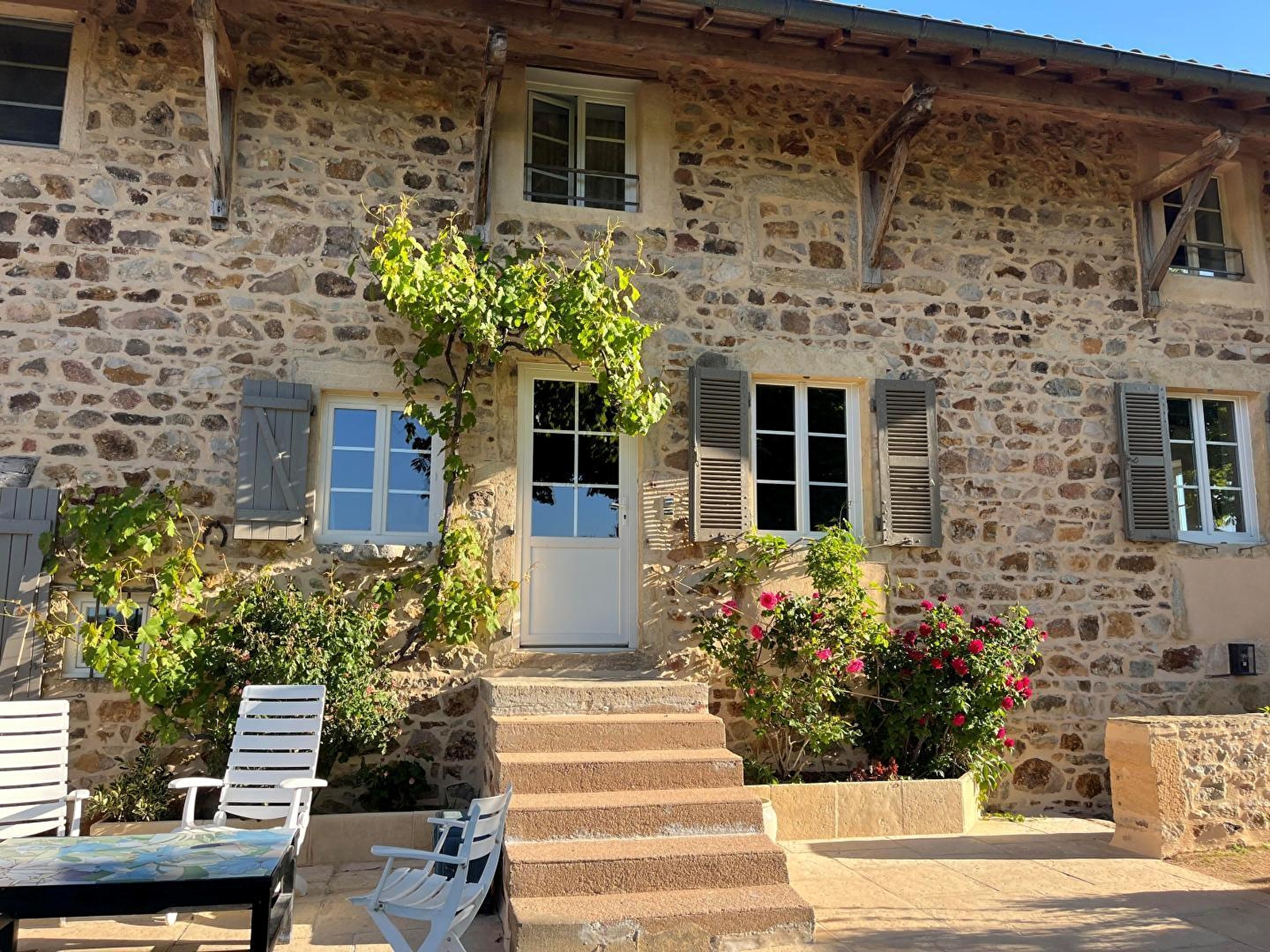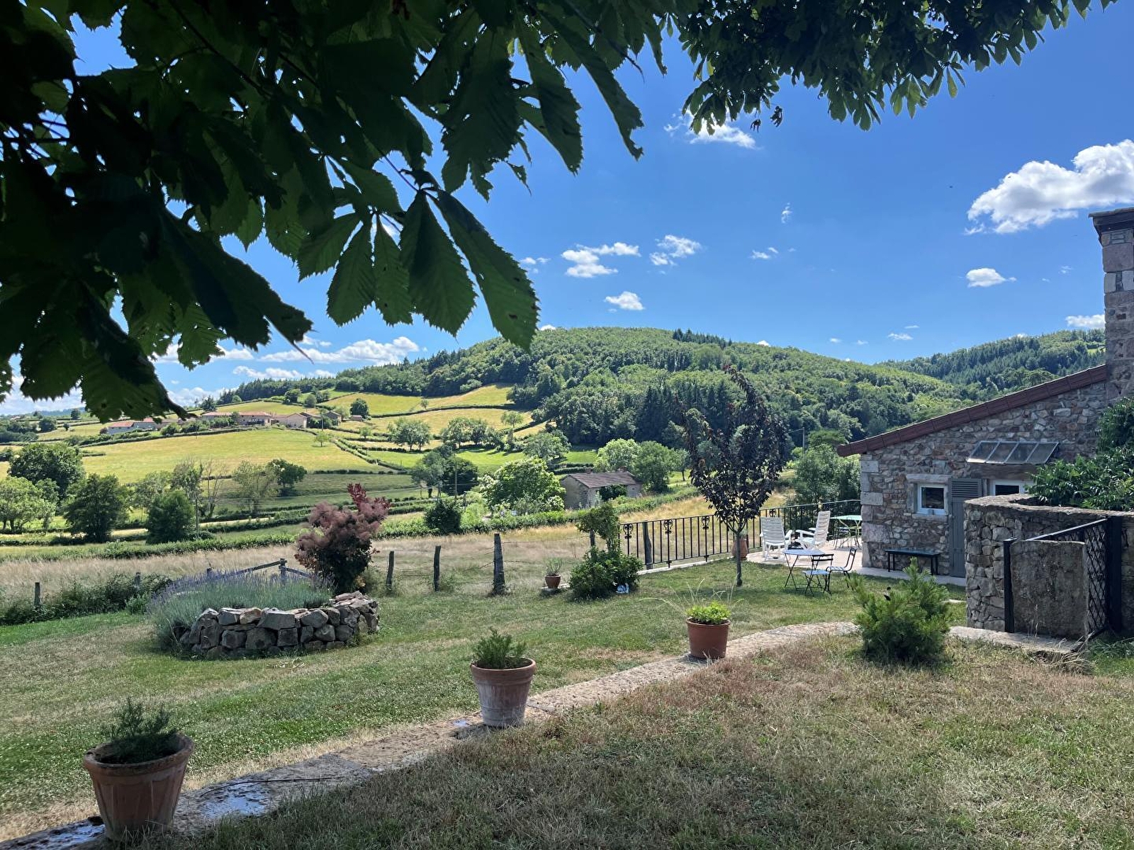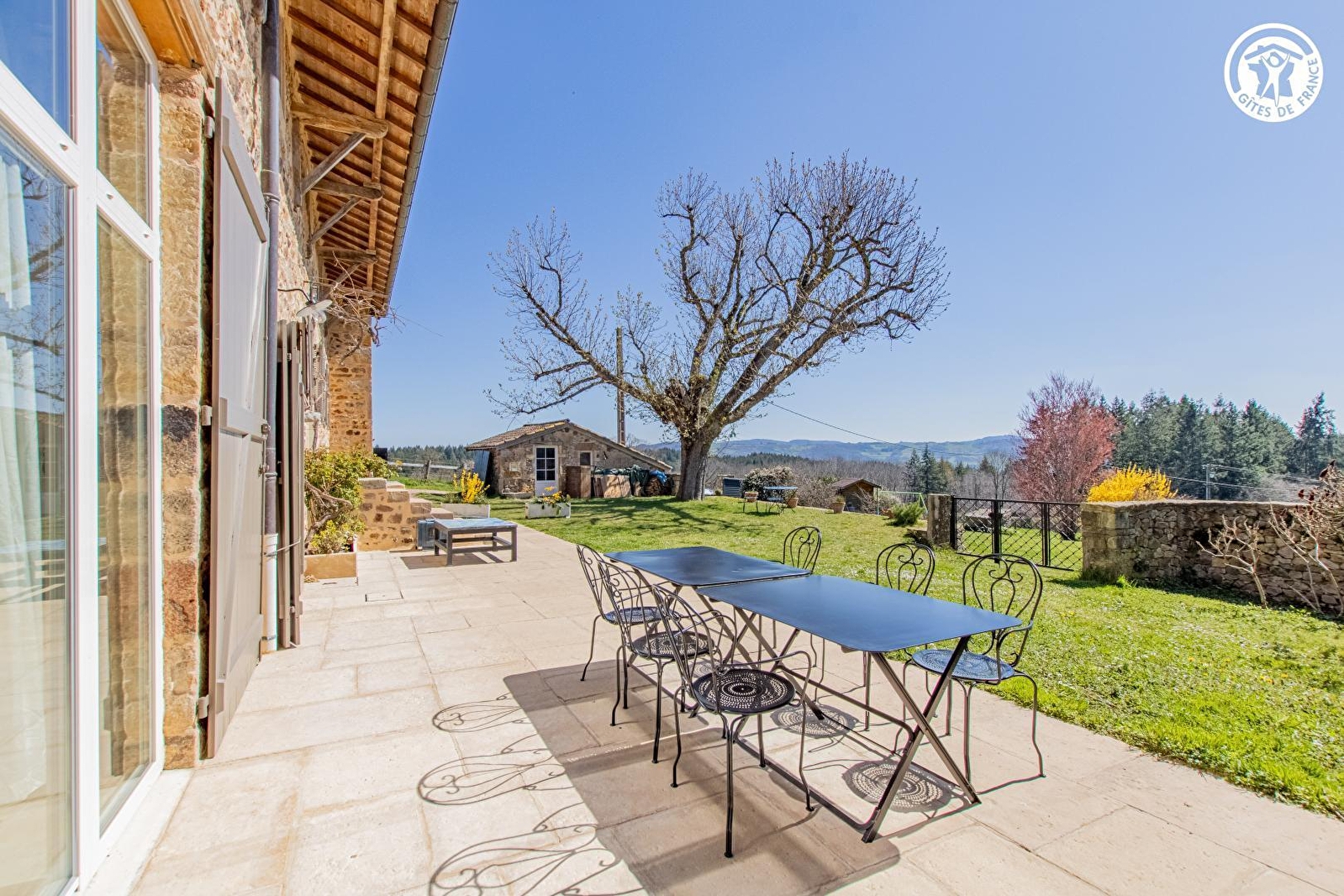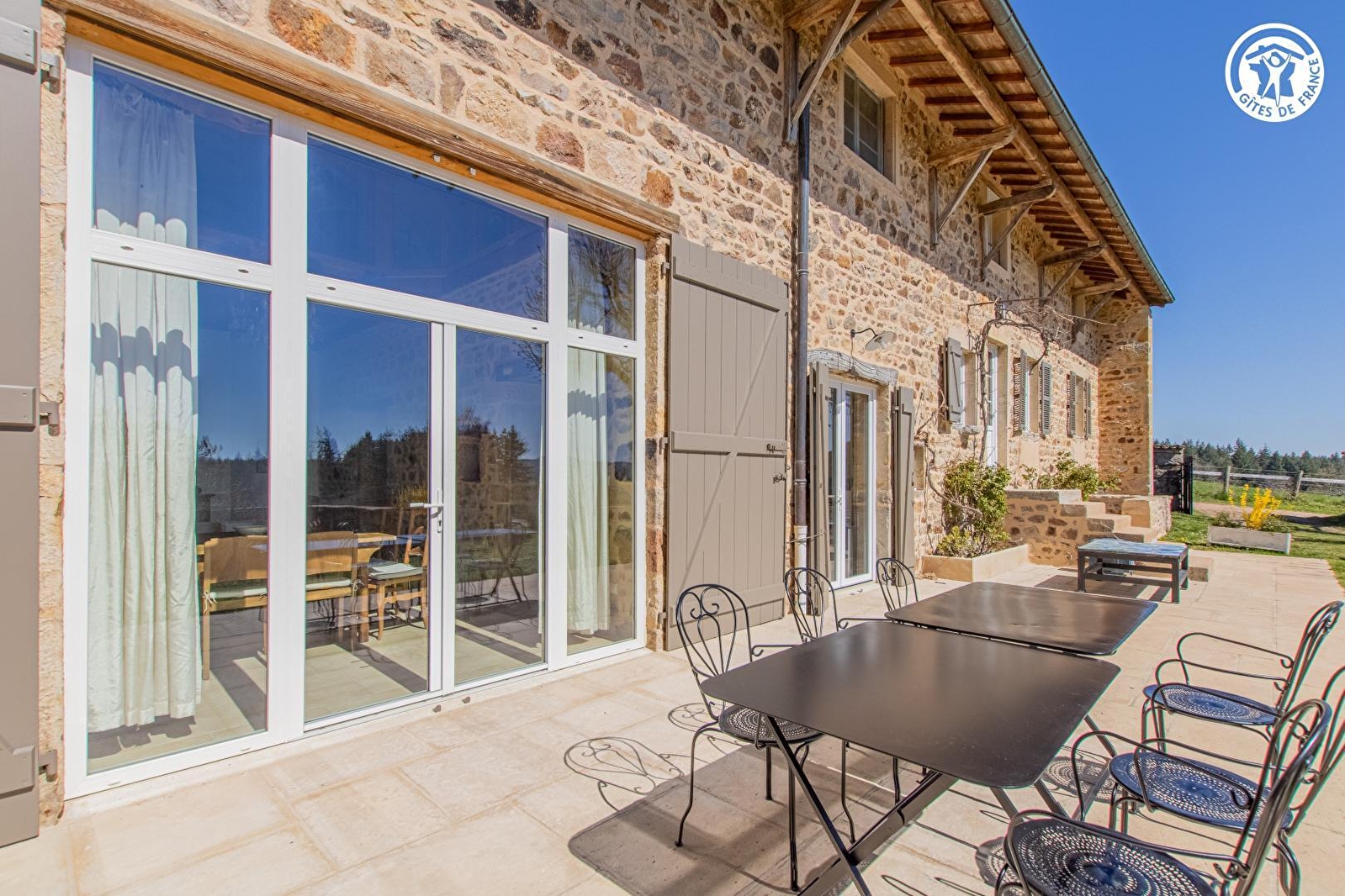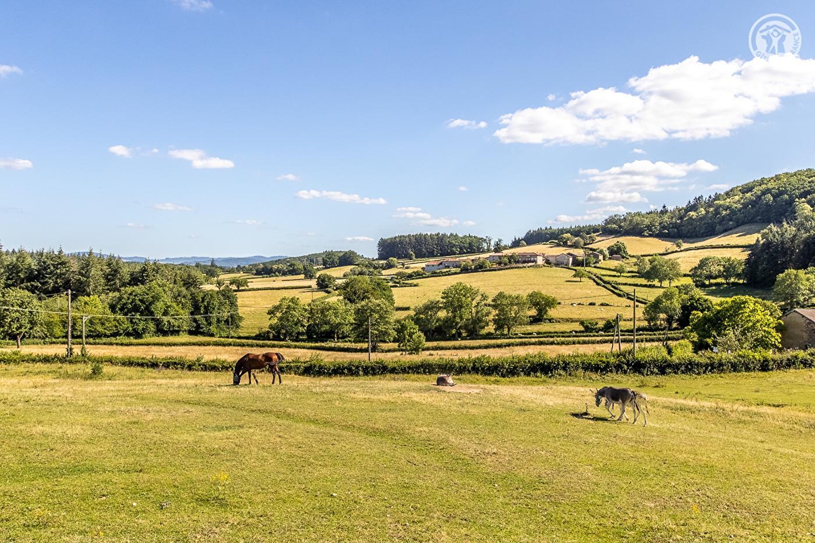 Aurélie & Vincent, viticulteurs dont le domaine familial se situe à 30 km (en réputé cru "Pouilly Fuissé" / visite & dégustation possibles), vous ouvrent les portes d'une ravissante authentique ferme traditionnelle de caractère de 1887 restaurée avec goût, dans les règles de l'art, adossée à flanc de colline en "belvédère" & "balcon" panoramique sur un coteau sud. Absolue tranquillité au sein d'un petit hameau rural "dispersé", lové au creux d'un bucolique plateau de prairies (accueillant leurs paisibles ânes & jument comme les célèbres vaches charolaises en saison), à l'orée de vastes forêts sauvages, sublime écrin champêtre & naturel préservé de montagne douce (protégé en "Zone Natura 2000" & ZNIEFF pour ses riches écosystèmes). Possibilité d'observer la faune sauvage sur place. Cadre paysagé de toute beauté. Littéral havre de paix & repos. Véritable "coin de paradis vert" pour petits & grands. Spacieux gîte de grand confort. Belle pièce de vie nichée sous un imposant volume "cathédrale". Chaleureux cachet campagnard "bourgeois", cossu & raffiné, sublimé par l'âme dépaysante d'une ancienne bâtisse rurale (murs & linteaux pierres, sublime charpente en "étoile", manteau de cheminée en briques, linteaux en bois, poutres…). Ambiance "enveloppante" digne d'une douillette "maison de famille". Beaucoup de charme. Vastes terrasses (exposées & ombragées) ouvertes sur un agréable jardin de 400m². Superbe panorama & vue dégagée sur la campagne environnante.
