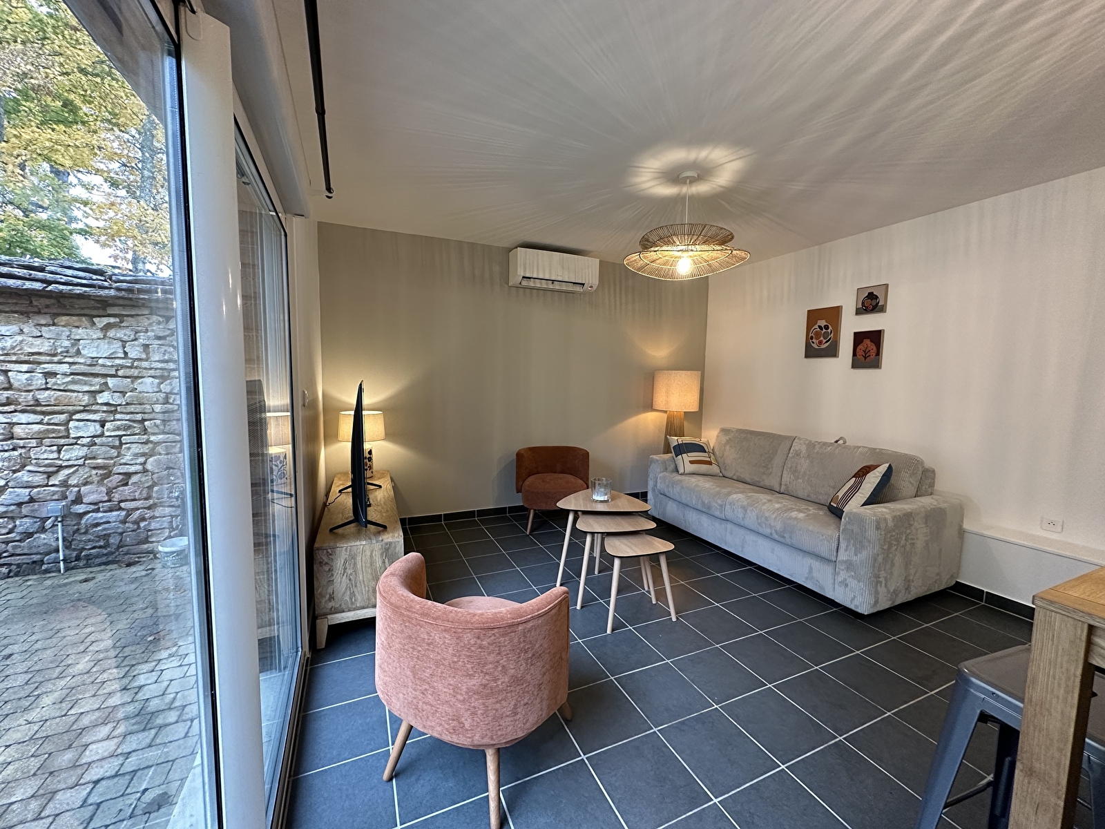 Cette maison rénovée dans un esprit chaleureux comprend une pièce à vivre avec un salon séjour ouvert sur la cuisine.