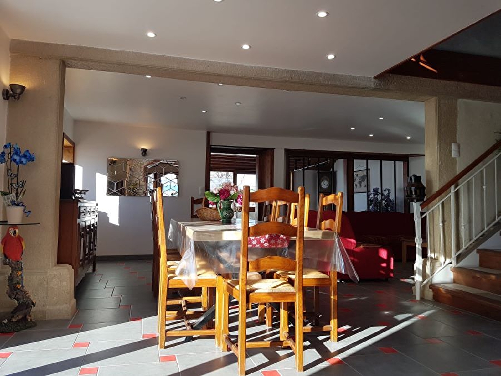 Amoureux de calme et de nature ? Alors cette maison entièrement rénovée saura vous séduire par ses nombreux atouts... elle se compose en rez de chaussée d'un hall d'entrée, d'une grande pièce de vie avec salon et salle à manger, d'une cuisine intégrée toute équipée, d'une chambre avec 1 lit en 160 (matelas de 35cm de haut) et 1 lit simple avec salle d'eau et WC accessible aux personnes à mobilité réduite, d'une buanderie avec lave-linge et sèche-linge. A l'étage, une salle de jeux avec billard et baby-foot et 4 chambres avec lit en 160 (matelas de 35cm de haut) avec chacune salle d'eau avec douche et WC. Chauffage aux granulés (forfait en sus). Abri couvert, terrain de pétanque, terrasse, barbecue. Charges comprises : eau froide, gaz et électricité