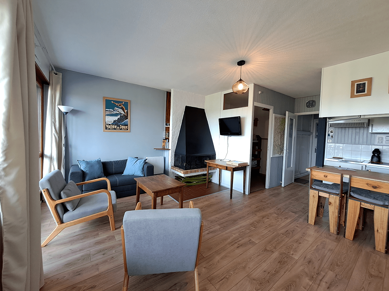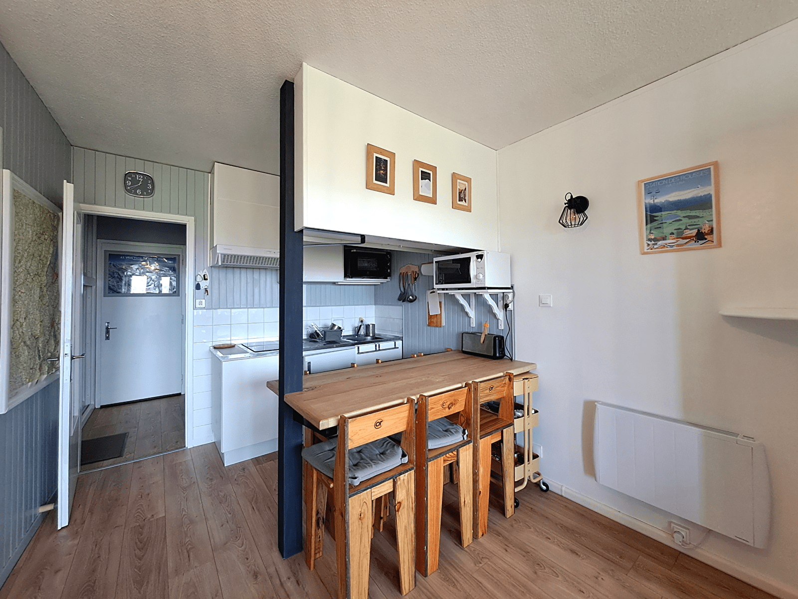 Situé dans la résidence "Le Lacuzon", le studio de 30m² au 1er étage est composé d'une pièce principale avec coin cuisine/repas, salon et un lit mural en 140. Coin montagne avec lits superposés de 90cm.