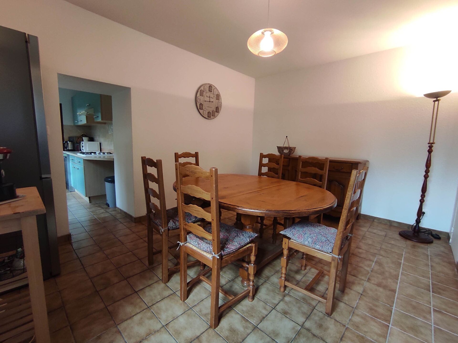 Au rez-de-chaussée, une vaste entrée dessert deux espaces distincts : d’un côté, un salon cosy et confortable, équipé d’une télévision écran plat. De l’autre, une salle à manger attenante à une cuisine fonctionnelle avec lave-vaisselle et micro-ondes. Le four posable électrique se trouve dans le garage. WC indépendant.
