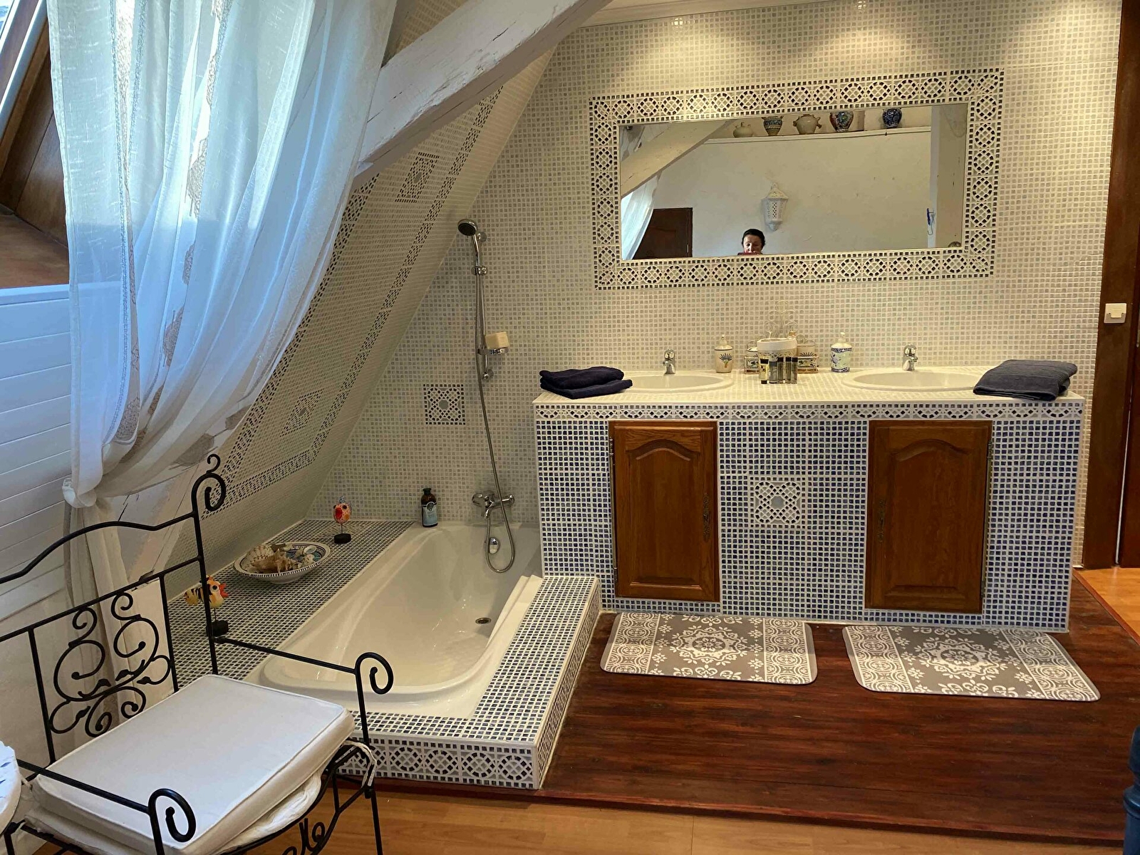 Le Loft de Lancelot réjouira aussi les petites familles (enfants de moins de 7 ans non acceptés du fait de la mezzanine). Le séjour dispose d’un grand lit double aménagé en canapé cosy avec ses grands coussins en cuir. Un couchage d’appoint pour une personne est disposé sur la bibliothèque-mezzanine et permet de profiter de la sérénité d’une lecture sous les toits.