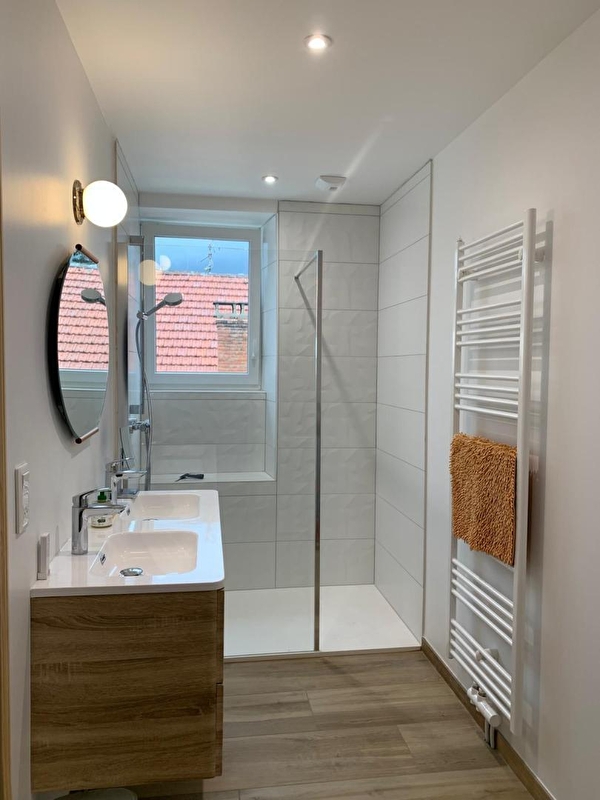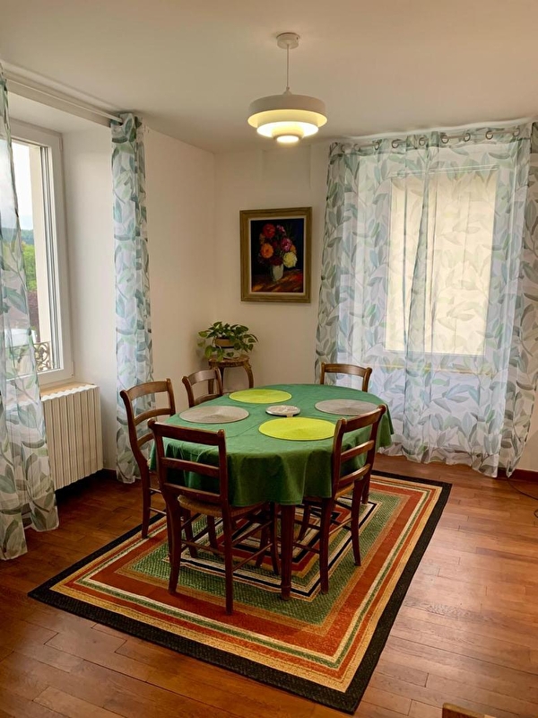 Cet appartement moderne tout confort se situe au premier étage (accès privatif par un escalier extérieur) d'une jolie maison Art Déco, au dessus de l'atelier d'une artiste habitant le rez- de-chaussée. ll se compose d'une pièce de vie avec cuisine équipée, coin salle à manger et espace salon avec canapé et TV, de 3 chambres, dont 2 avec chacune 2 lits simples (pouvant être rapprochés si besoin) et 1 avec 1 lit double (140*190), d'un coin bibliothèque avec livres et jeux, d'une salle d'eau avec douche et d'un WC indépendant. Côté extérieur, vous pourrez profiter d'une grande terrasse couverte aménagée avec salon de jardin et plancha ainsi que d'un vaste jardin partagé pour d'agréables moments de détente et de flânerie. Vous pourrez profiter du calme et de la sérénité des lieux tout en étant à 5 mns à pied du centre-ville où vous trouverez nombreux commerces et restaurants. Stationnement gratuit aisé devant la maison.