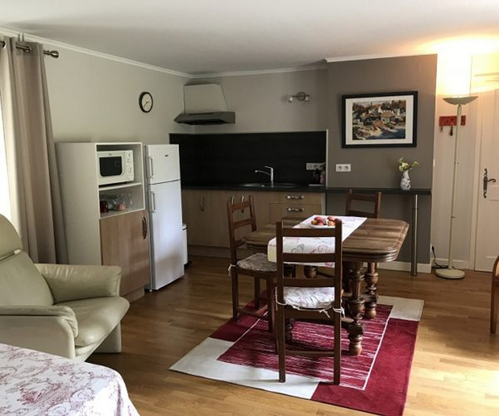 Une pièce principale avec coin cuisine et coin séjour, deux lits de 90 x 190cm. Salle de bains avec douche à l’Italienne & WC. Les deux pièces donnent sur le parc de la maison.