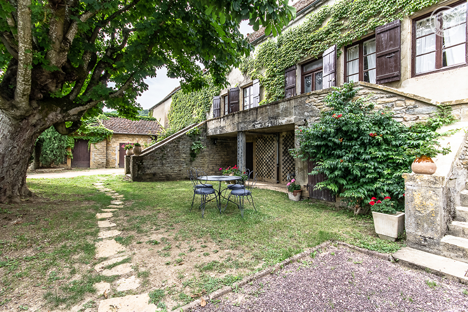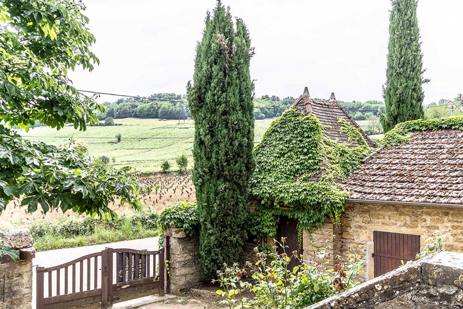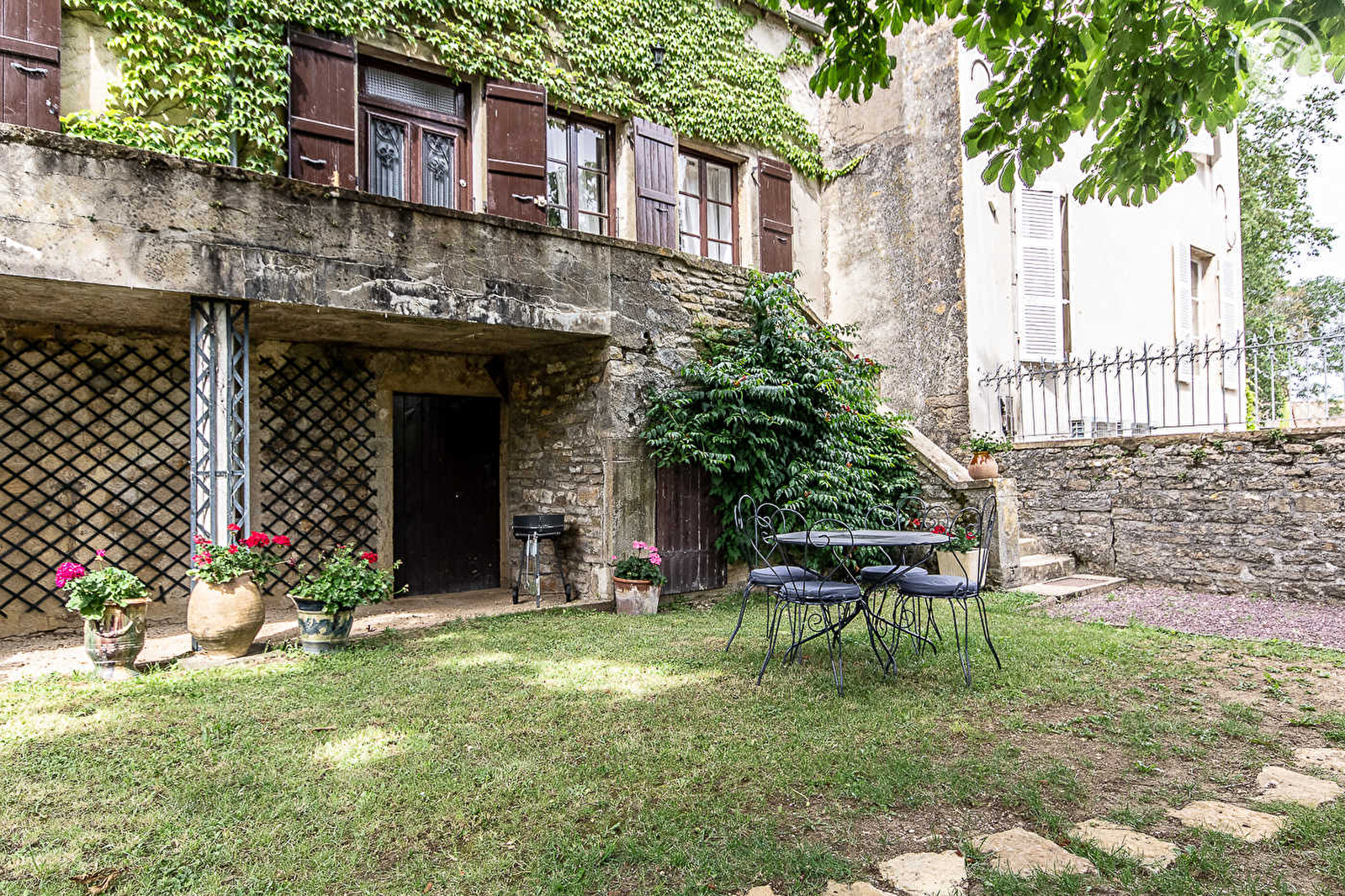 Vigneron en production « bio » (petit domaine familial), François et sa compagne Patricia vous accueillent au sein d'une authentique maison vigneronne de caractère du début 19ème siècle - chargée d'histoire & soigneusement restaurée dans les règles de l'art - voisinant leur élégante demeure de maitre. Hameau résidentiel & tranquille lové au cœur même du vignoble des Côtes Chalonnaises (célèbre AOC Montagny) jouxtant le pittoresque petit village viticole de Saint-Vallerin (église romane du XIIème à visiter). Lové à flanc de coteau exposé sur un petit plateau dominant la magnifique vallée de la Grosne, le site dispose d'un grandiose cadre paysager vallonné, alternance de vastes vignobles, prairies, rivières, champs et forêts et propose de superbes balades en pleine nature - entre vignes et crêtes boisées - offrant d'imprenables points de vue dont le Mont-Blanc par temps clair ! Splendides panorama & paysages. Absolument magique et enchanteur. Spacieux gîte de très bon confort. Chaleureux cachet campagnard alliant l'esprit d'une maison de famille à une belle restauration patrimoniale (murs en pierres, portes moulurées, fenêtres, têtes de cheminée, le tout d'origine…). Ravissante ambiance dépaysante d'une ancienne demeure. Cosy & cocooning. Beaucoup de charme et de caractère. Agréable jardin aménagé clos à l'abri des regards, cerclé des anciens murs historiques en pierres, disposant d'un espace terrasse ombragé sous un imposant marronnier, que complète un petit balcon panoramique.