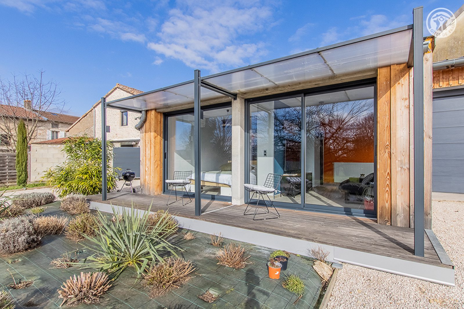 Composition : Gîte mitoyen à l'habitation des propriétaires (totale indépendance). Wifi (fibre). Chauffage central gaz. Climatisation. TV bouquet Orange. Séjour-cuisine, salon (banquette 1 p. 90x190cm en appoint), chambre (lit 2 p.140x190cm) avec salle d'eau "ouverte" (douche), WC indépendant. Terrasse en gravier sur cour + coursive abritée + mini piscine ("stock tank pool" / diamètre 2.6m & hauteur 61cm) + parking privés. Jardin clos en commun (2000m²). Local vélos & motos. Commodités 7 km.