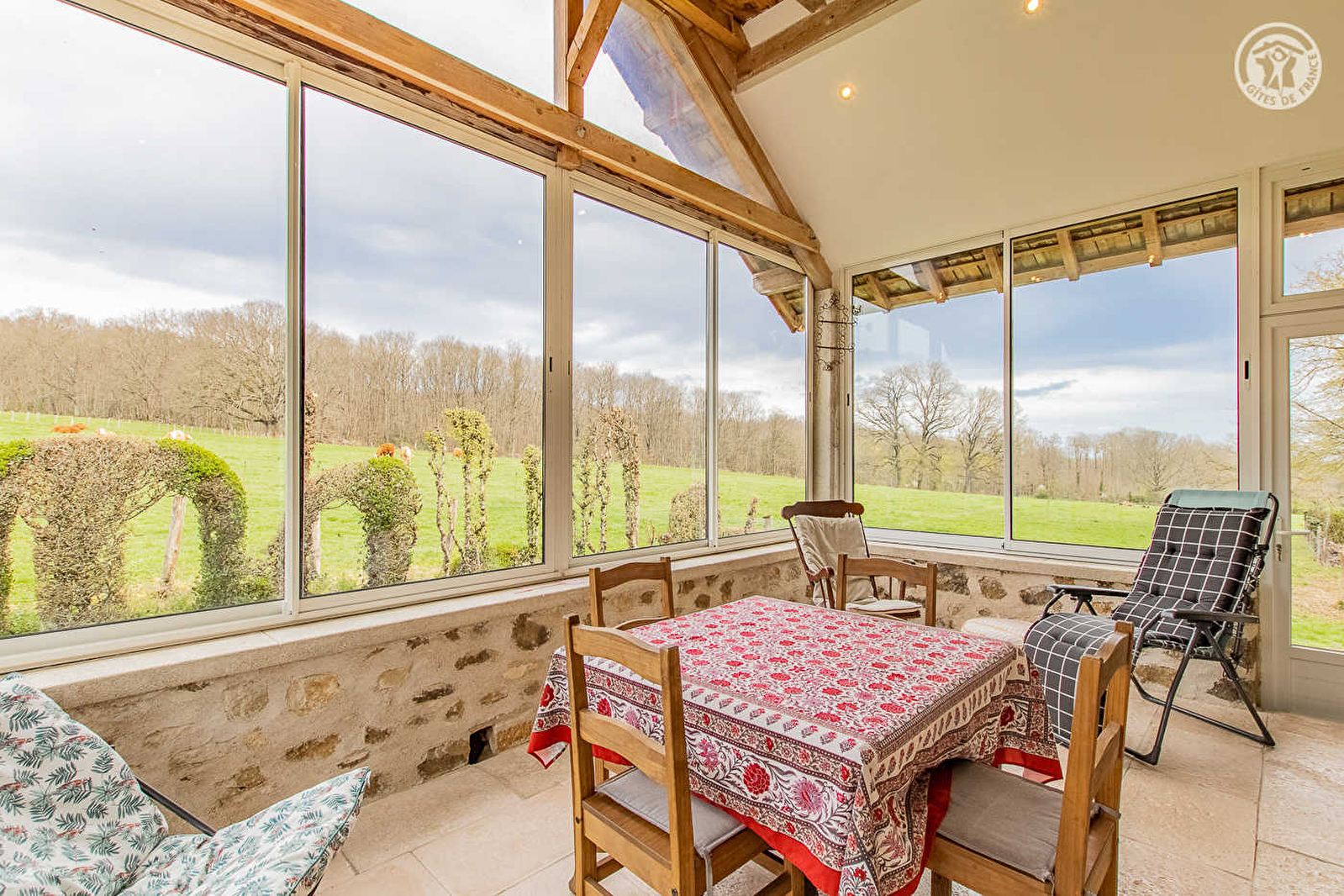Agriculteurs en élevage bovin (limousine & race anglaise "hereford"), Fabienne & Jacques vous ouvrent les portes d'une ravissante ferme traditionnelle de caractère de 1851 intégralement restaurée, dotée d'une véranda panoramique "ouverte" sur le paysage en mode "carte postale" (tout à la fois terrasse couverte l'été & salon avec poêle à bois l'hiver), sise au calme en pleine campagne chalonnaise sur leur petite exploitation, au sein d'un hameau familial pétri de charme composé de plusieurs bâtiments historiques tous réhabilités. Magnifique écrin paysagé, blotti à flanc de coteau en lisière d'une bucolique prairie (avec les vaches du domaine en guise de paisibles voisines), à deux pas des premiers vignobles, sous les crêtes boisées de la colline du "Montabon", vaste massif forestier sauvage riche d'exceptionnels belvédères panoramiques dominant la Vallée des Vaux au creux d'un sublime cadre paysagé. Possibilité d'observer la faune sauvage sur place (grande diversité d'oiseaux, chevreuils, renards, sangliers...). Spacieux gîte de bon confort. Chaleureux cachet campagnard conjugué à une restauration patrimoniale soignée (conservation des poutres, manteau de cheminée en bois, tomettes, linteaux en pierres... d'origine). Ambiance dépaysante d'une ancienne demeure chargée d'histoire. Agréable intimiste "jardinet" jouxtant la pâture voisine. Superbe vue dégagée sur la campagne environnante.