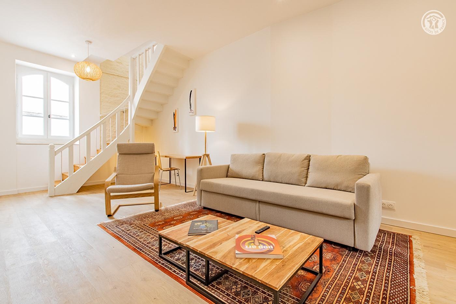 Composition : Gîte en duplex dans la maison des propriétaires (indépendance totale sans vis-à-vis). Wifi (fibre). Chauffage PAC. Climatisation. Rdc : séjour-cuisine-salon (1 canapé convertible 2 p. de 140x200cm en appoint), Wc indépendant. 1er étage : 2 chambres (lit 2 p. 160x200cm / 2 lits 1 p. 90x190cm), salle d'eau (douche/Wc). Local vélos privatif (grand hall d'entrée). Parking public aisé gratuit sur place (face au gîte). Commerces & services sur place (supermarché à 500m). Gîte labellisé "Accueil Vélo".