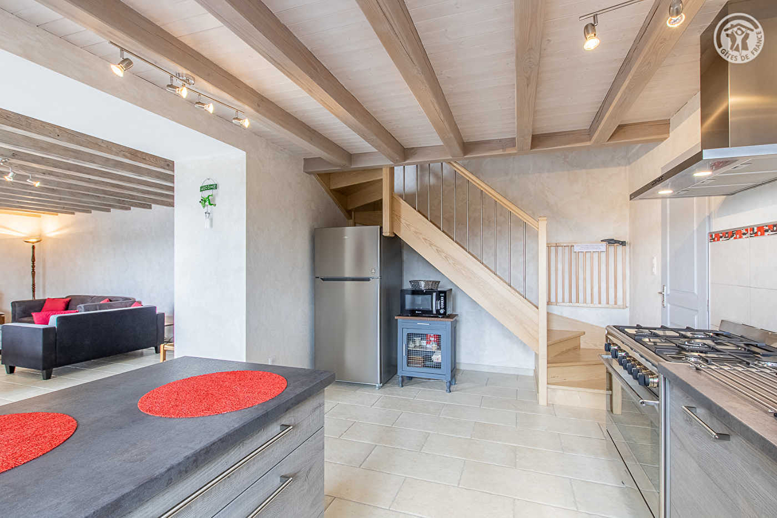 Composition : Maison individuelle. Wifi. Chauffage électrique + poêle à granulés bois. Rdc : séjour-cuisine-salon, 4 chambres (lit 2 p. 160x200cm / 2 lits 90x190cm / lit 2 p. 140x190cm / 2 lits 90x190cm), 2 salles d'eau (douches), 2 Wcs indépendants, buanderie. 1er étage : espace salle de jeux/détente. Terrasse sous pergola + jardin clos + abri couvert voiture (1 place) + parking privatifs. Commodités 6 km. Supermarché 7 km.
