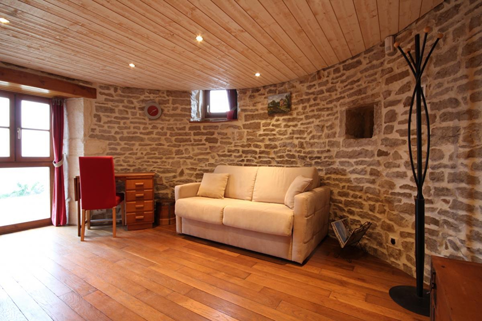 Composition : Maison individuelle (accès par 400m de chemin de terre carrossable). Chauffage électrique + cheminée. Rdc : séjour-cuisine. 1er étage : salon (convertible 1 p. 120x190cm en appoint). 2ème étage : salle d'eau (douche/Wc). 3ème étage : chambre climatisée (lit 2 p. en "triangle" de 4m² / dimensions atypiques / voir photos). Jardinet (1500m² sur terrain 6000m²) + parking + local vélos privatifs. Supermarché 2 km.