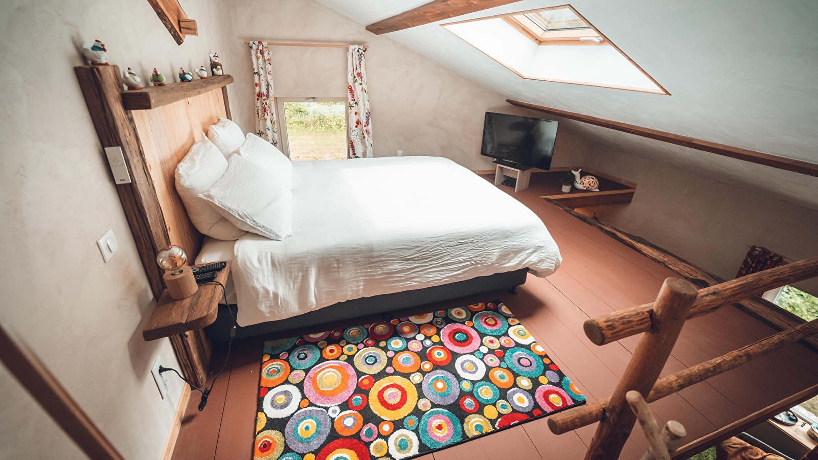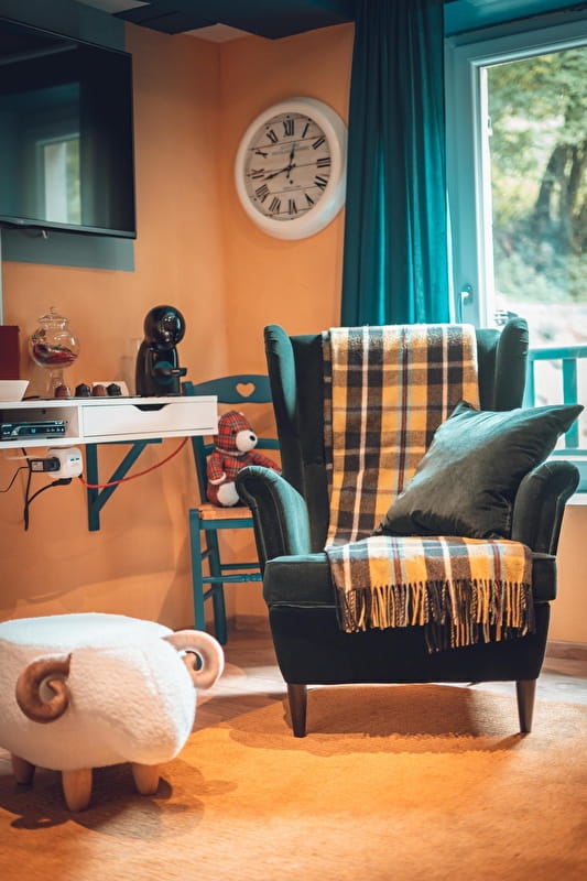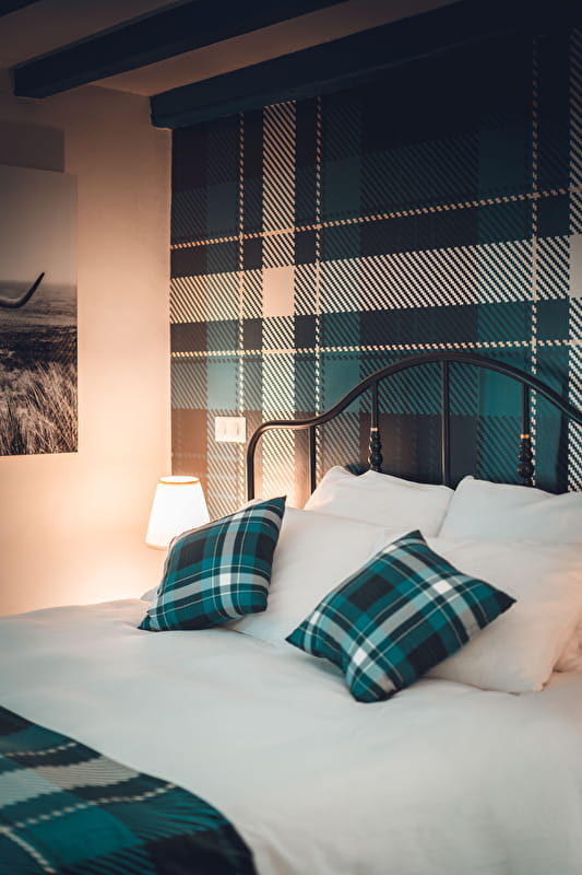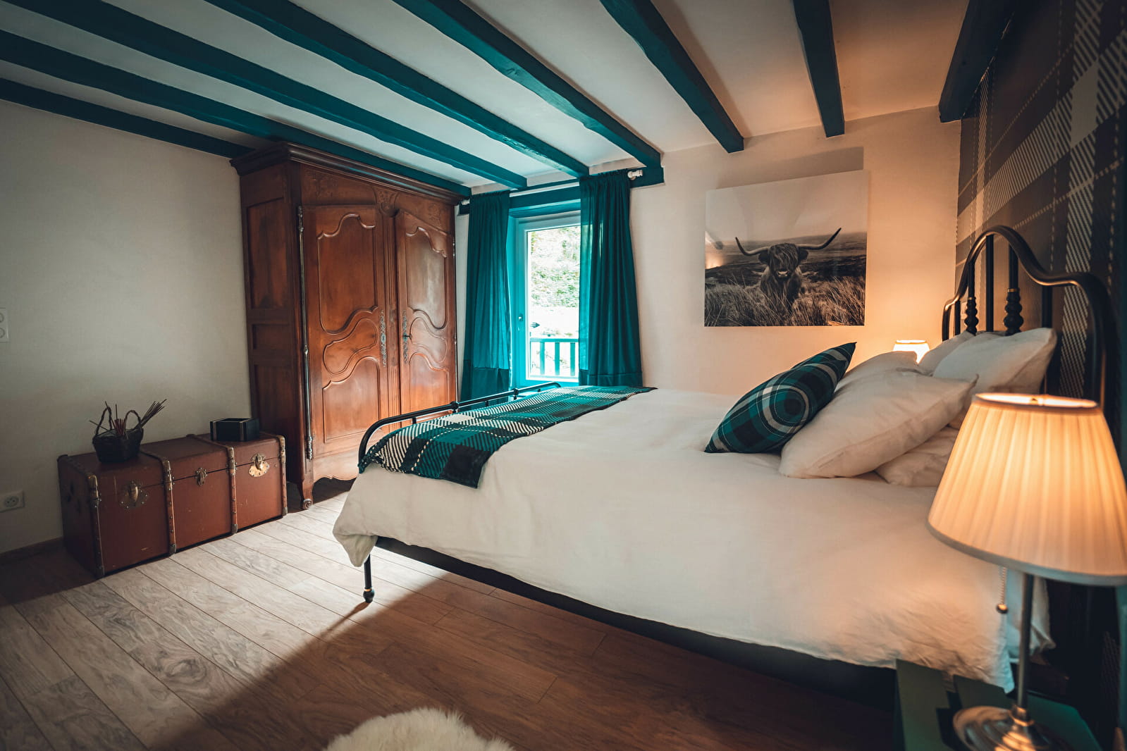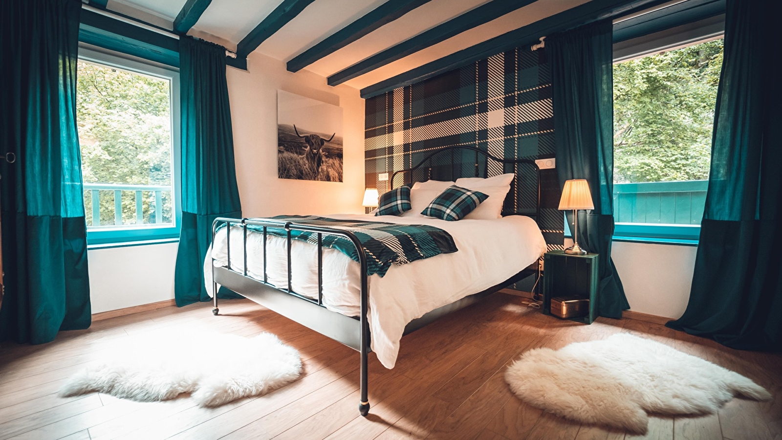 La suite de charme « Scotch-moi » avec son lit queen size, vous transporte en Écosse sur le thème des whiskies. Lové dans un plaid tartan pure laine, vous y croiserez peut-être un troupeau de Highland.