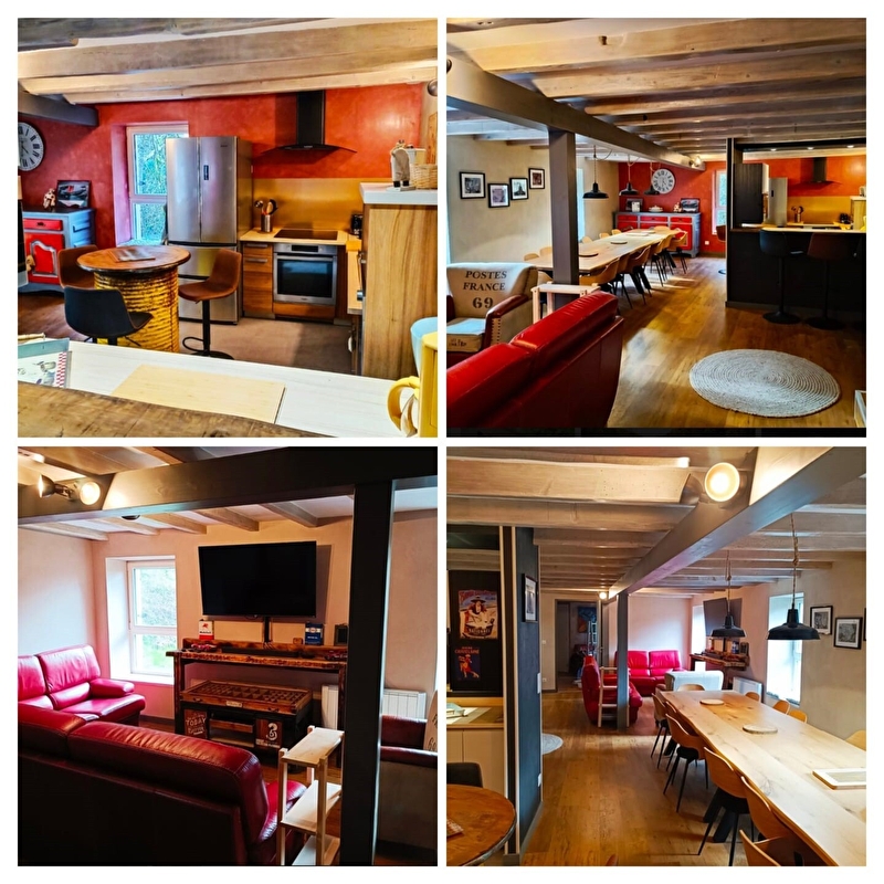 Le gîte se compose d’une vaste pièce de vie de 50m2 comprenant une salle à manger pour quatorze personnes, un coin salon et une cuisine complètement équipée avec bar. Un poêle à bois confère à cet espace une ambiance douce et chaleureuse.