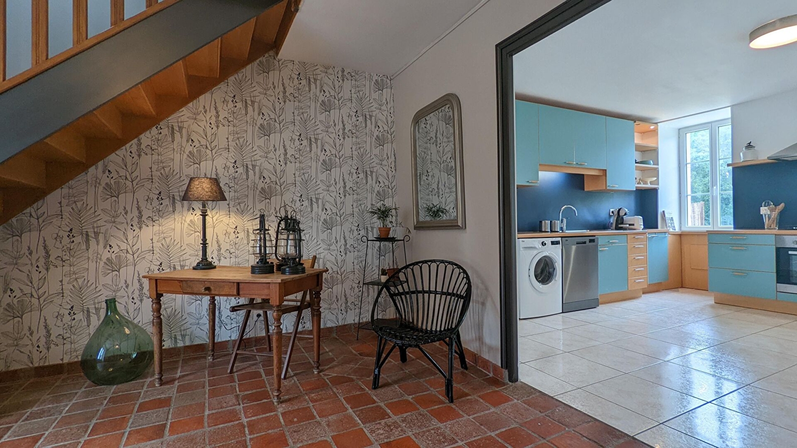 En RDC, spacieuse entrée avec rangements/placards, cuisine équipée et vaste salon/ salle à manger. TV écran plat et poêle à bois (bois fournis). Toilettes. Jeux de société.
