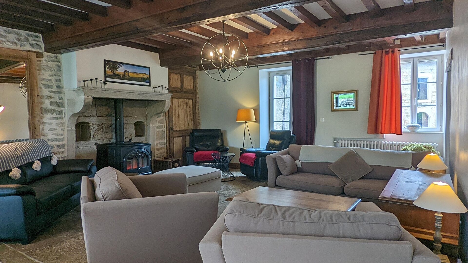 Dans le gîte 10 personnes, vous trouverez en RDC : spacieuse entrée avec rangements/placards, cuisine équipée et vaste salon/ salle à manger. TV écran plat et poêle à bois (bois fournis). Toilettes. Jeux de société.