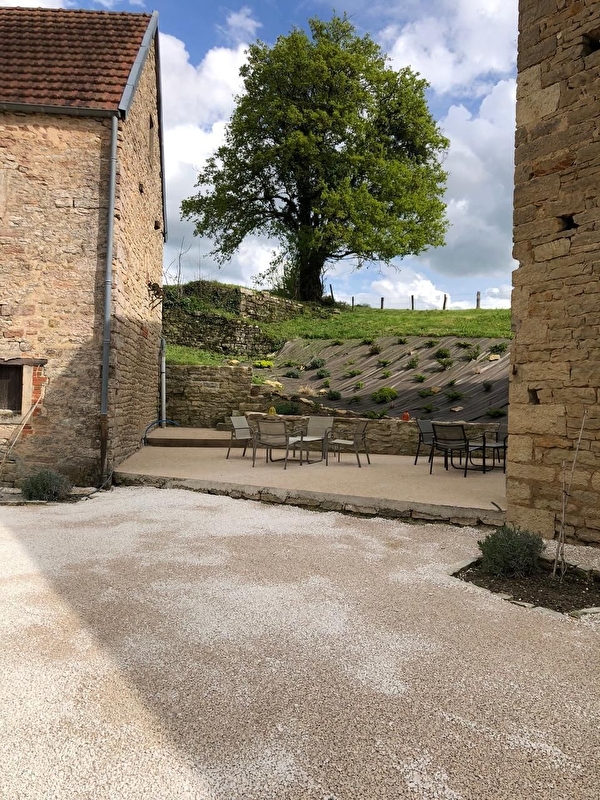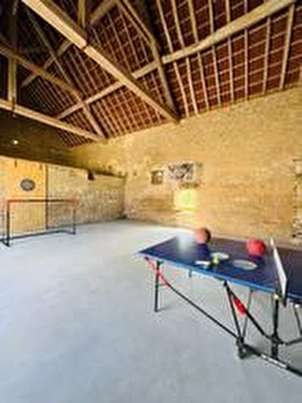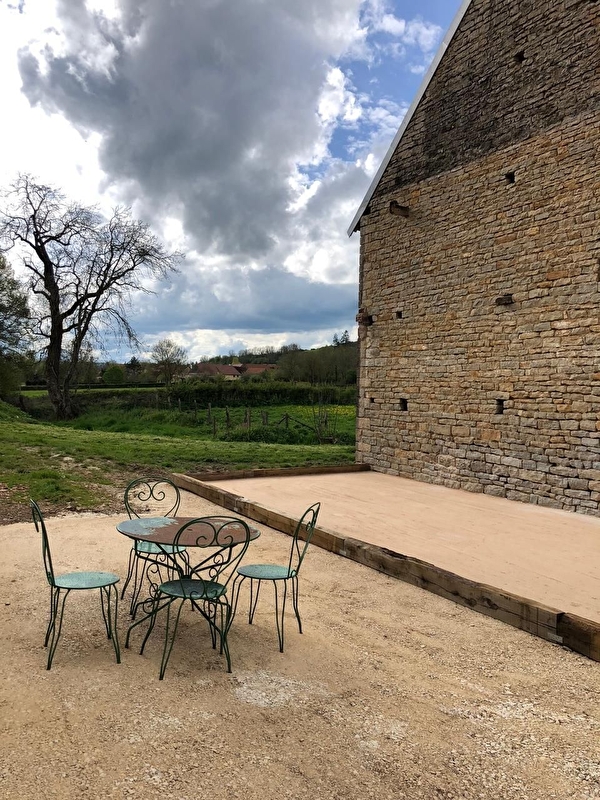 Grand terrasse avec salon de jardin et barbecue. Table de ping-pong et un jeu de fléchettes. Les extérieurs sont en cours de finition. Terrain non clos. Mare et ruisseau dans la propriété non sécurisés. Il incombe aux locataires de prendre garde à la sécurité de l'espace extérieur en cas de présence de jeunes enfants.