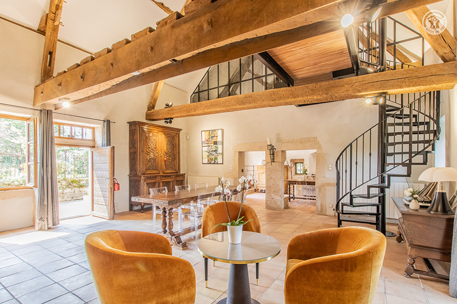 Exceptionnel & très rare authentique moulin du XIIe, soigneusement revisité en hyper confortable villégiature de charme, pétri d'histoire & parfaitement conservé (joyau patrimonial jadis lié à l'abbaye de la Ferté, intégrant tous ses « ouvrages d'art » d'origine), blotti sur les rives d'une vaste « pièce d‘eau » privée de 1 ha sise sur la Grosne, avec barque à disposition (réputée pour ses brochets, ouverte aux pêcheurs). Calme & tranquillité en pleine campagne, au sein d'un mini hameau rural lové en lisière de champs & prairies (avec les paisibles vaches charolaises comme proches voisines) à l'orée de la vaste forêt domaniale sauvage de la Ferté. Apaisant cadre préservé & site littéralement insolite, au creux d'un magnifique écrin paysagé (site protégé en « Zone Natura 2000 »), à deux pas du centre du village, typique & pittoresque (église romane classée du XIIe). Gîte de grand confort. Très spacieux. Vaste pièce de vie dotée d'un imposant volume « cathédrale » (7m sous faîtage). Chaleureux cachet campagnard cossu & raffiné, aux accents contemporains (superbes escalier & verrière atelier design), conjuguant traditions & modernité dans un élégant « mix & match », que sublime une restauration patrimoniale ultra soignée (majestueux manteaux de cheminée, linteaux & murs en pierres, sculpturale charpente... d'origine). Énormément de caractère. Ambiance cosy & cocooning, 100% dépaysante. Large cour-terrasse close exposée & ombragée. Agréable jardin naturel arboré, végétalisé & fleuri de 1100m². Belle vue dégagée sur l'étang & la campagne environnante.