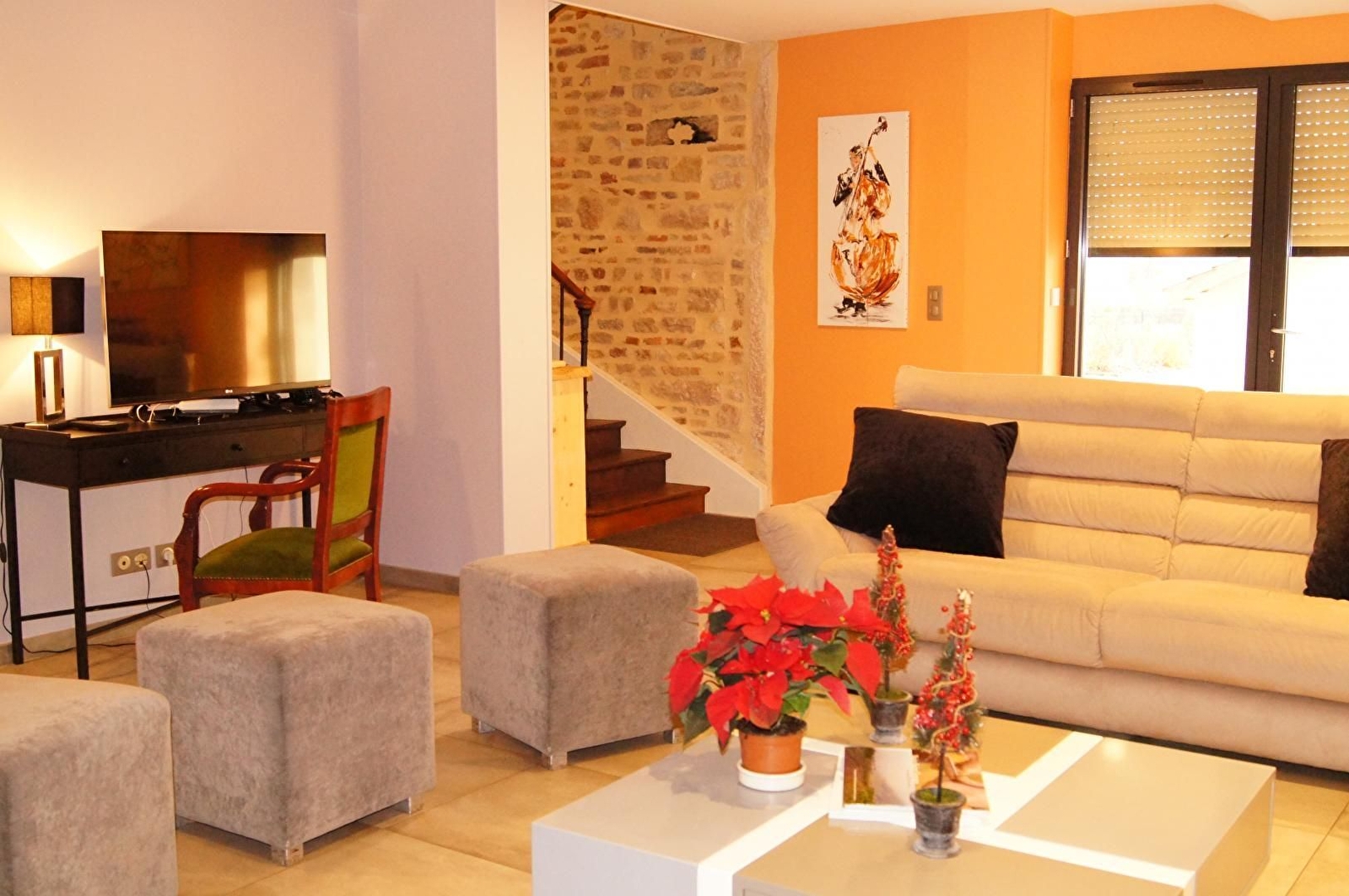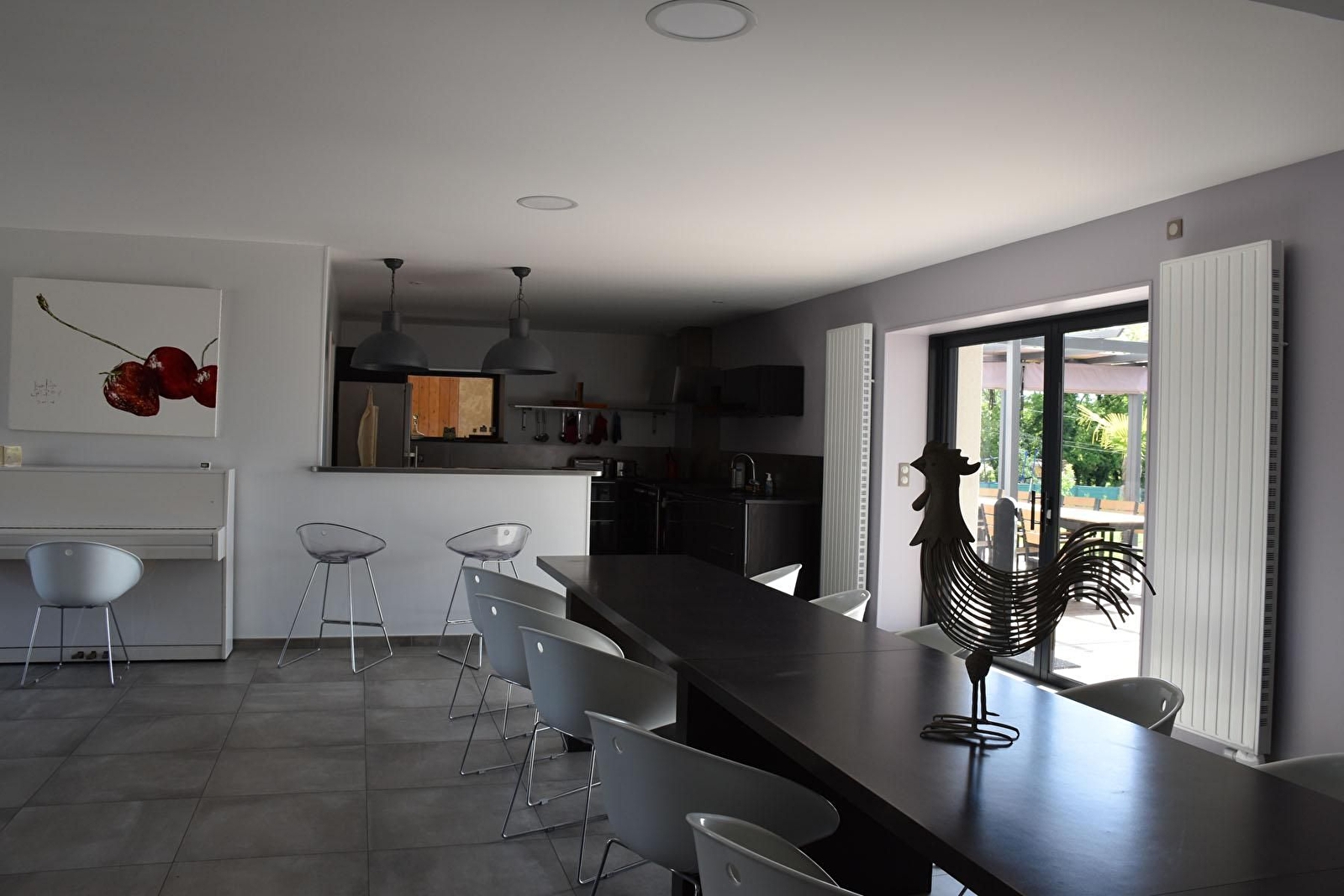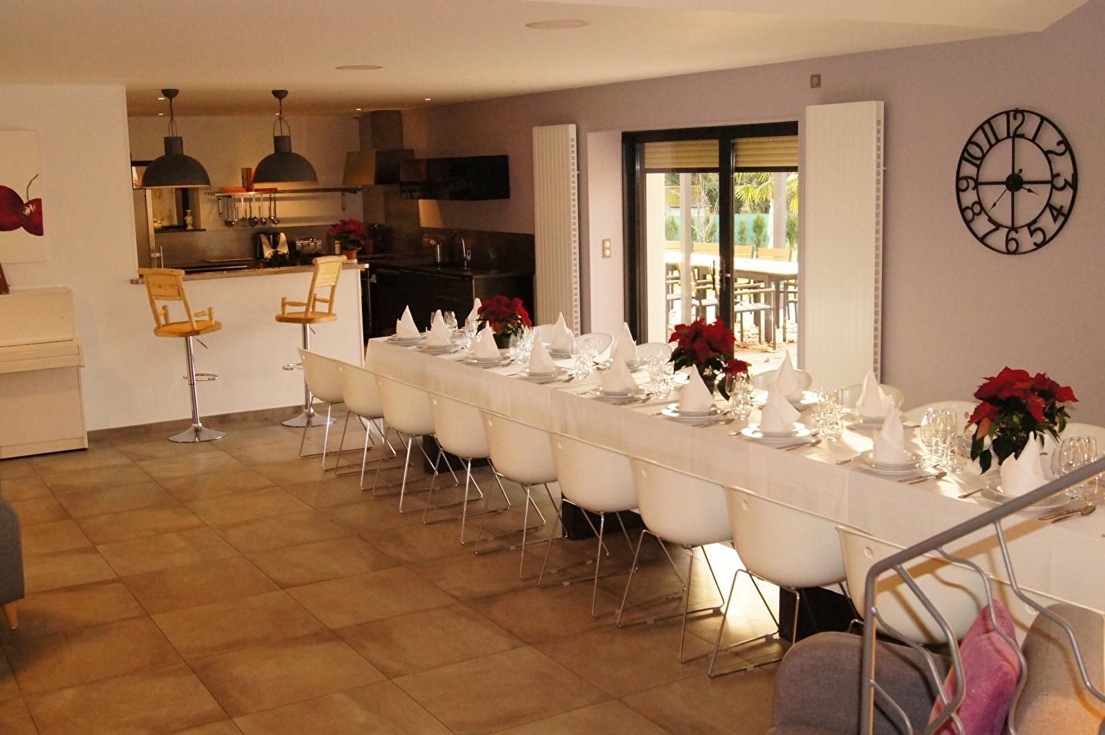Grande maison indépendante entièrement rénovée, dans un esprit zen et contemporain. Rez-de-chaussée : belle salle à manger avec cuisine intégrée ouverte et donnant sur la terrasse et le jardin, salon, WC indépendant. Piano accordé. 1er étage : 2 chambres avec 1 lit 160, salle d'eau et WC. 2ème étage : 1 chambre avec 1 lit 160, salle d'eau et WC. 1 chambre avec 2 lits 90x200, salle d'eau et WC. Un second escalier permet d'accéder au 1er étage côté longère : 2 chambres avec 1 lit 180, salle d'eau et WC, 1 chambre avec 3 lits 90x200. Superbe piscine intérieure chauffée à 28° de 4,5 mètres par 6 mètres. Grande terrasse et parking. Terrain clos de 2000 m². Abri couvert avec table de ping pong et baby-foot. 10 vélos à disposition. Pour bébé, lit pliant, chaise haute, matelas à langer et baignoire. Un seul animal admis ( 25 €/jour)