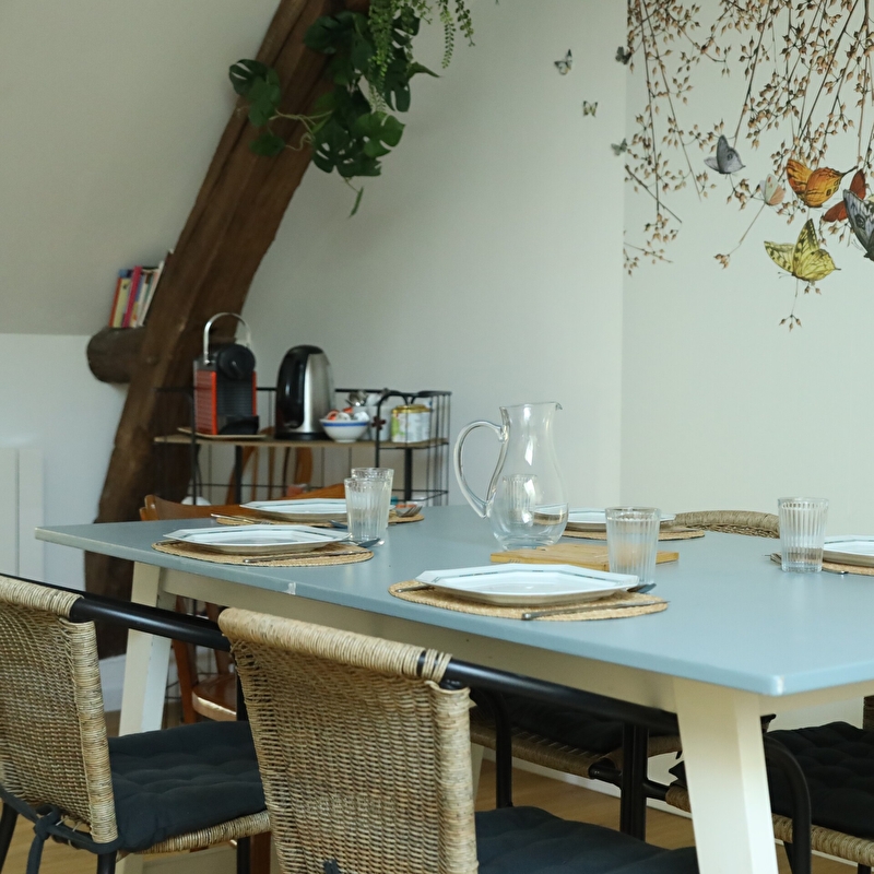 Pour le déjeuner/dîner se trouve une table et des chaises pour 7 personnes accompagné de la danse des papillons du papier peint.