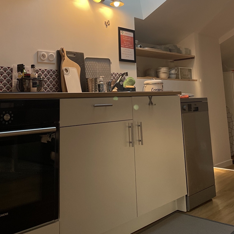 La cuisine ouverte sur le salon est équipée d’un évier, un four électrique et d’une plaque de cuisson à induction, d’un frigo avec freezeur et d’un lave-vaisselle.