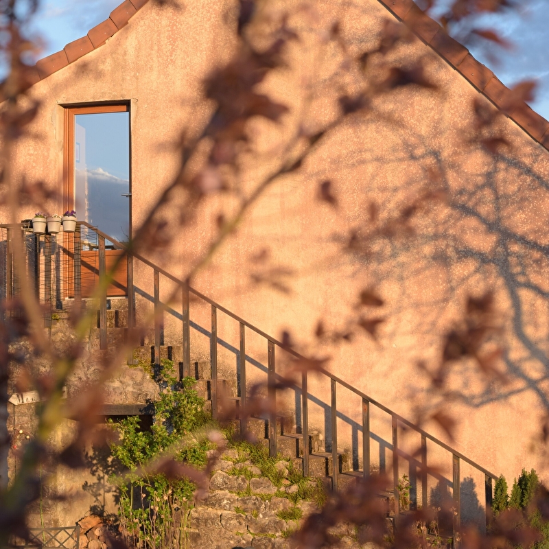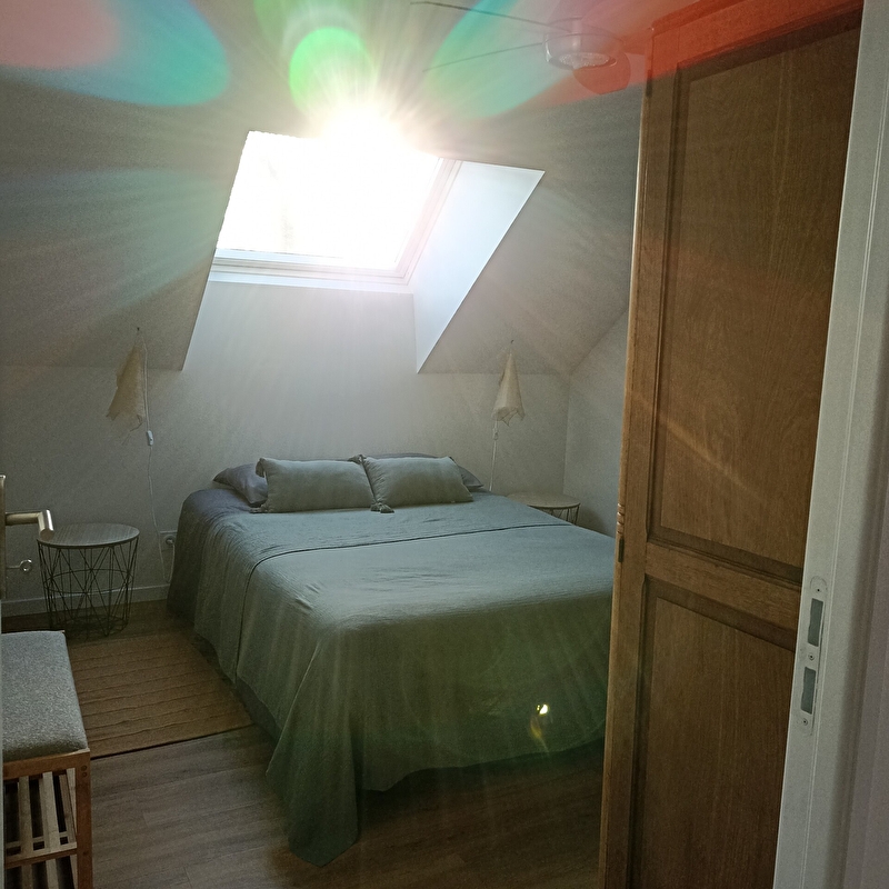 Il est situé au niveau supérieur de la maison, anciennement la grange à foin qui vient d’être entièrement rénovée. On y accède par un escalier extérieur en pierre, indépendant.