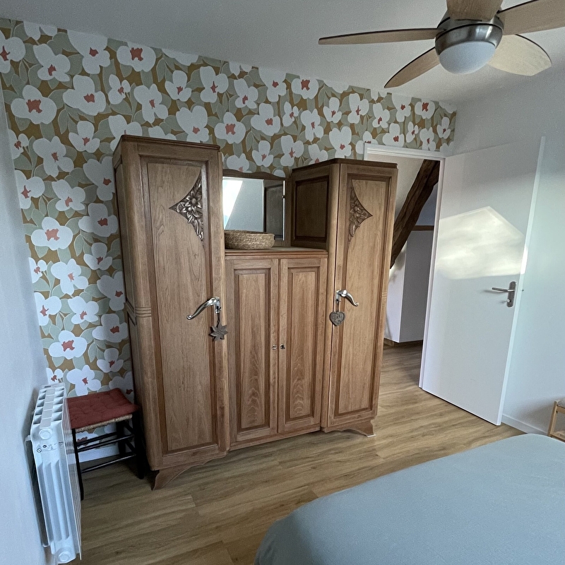 Elle comprend un lit de 140 x 200 cm (matelas et sommier neufs de fabrication française), une armoire Art déco avec ses deux penderies et cintres en bois et son miroir intégré.