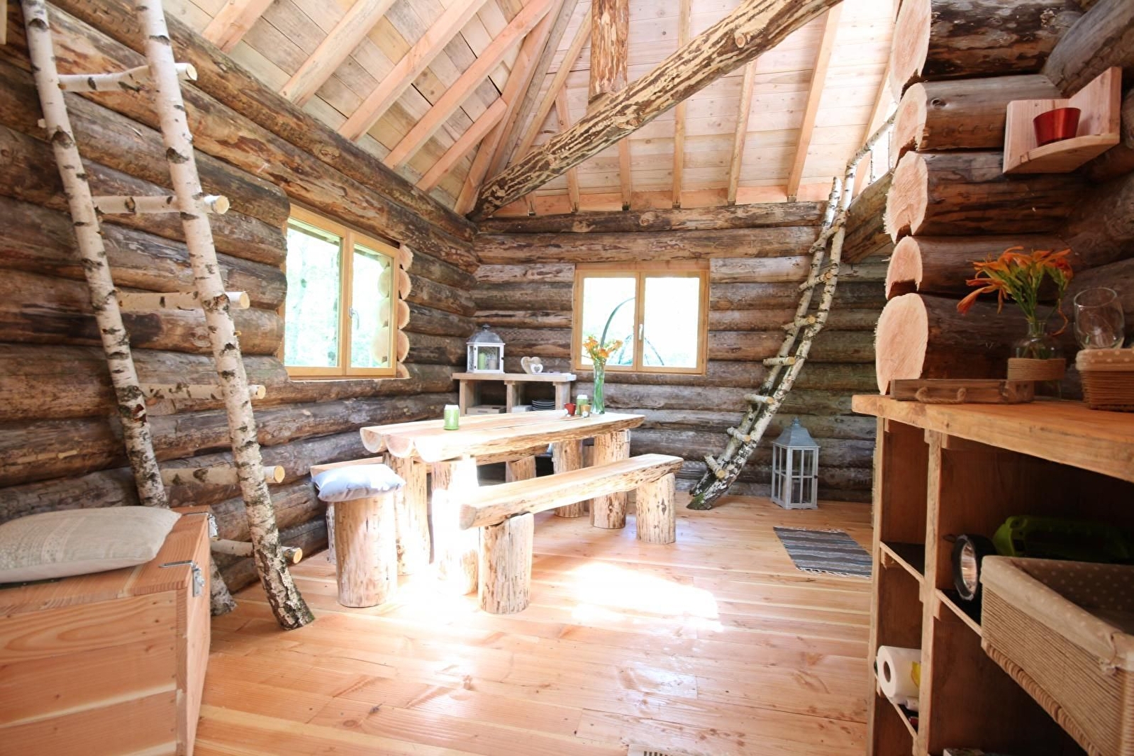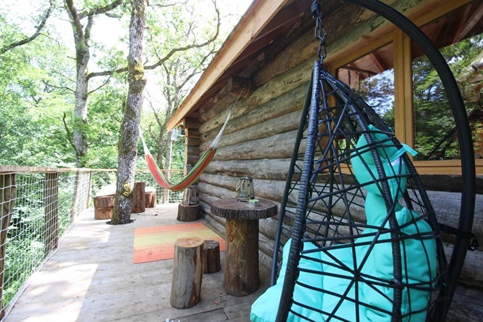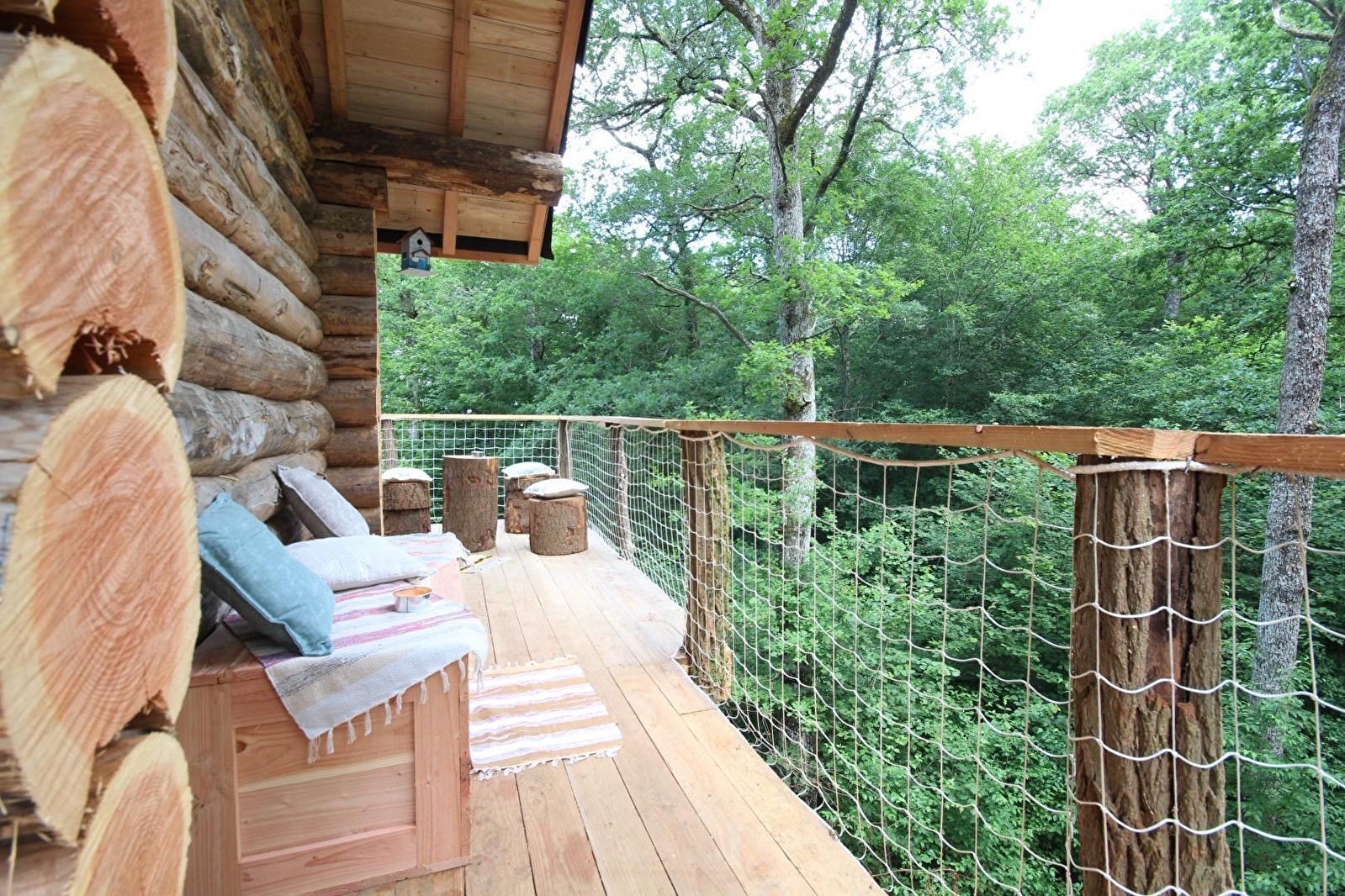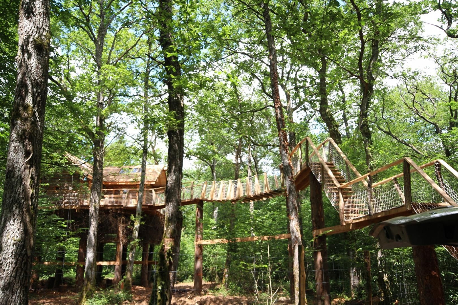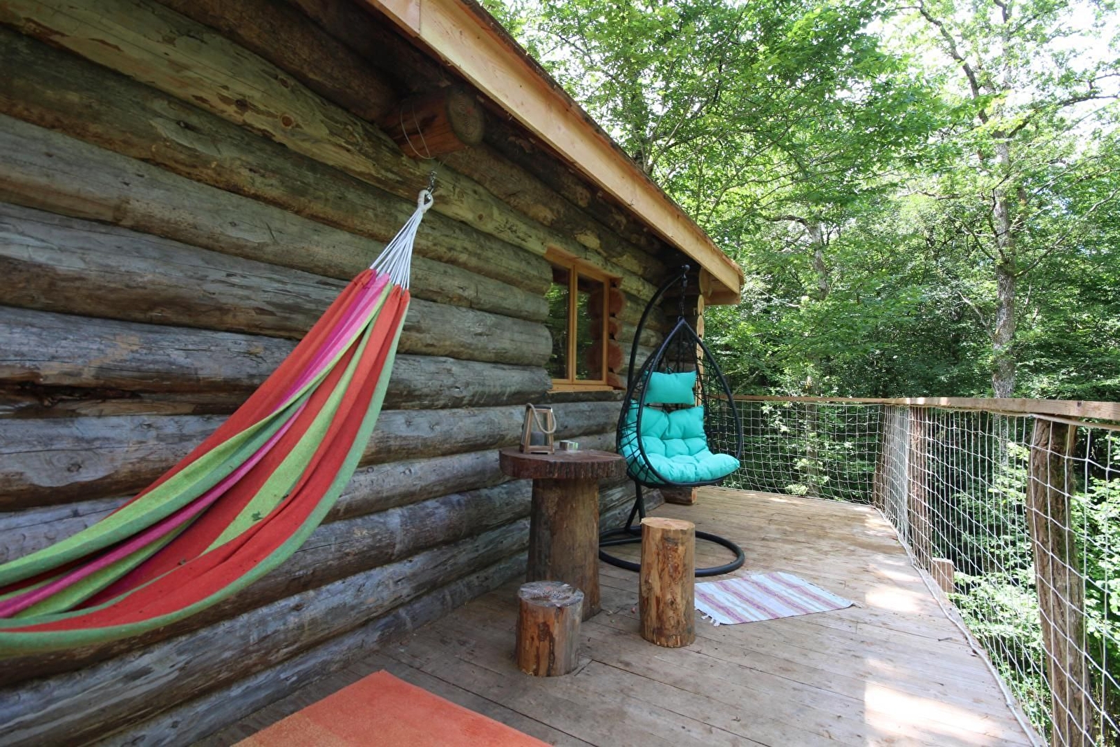 Empruntez la passerelle et le pont suspendu pour découvrir le Nid Douillet, une cabane de 28 m² tout en rondins, perchée à 6 m de hauteur sur une plate-forme de 90 m² en pleine forêt châtillonnaise.
