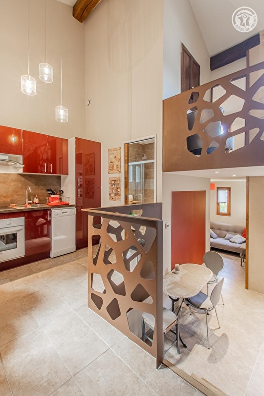 Composition : Maison de bourg mitoyenne jouxtant l'habitation des propriétaires (totale indépendance). Wifi. Chauffage électrique. Rdc (avec demi niveau) : séjour-cuisine, salon (canapé convertible 1 p. 110x190cm en appoint), salle d'eau (douche/Wc). 1er étage : chambre (lit 2 p. 160x200cm). Terrasse + jardinet privatifs (espace réservé côté jardin des propriétaires). Parking public gratuit à 300m. Commodités sur place.