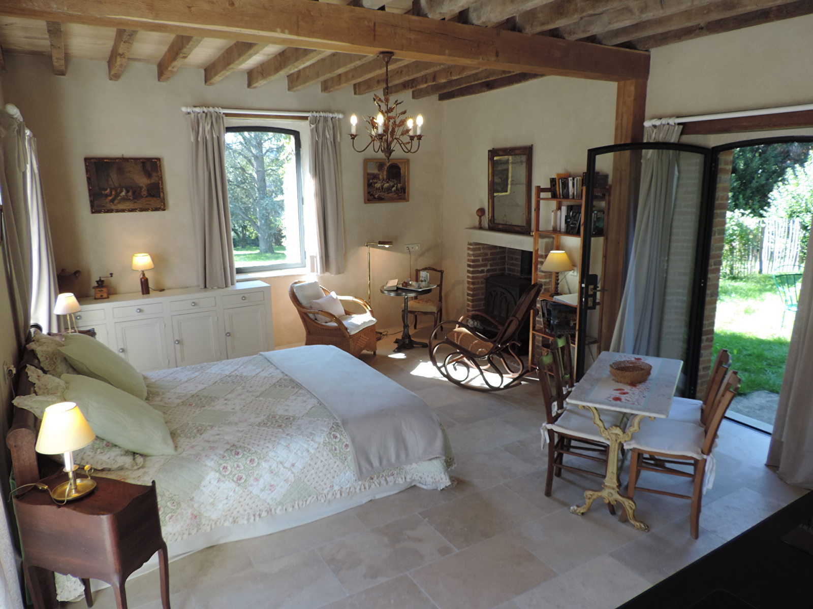Le côté chambre est douillet avec son lit de 160 cm et son boutis au charme d’antan.