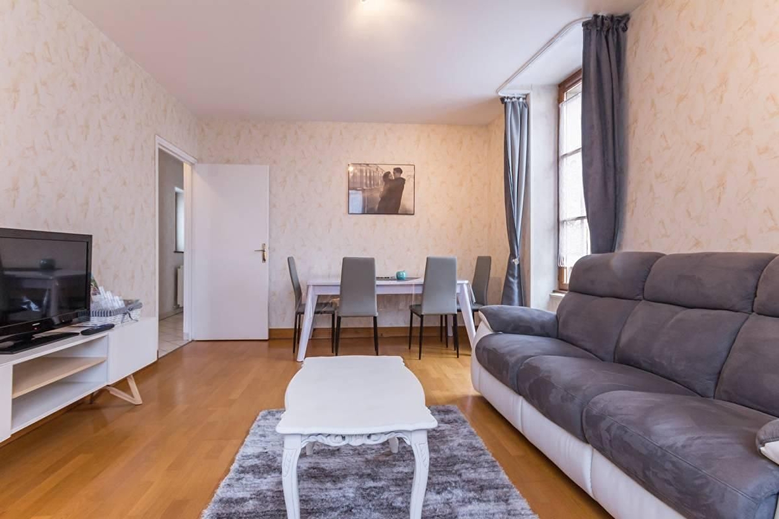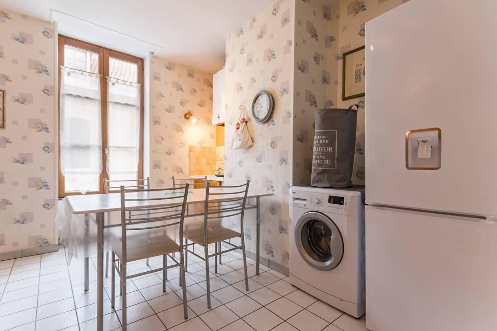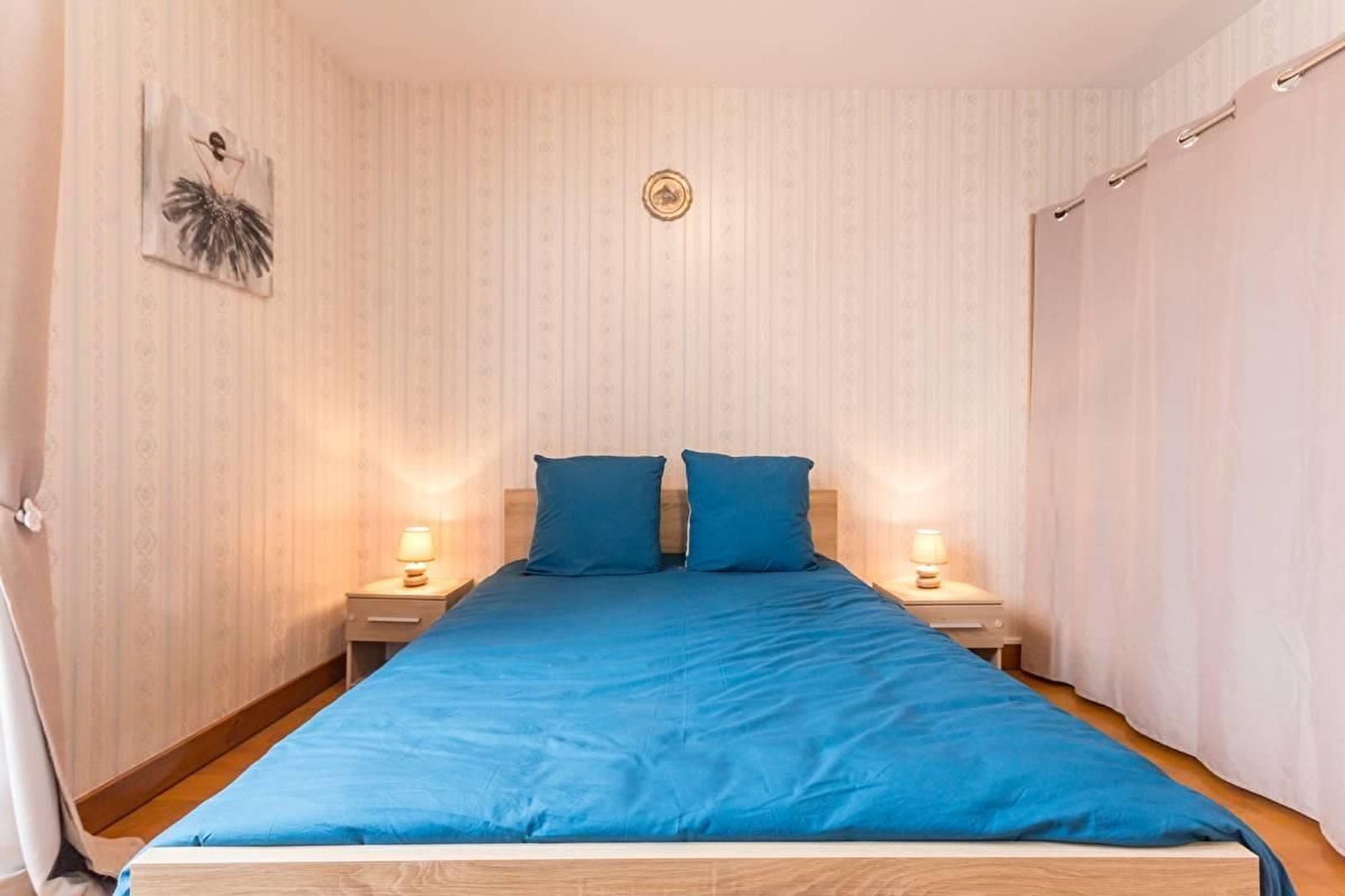 A 500m de la gare et des commerces, dans une rue à sens unique, venez séjourner dans un appartement avec son entrée indépendante et son garage attenant à partager. Au 1er étage : cuisine équipée, une pièce à vivre avec partie salle à manger et partie salon et bureau, 1 chambre avec 1 lit 140x190, et 1 chambre avec 2 lits 90x190 pouvant être jumelés en 1 lit 180x190, 1 salle d'eau avec douche et wc.