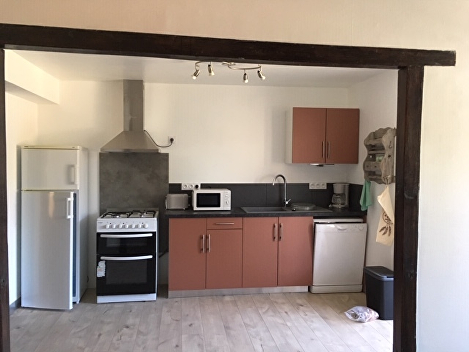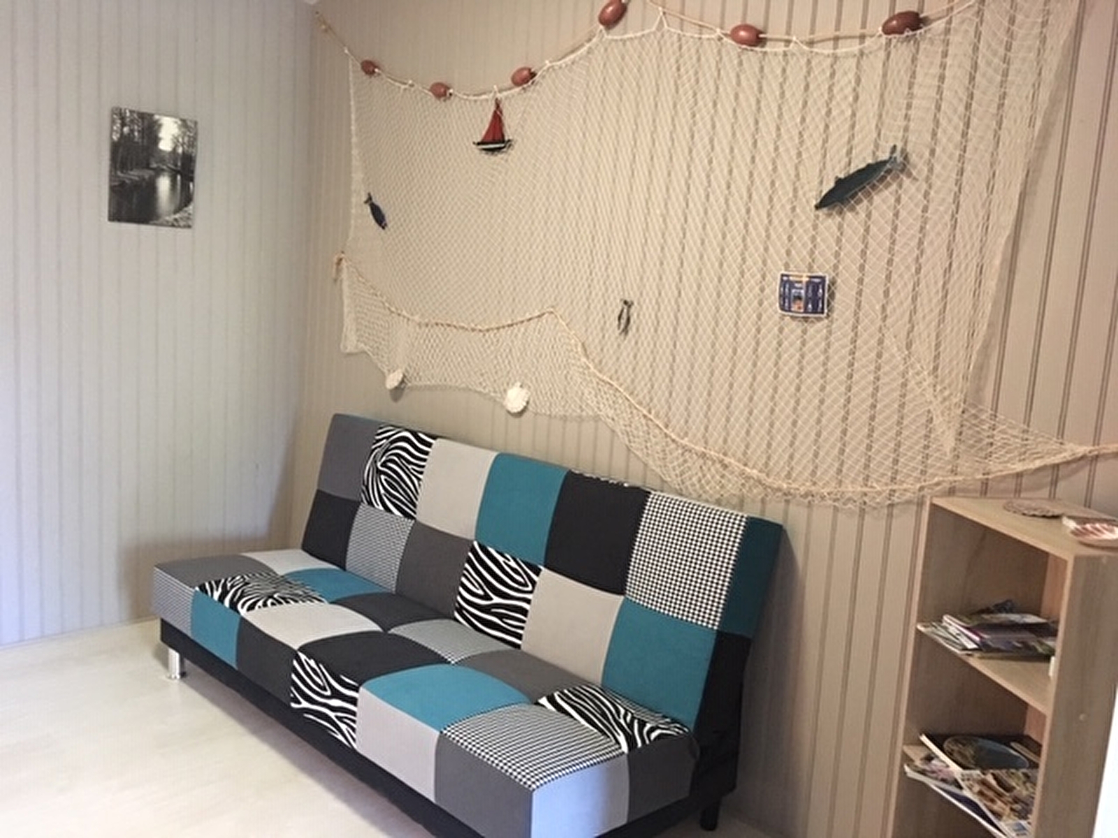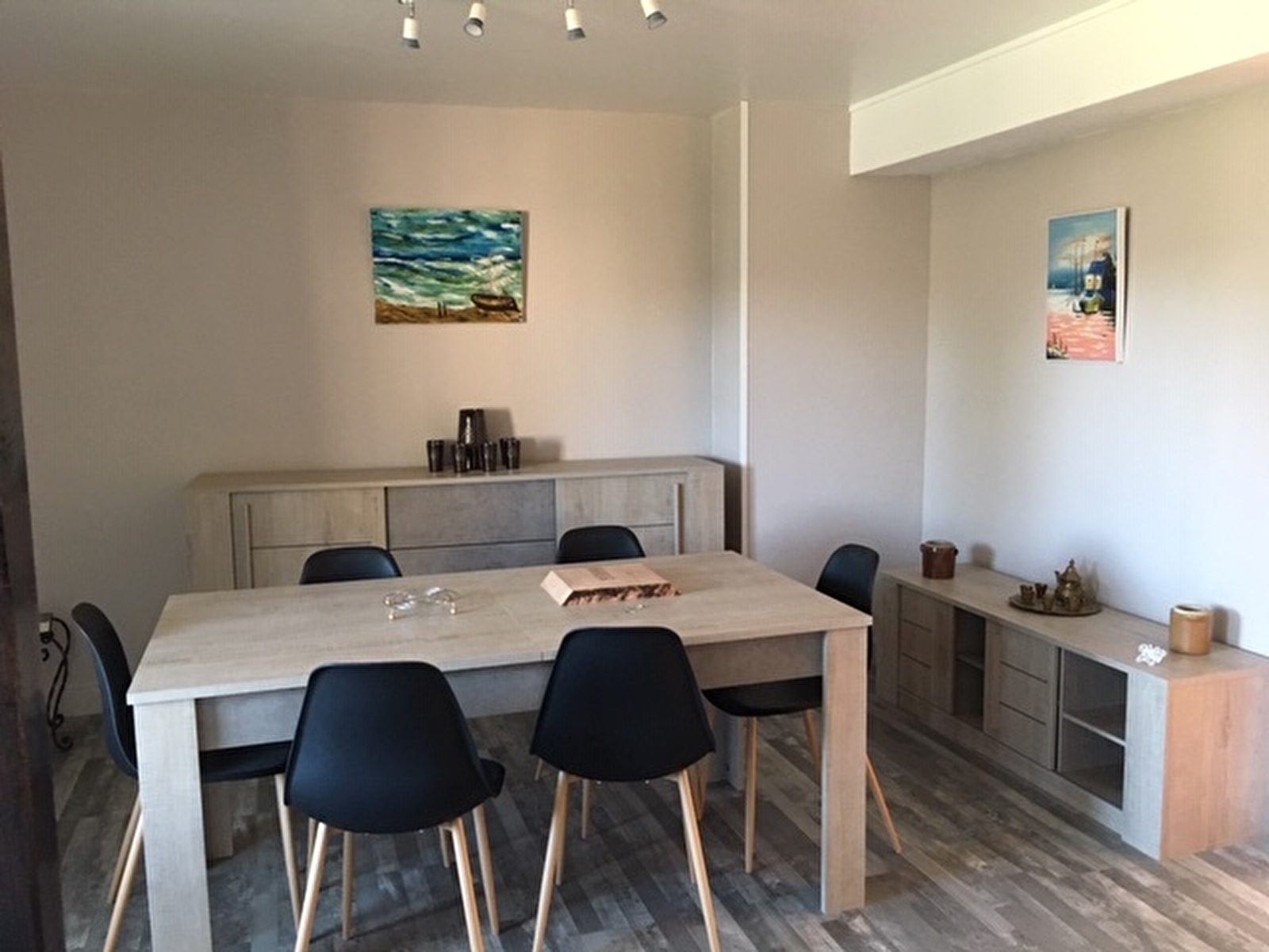 Cuisine équipée : four, réfrigérateur, micro-ondes, lave-vaisselle, cafetière, grille-pain, bouilloire), salle à manger, salon avec canapé convertible, télévision.